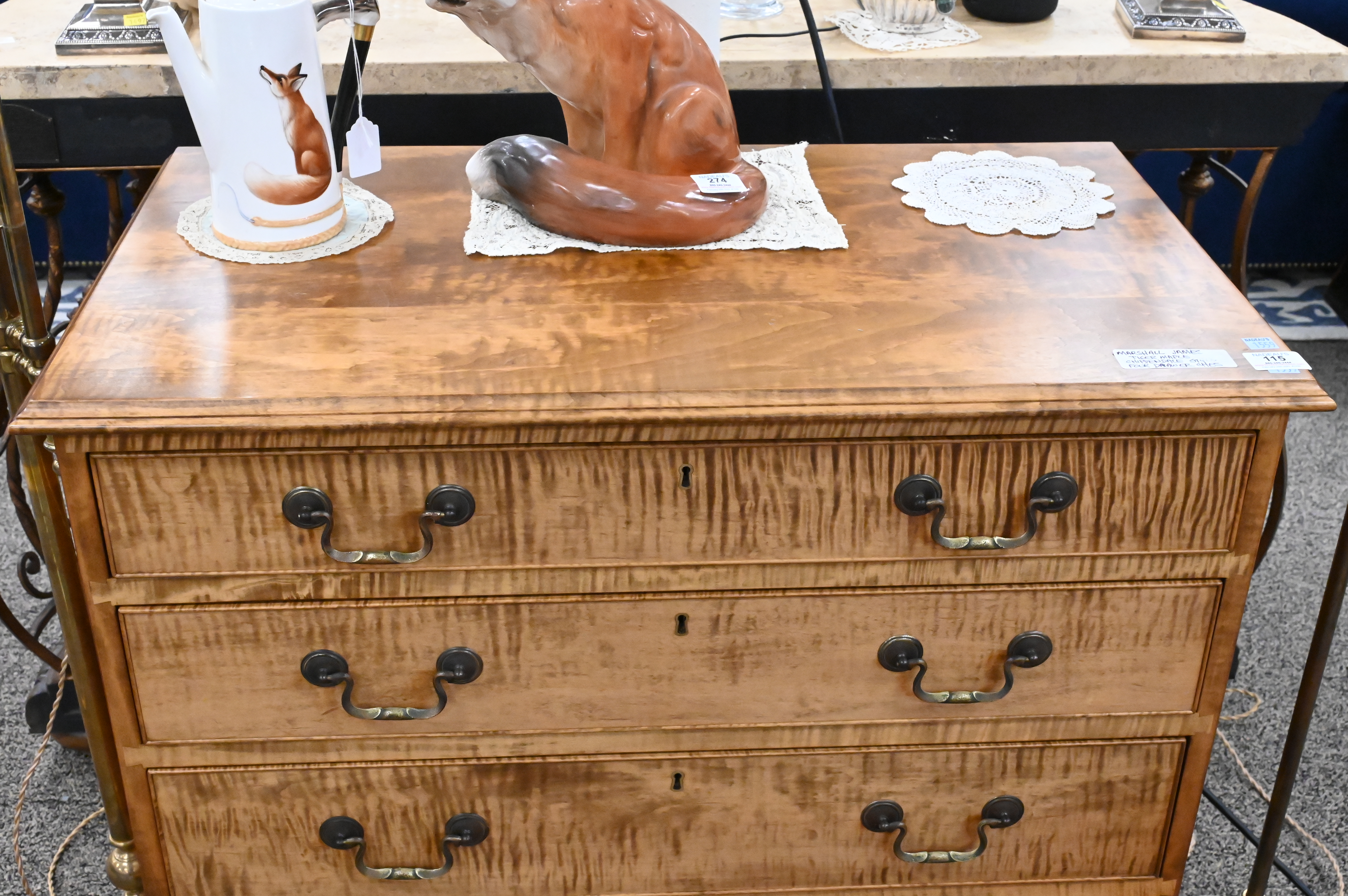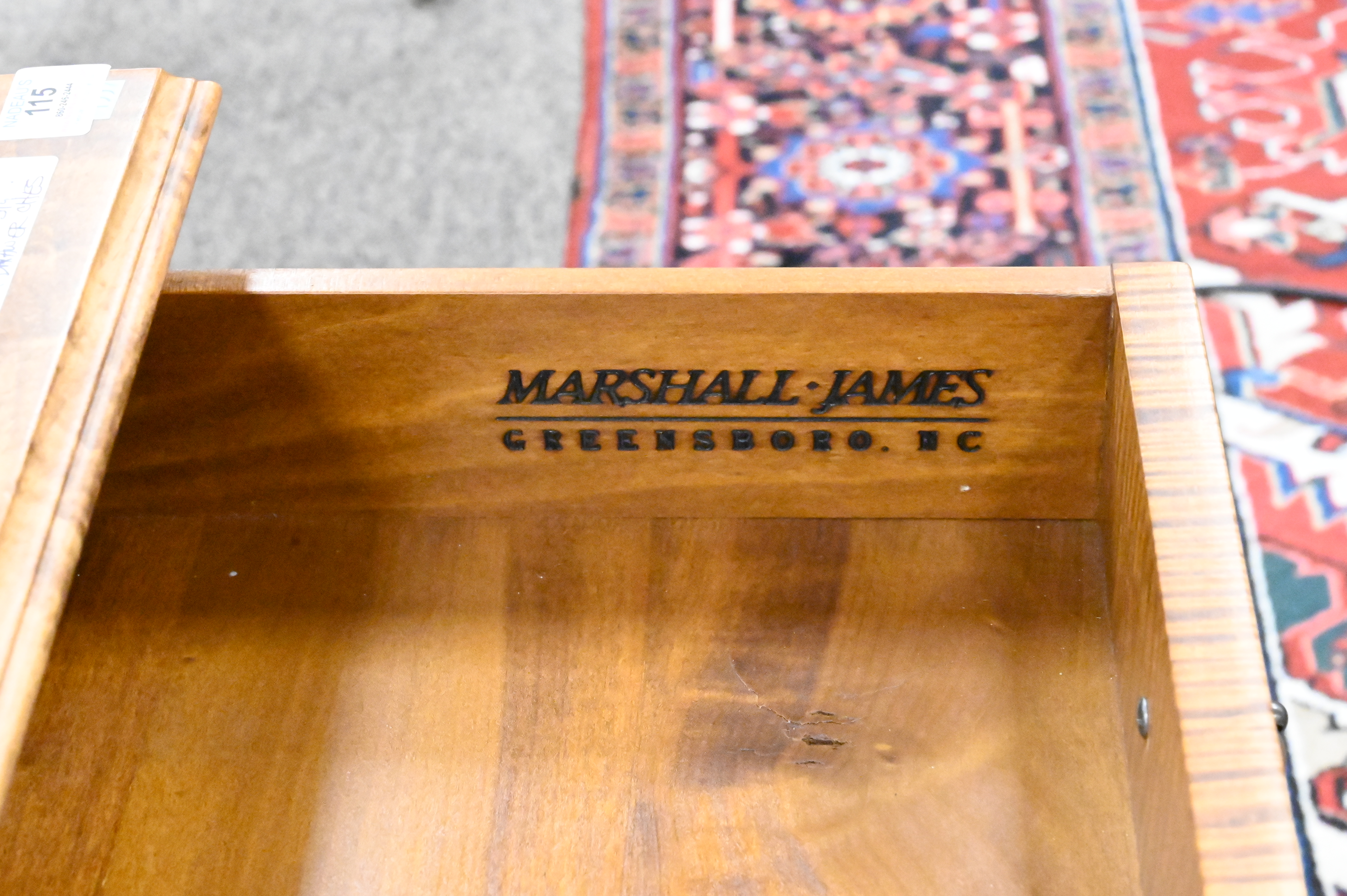 Marshall James Custom Tiger Maple Four Drawer Chest, on bracket feet, height 31 1/2 inches, top 18″ x 32″.
