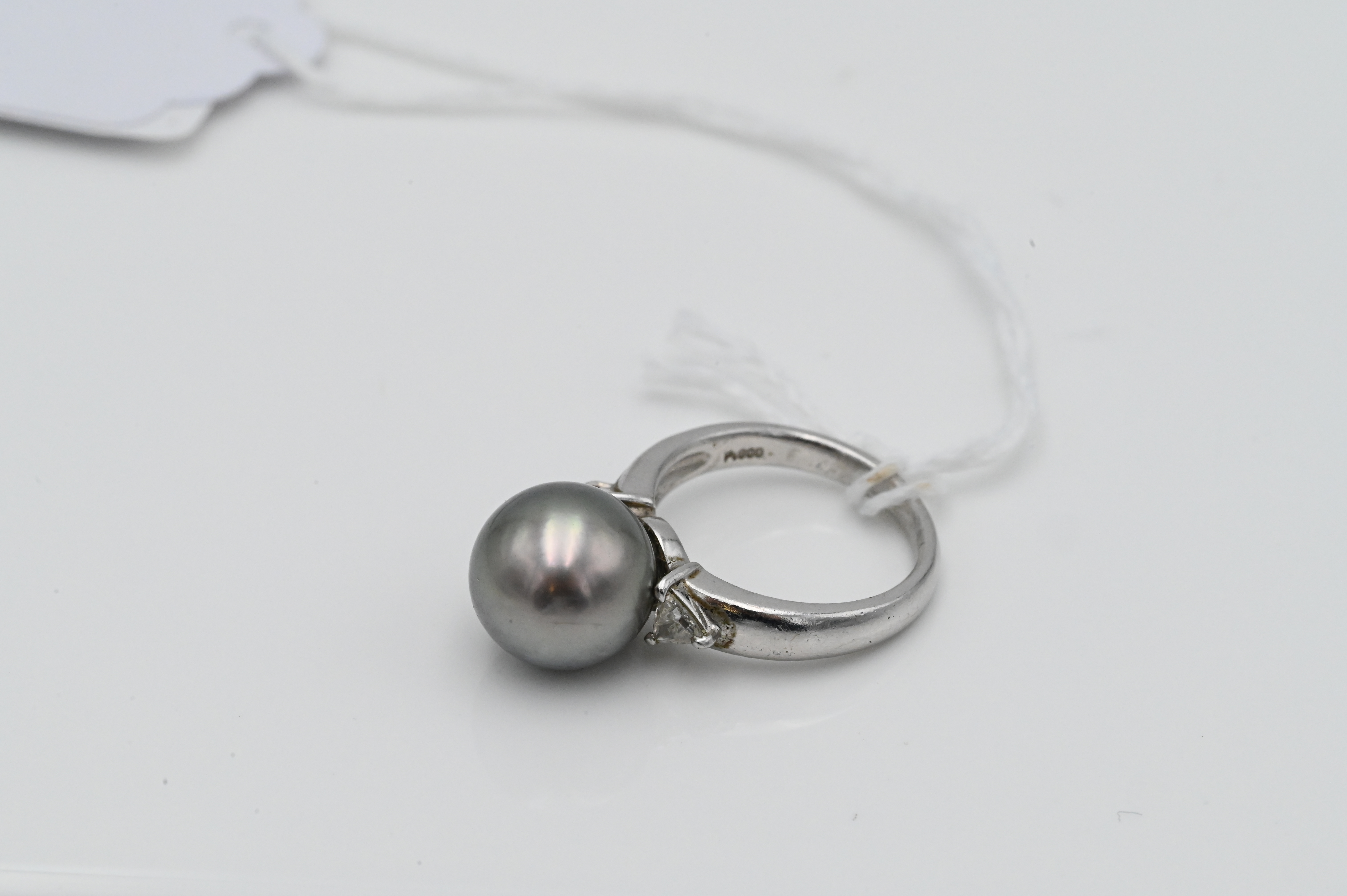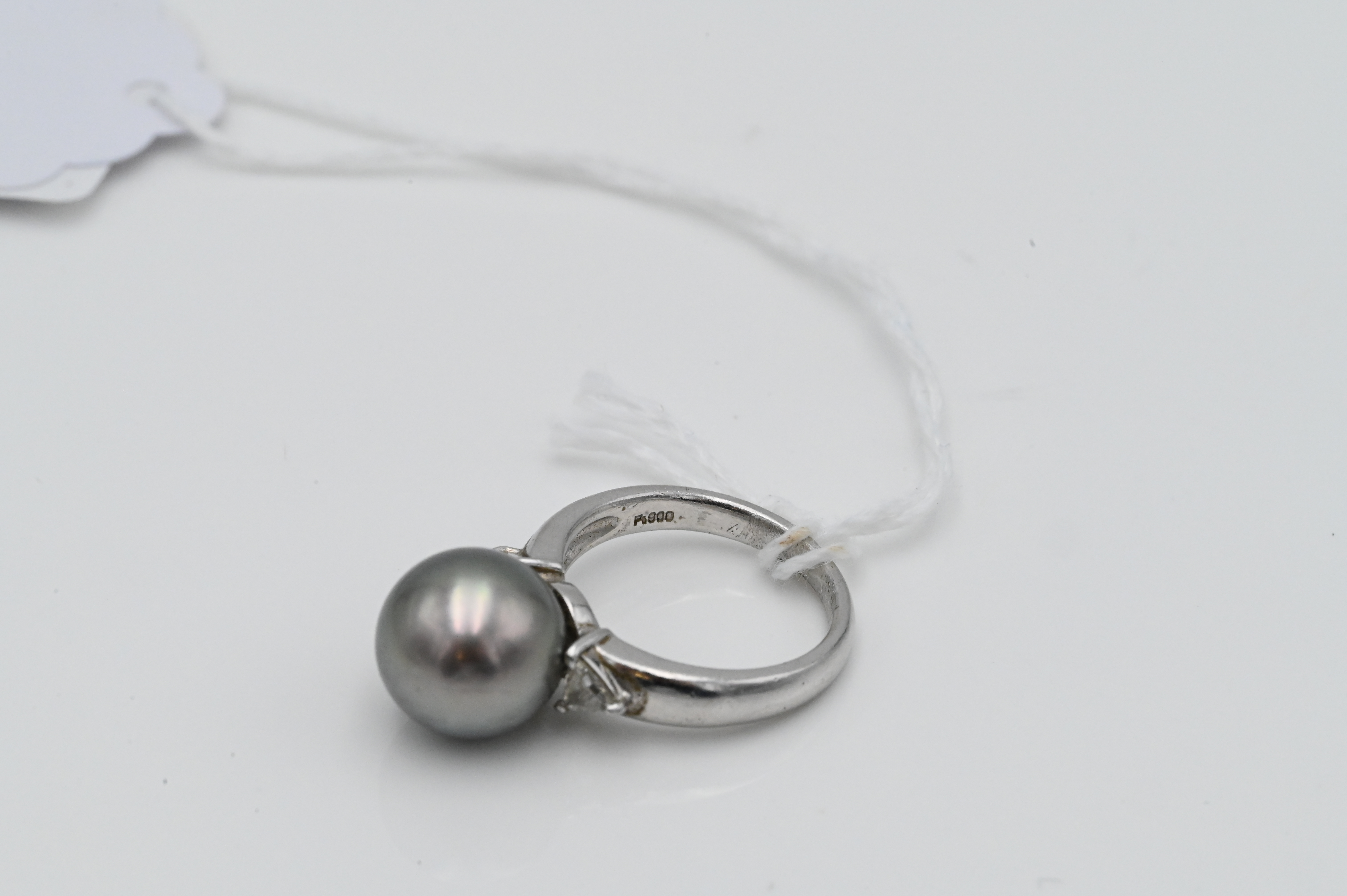 Platinum Ladies Ring, set with center grey pearl, flanked by trillion cut diamonds, size 5 3/4, 8.8 grams.