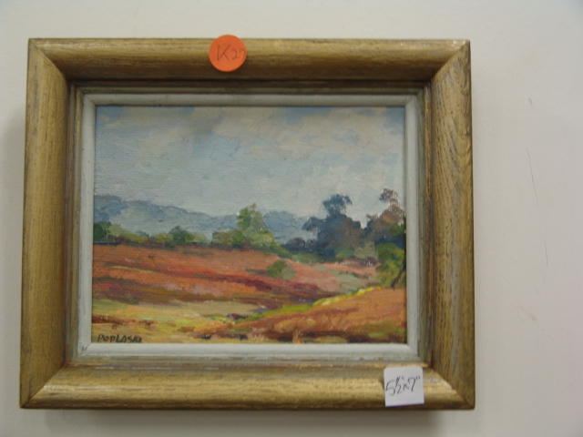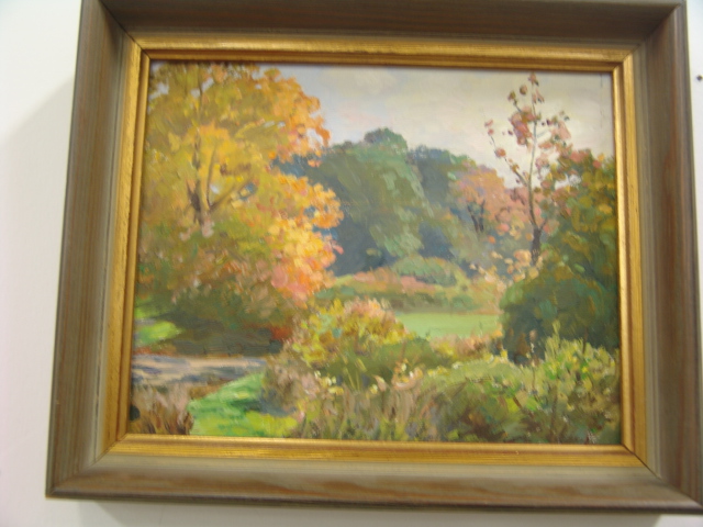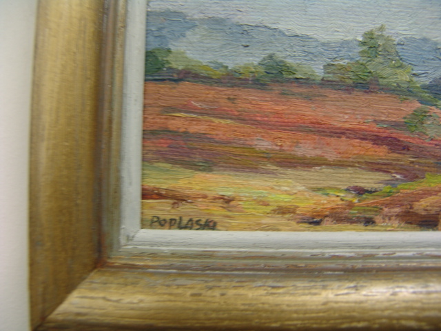Three paintings, Alex Poplaski 1906-1988 one small fall landscape and an unsigned still life of flowers early fall landscape and landscape signed lower left