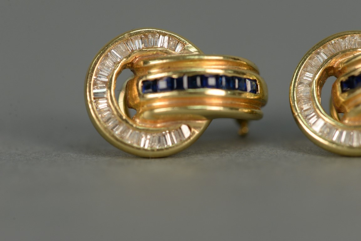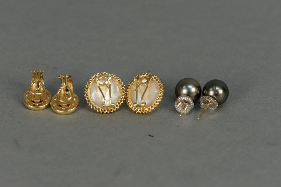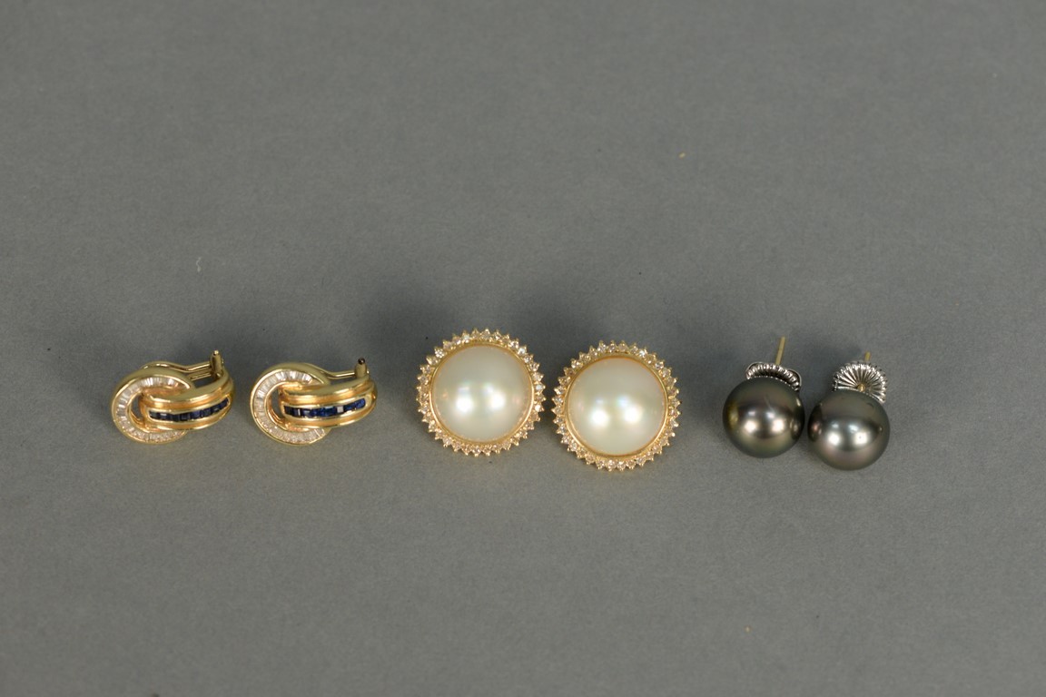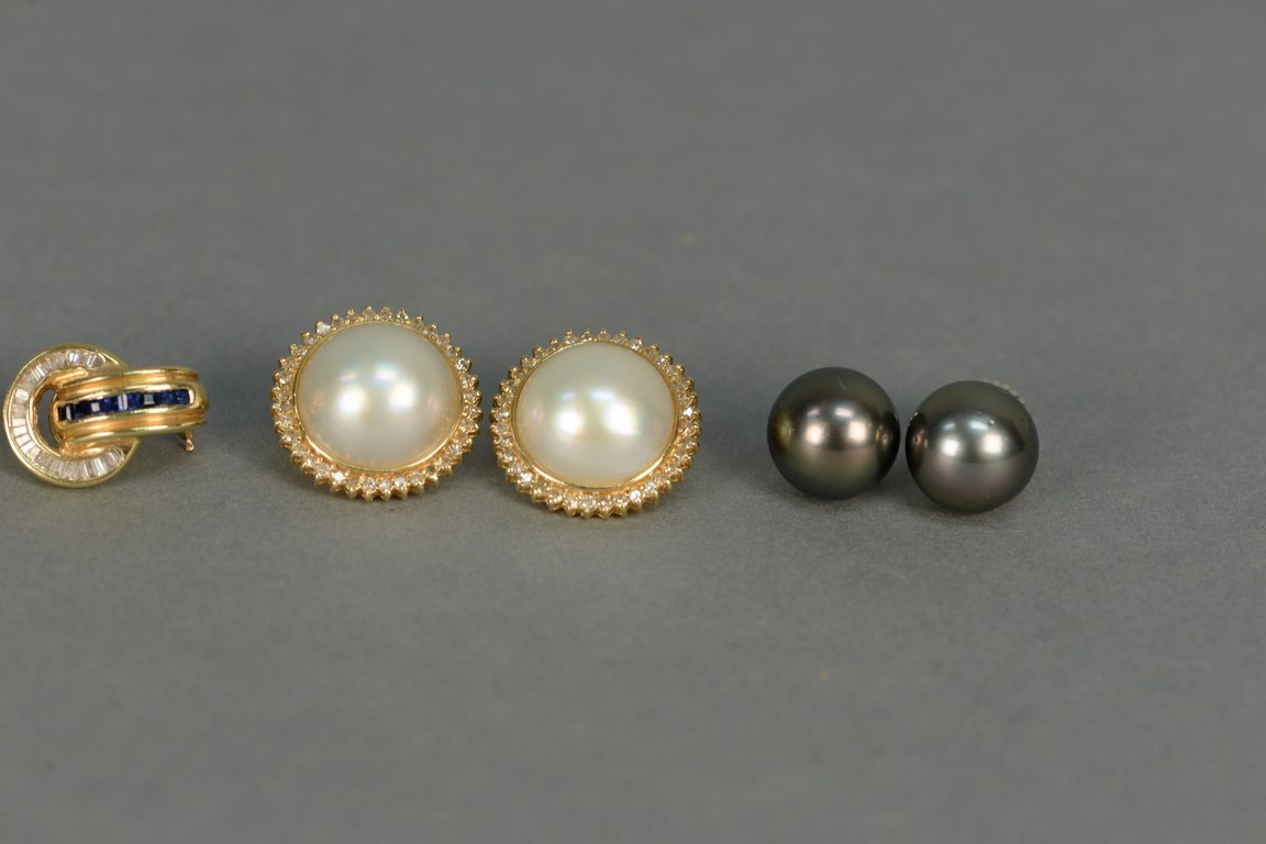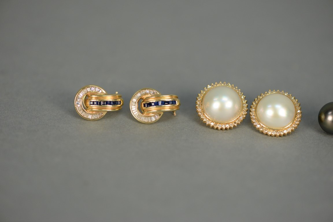 Lot 115: Three pairs of gold pierced earrings, one pair set with baguette diamonds and blue sapphires and two pairs of pearl earrings.