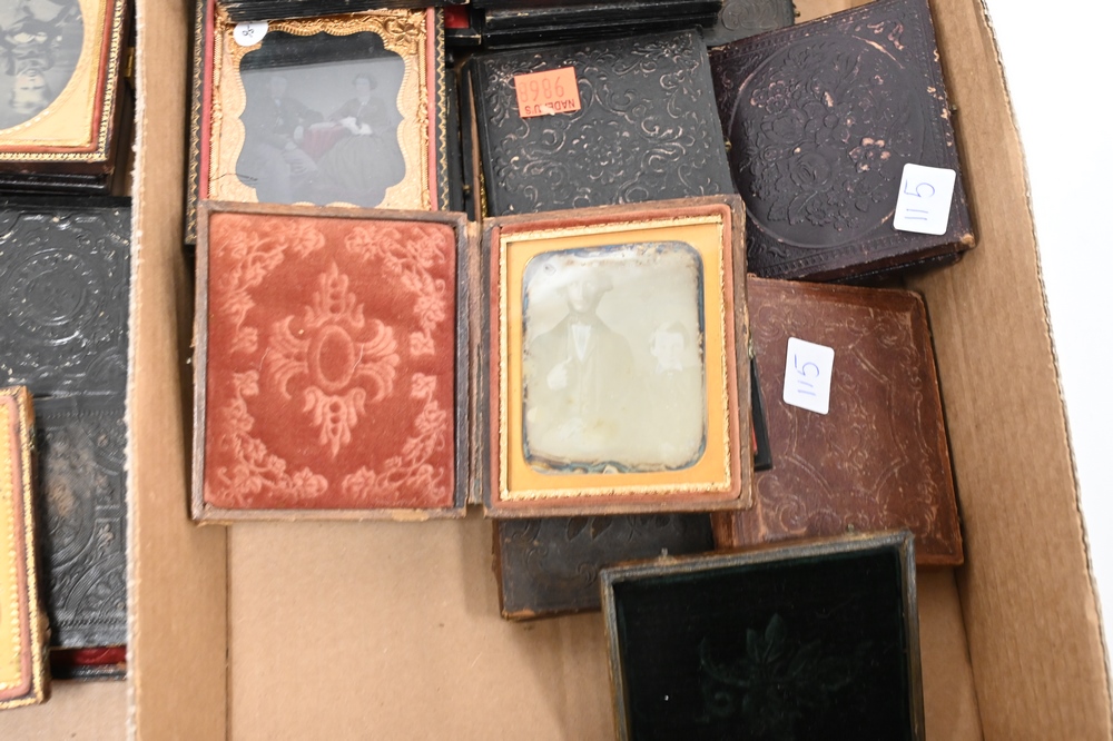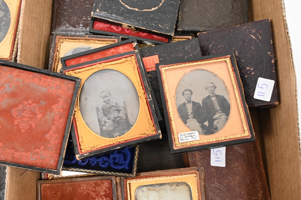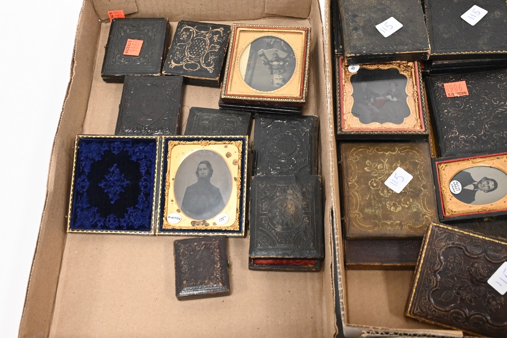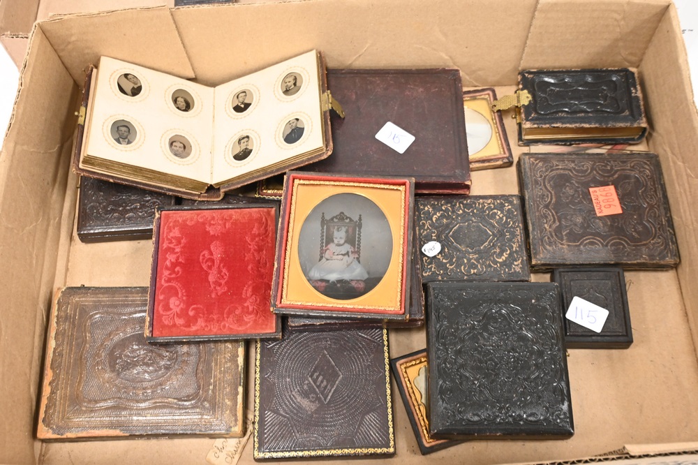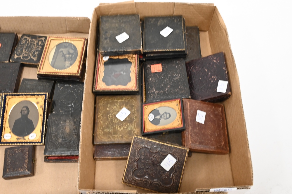 Lot 115: Three Tray Lots of Daguerreotype, Ambrotypes, and Tintypes, in leather cases.