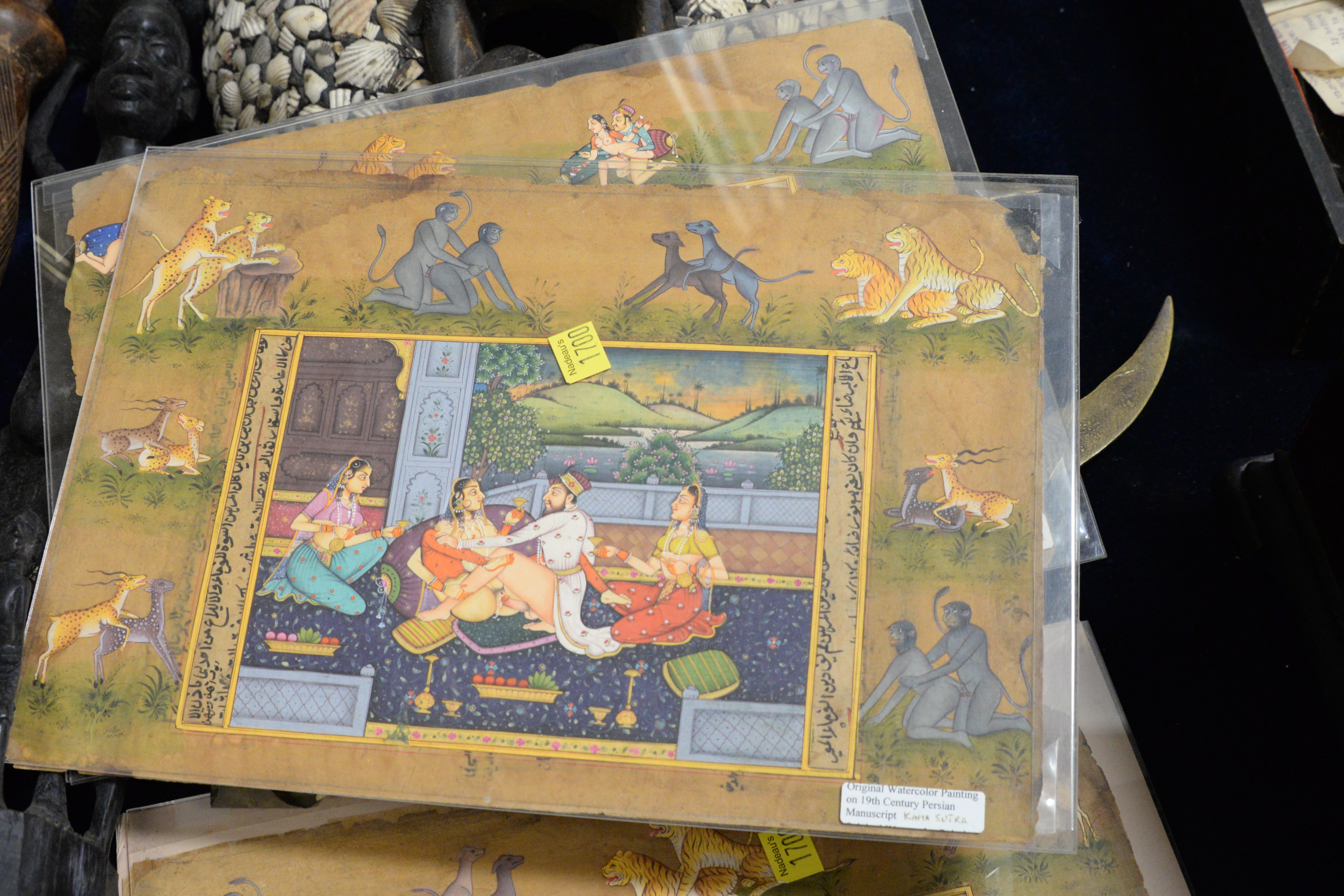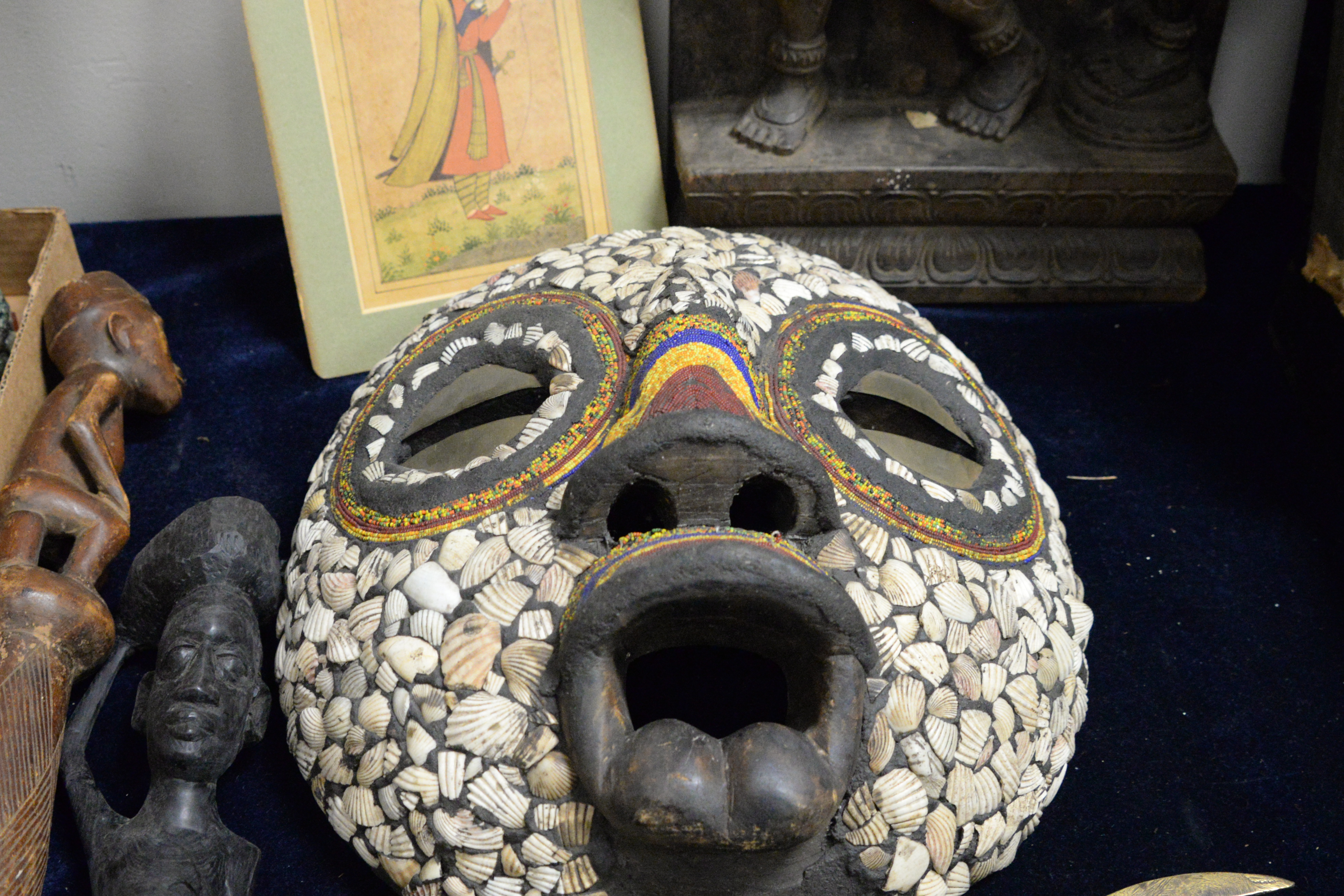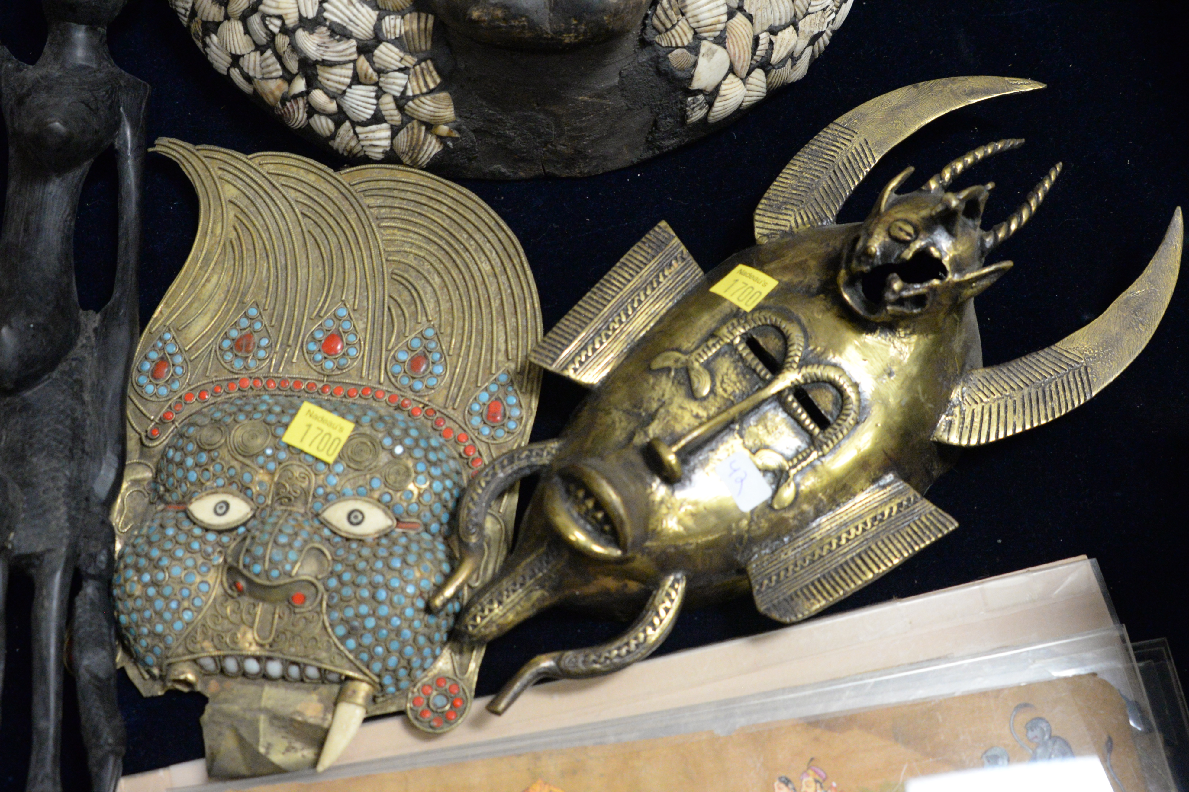 Tribal Tibetan/ African Lot, to include, two African tribal masks one having shell design the other being a horned brass mask, a Tibetan turquoise mask, three 19th century Indo-Persian Kamasutra watercolors, and two carved wood African figures, tallest 21 inches
