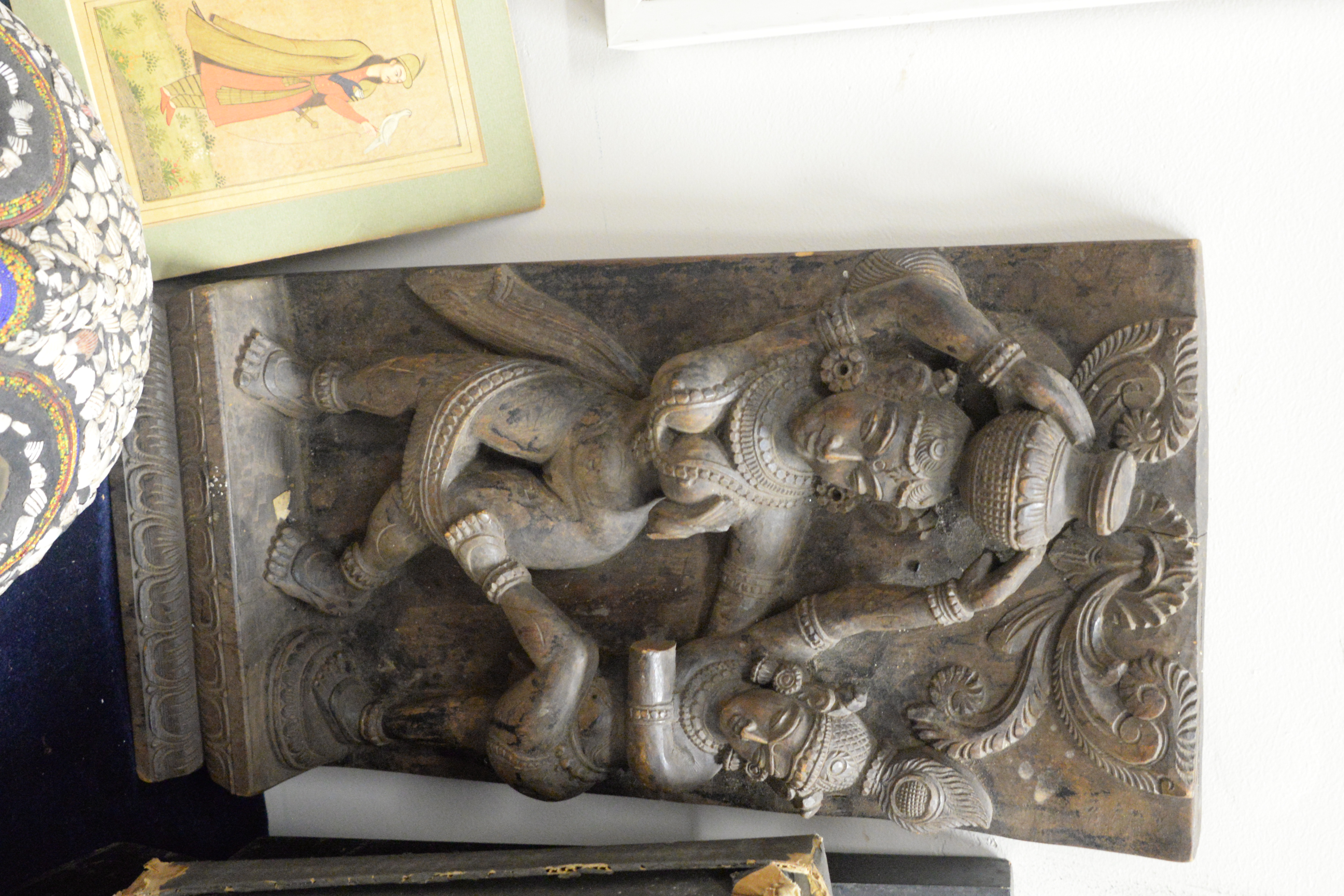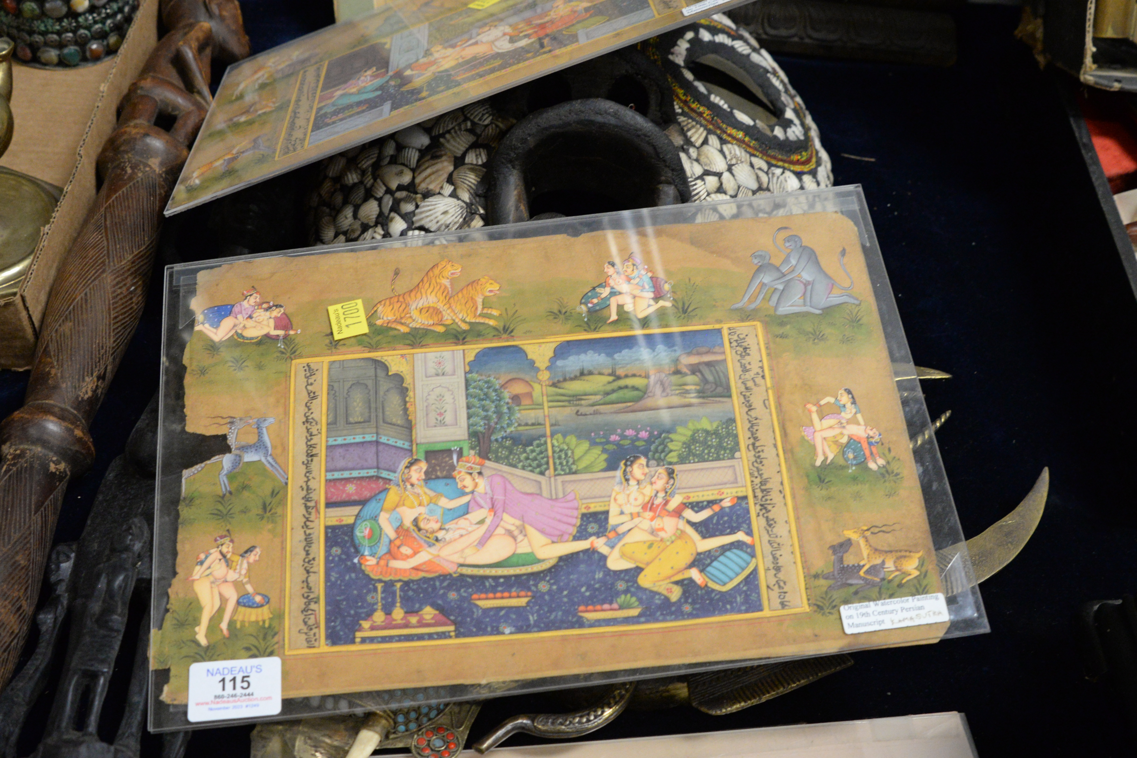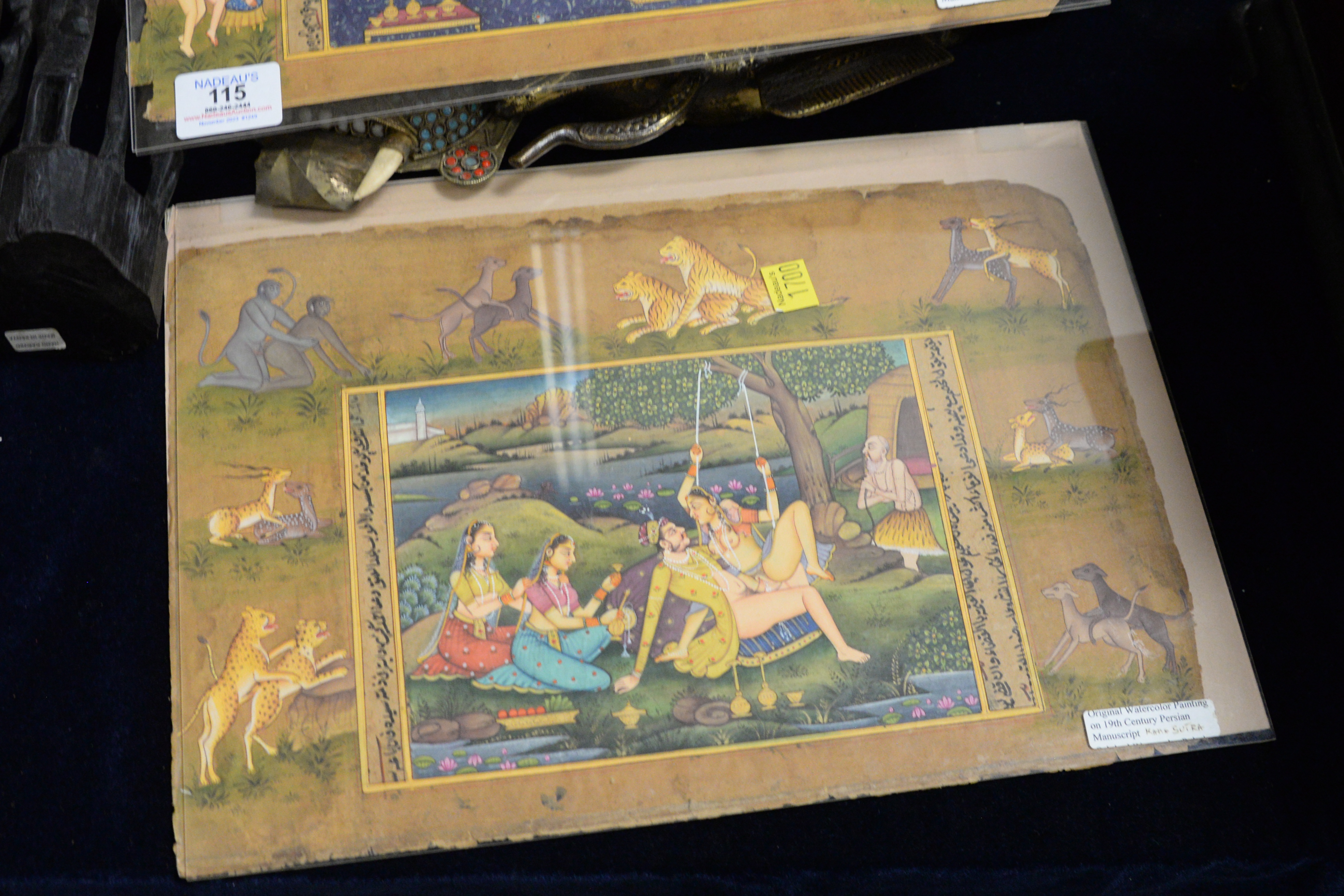 Tribal Tibetan/ African Lot, to include, two African tribal masks one having shell design the other being a horned brass mask, a Tibetan turquoise mask, three 19th century Indo-Persian Kamasutra watercolors, and two carved wood African figures, tallest 21 inches