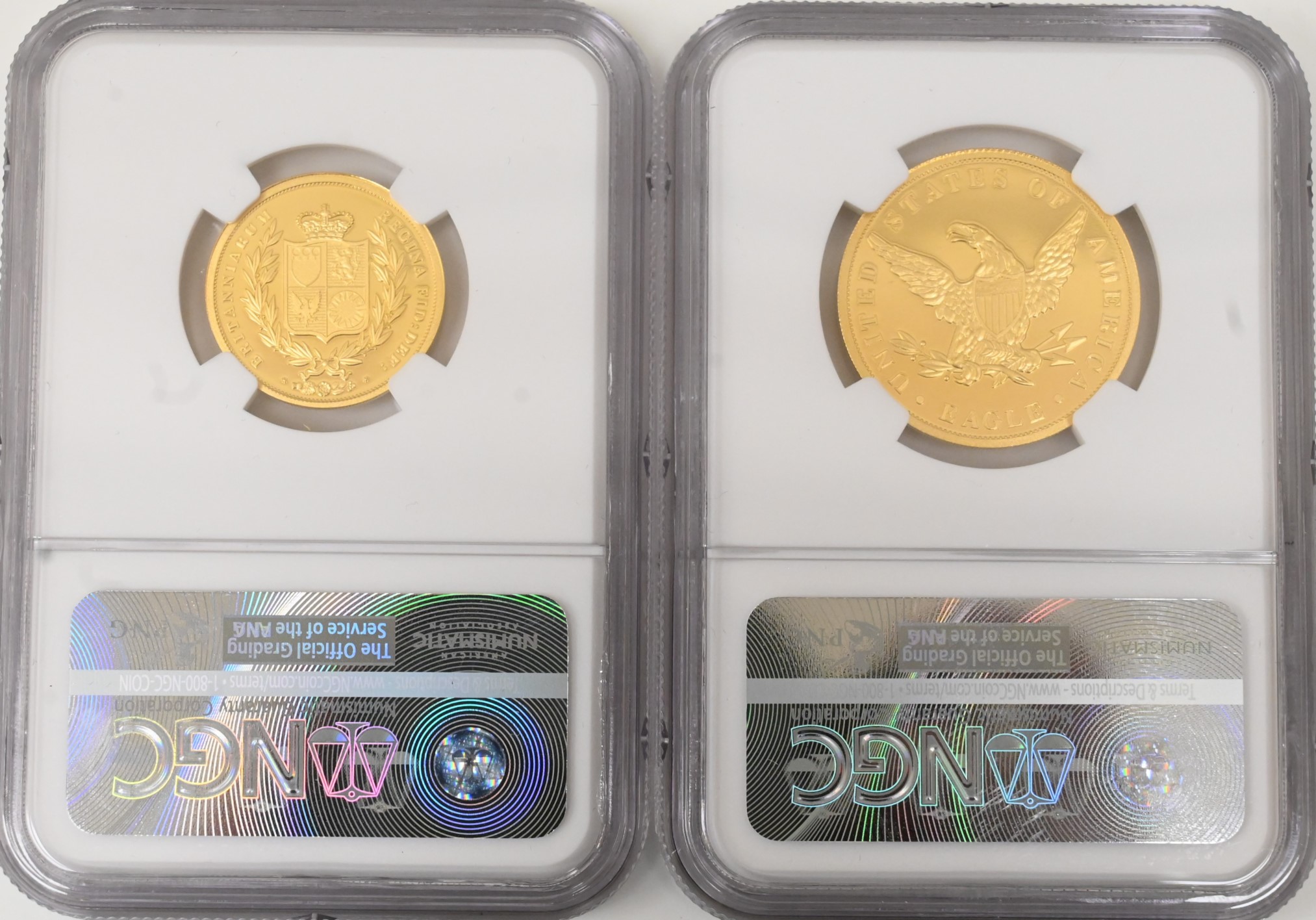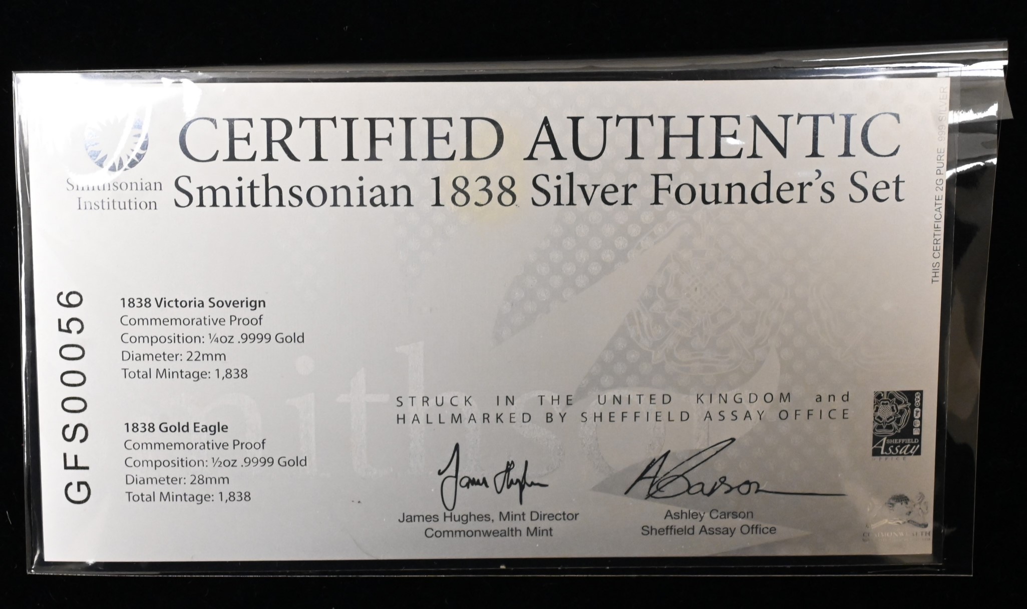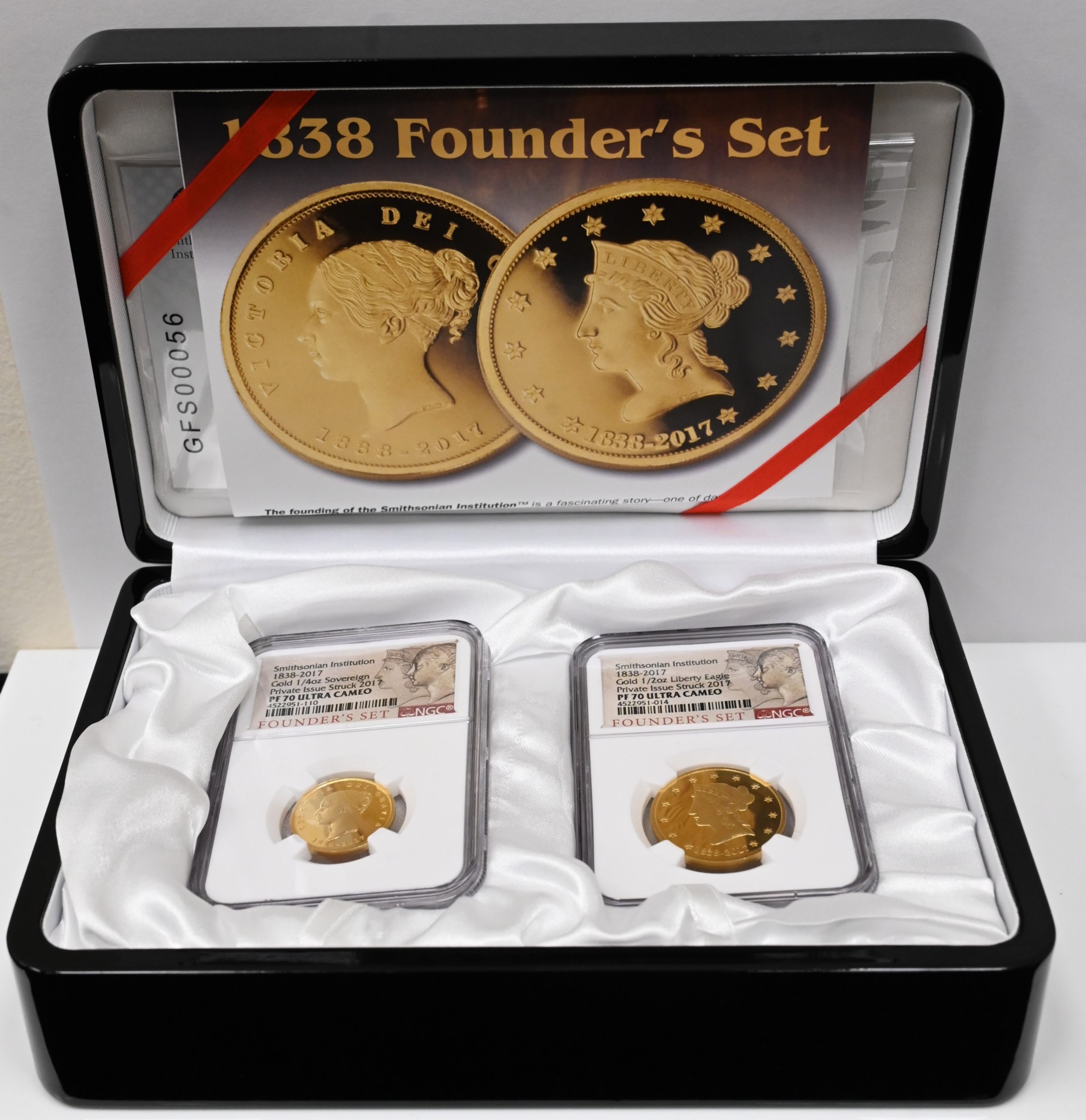 Two Coin Lot of 1838/2017 Founders Gold, ½ ounce Liberty Eagle and ¼ ounce Sovereign NCG proof 70 in a presentation box from Smithsonian.