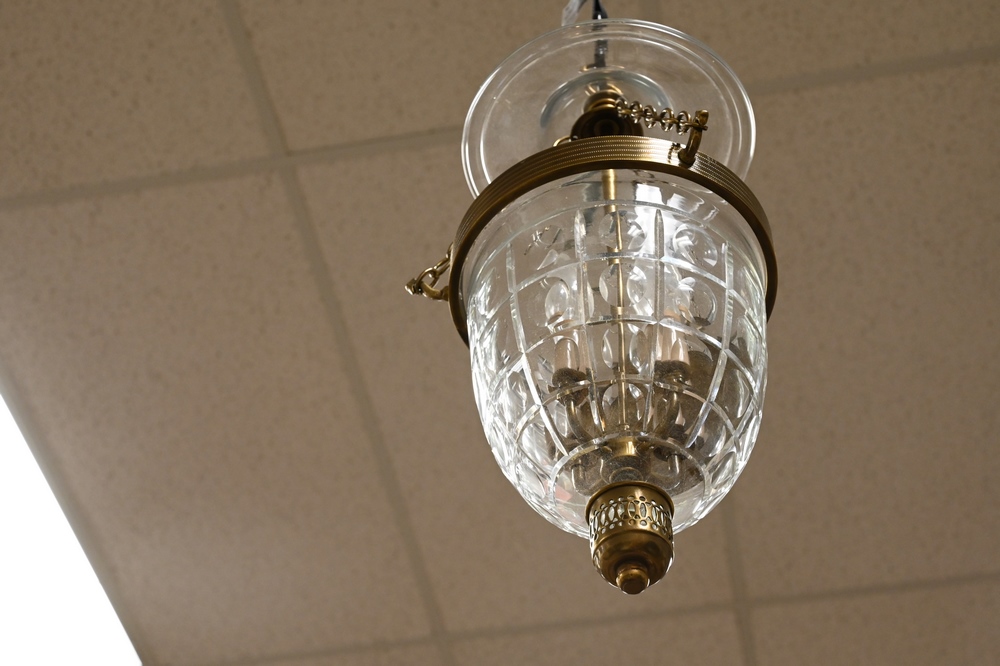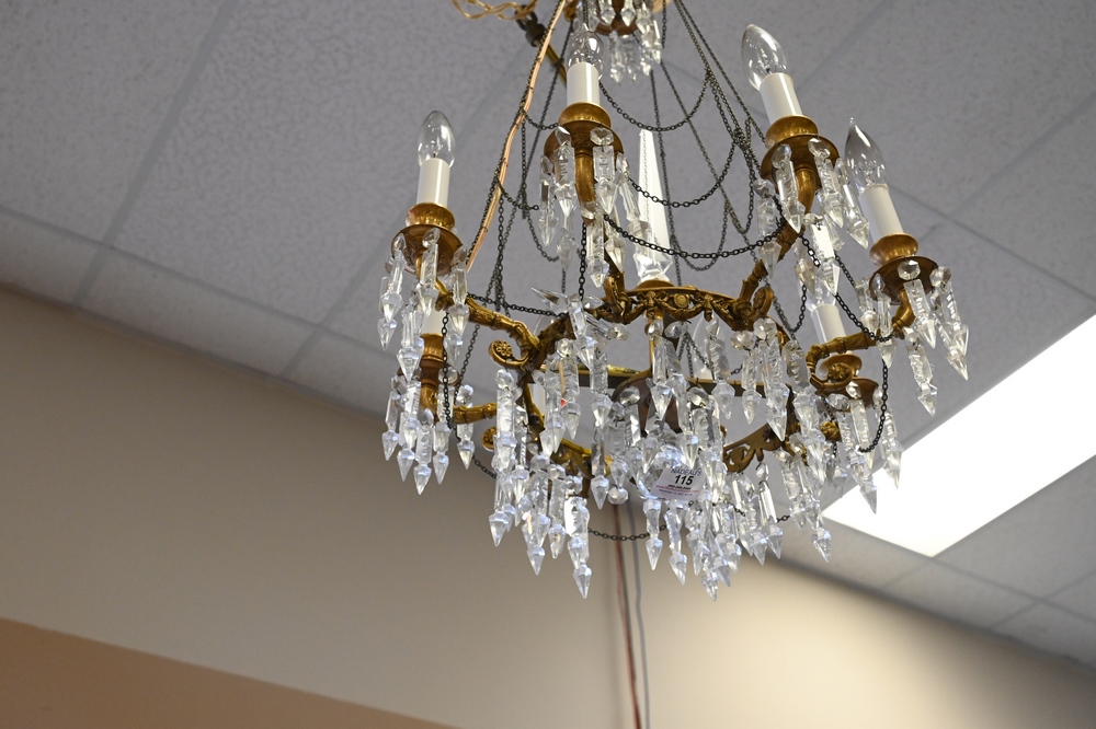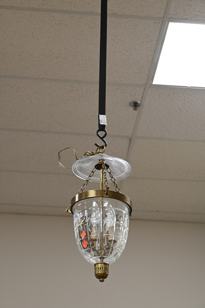 Lot 115: Two Hanging Lights, to include eight light bronze chandelier having prisms; along with a hall light having cut glass shade.