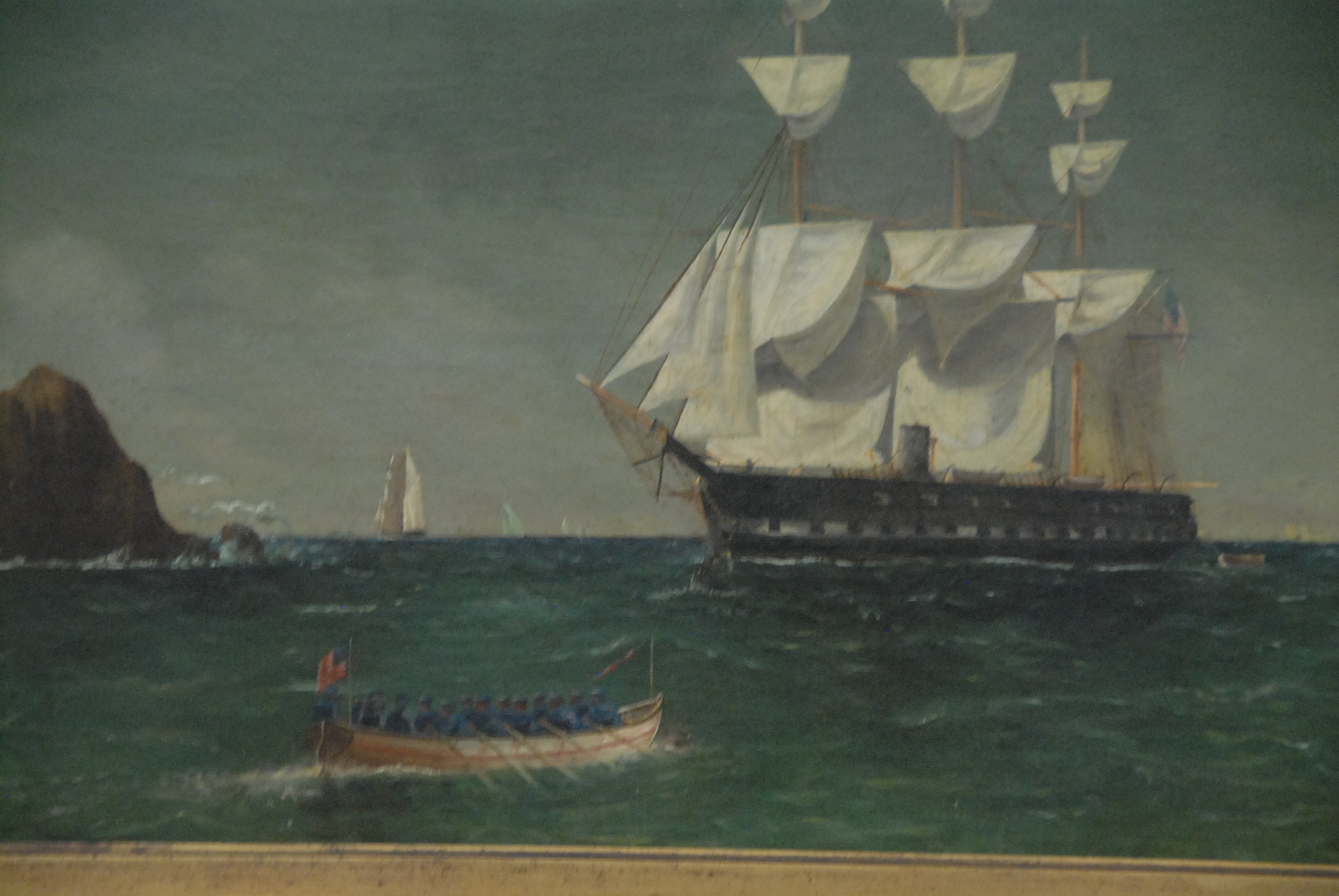 William Henry Coffin 1812-1898 ROWING TO THE SHIP FLYING AMERICAN FLAGS oil on canvas signed lower right W. H. Coffin 72 16 x 26