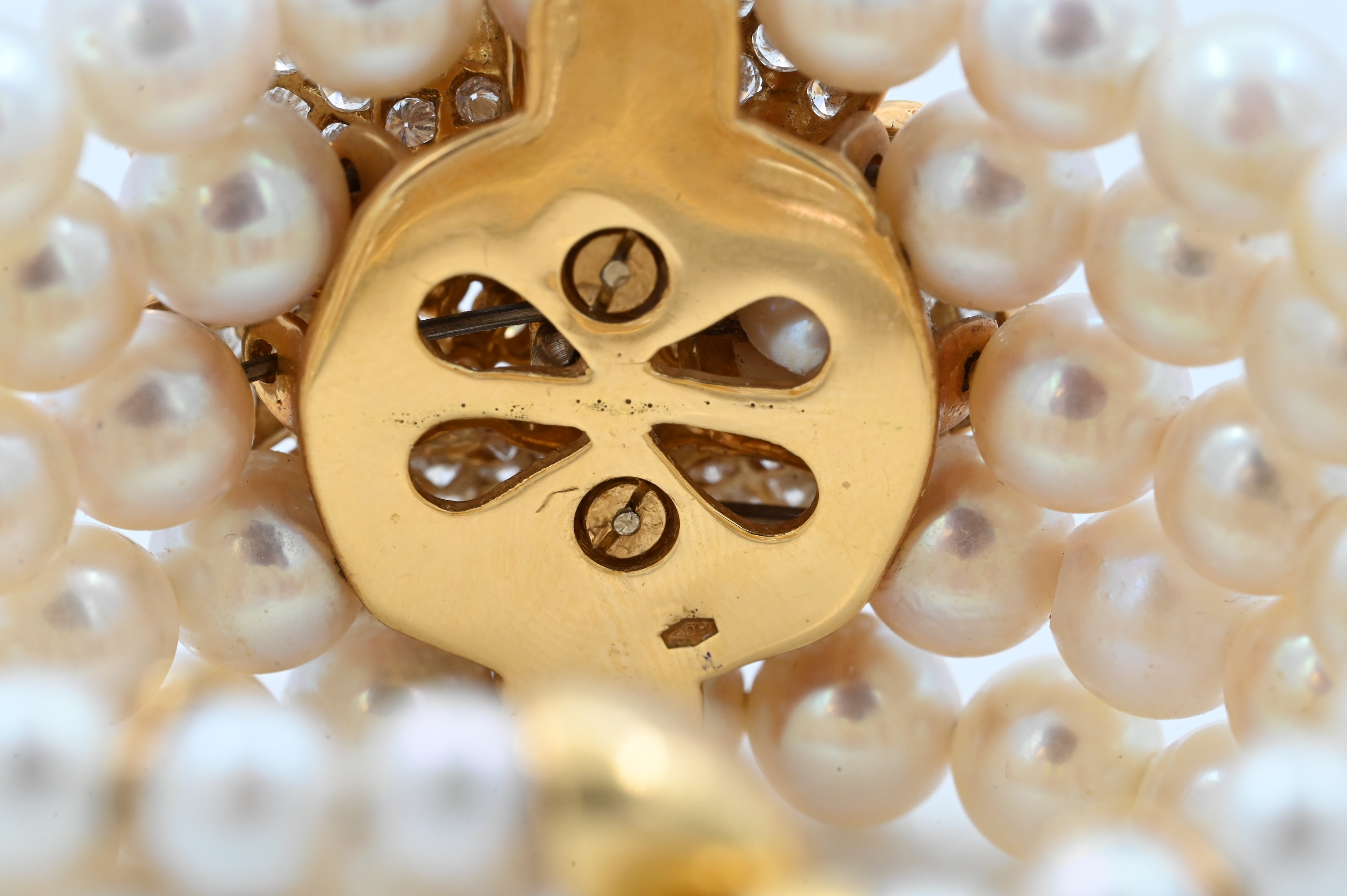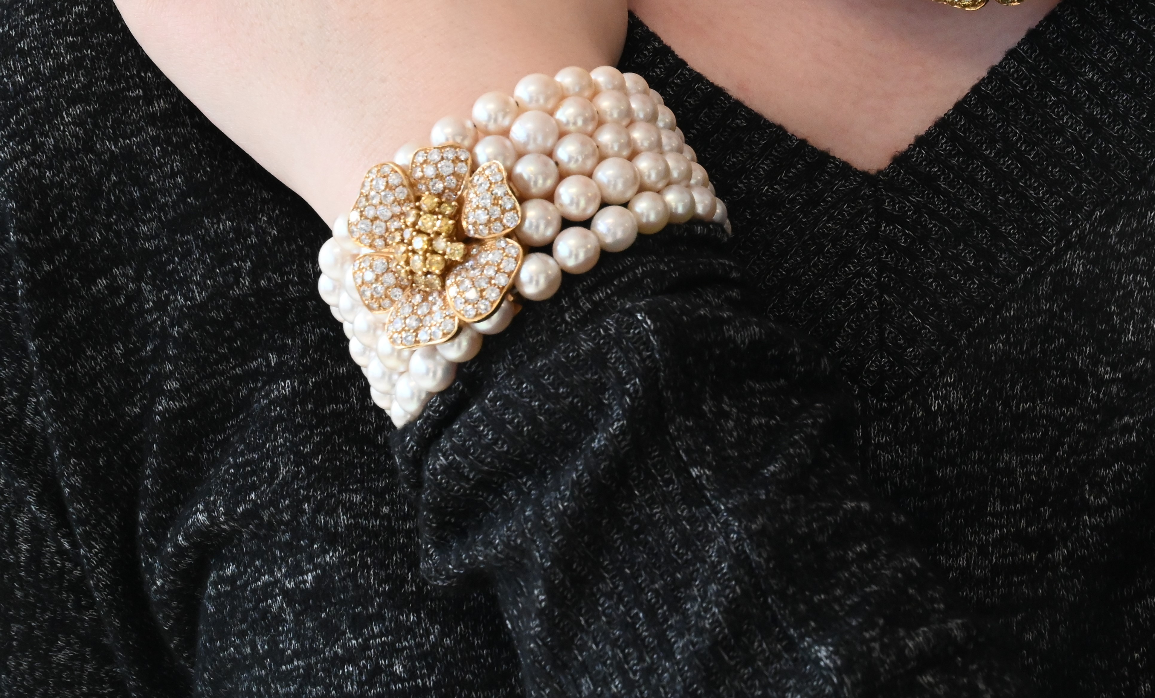 having five rows of 6 to 8.5 millimeter round pearls mounted with gold flower with 16 canary yellow diamonds approximately 1.3 total carats and 107 round diamonds approximately 8.6 total carats, flex spring design marked 750, circumference 7 inches, total weight 110.8 grams