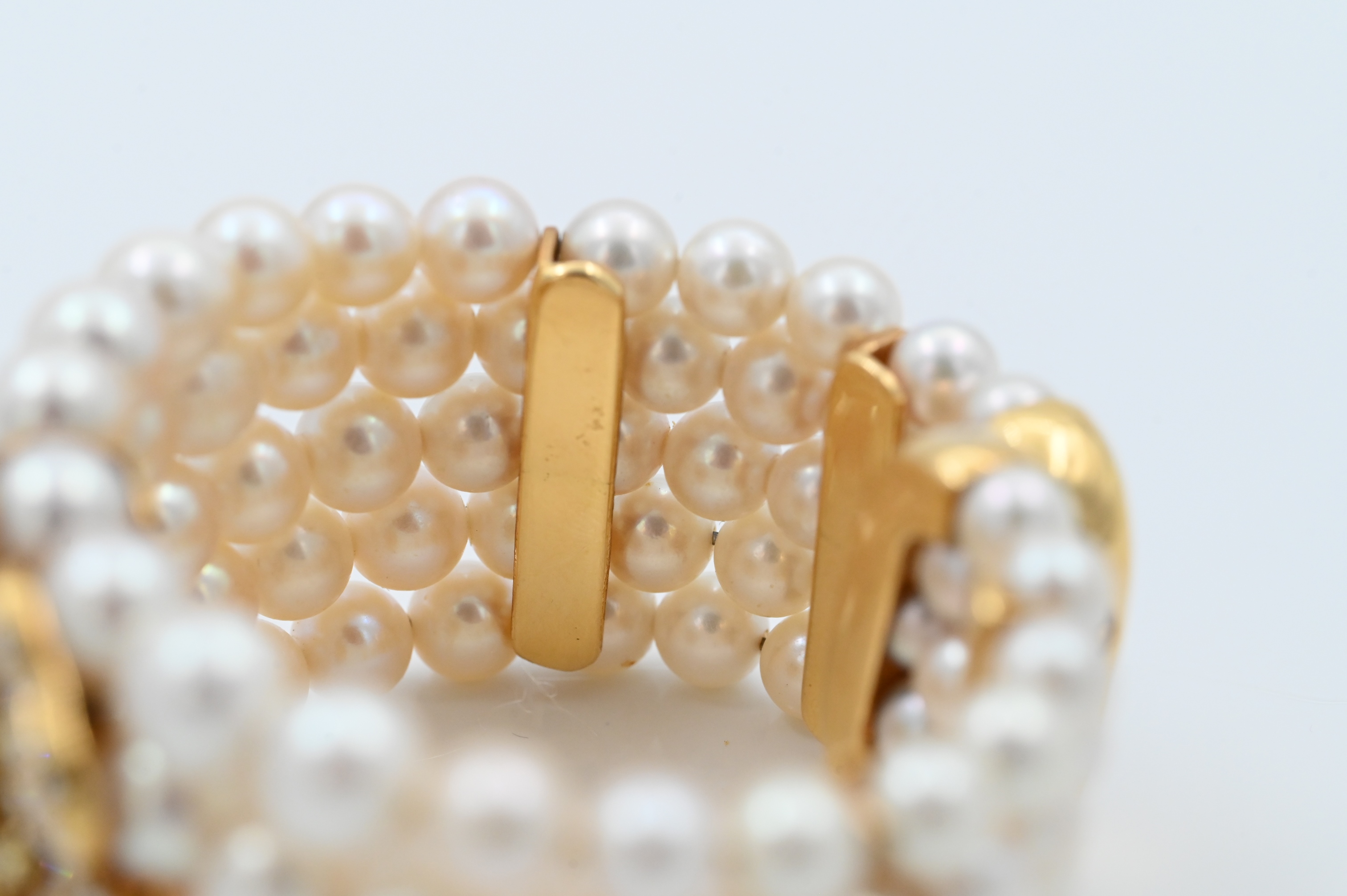 Lot 116: 18K Yellow Gold, Diamond, and Pearl Cuff Bangle Bracelet