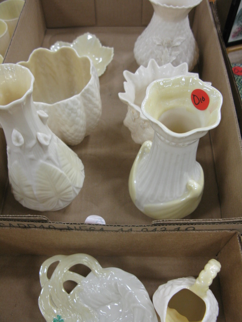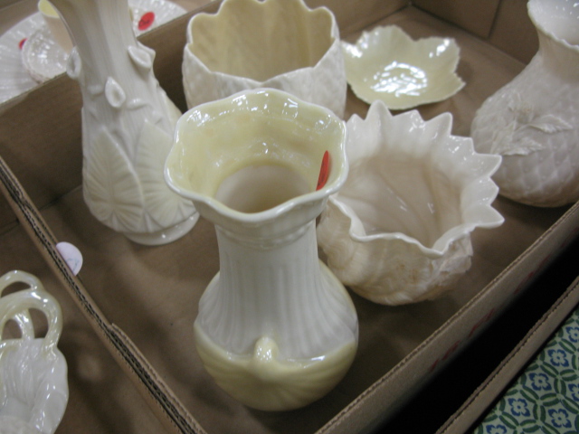 2 box lots to include 13 pieces of Irish Belleek, vases, dishes, creamer, sugar
