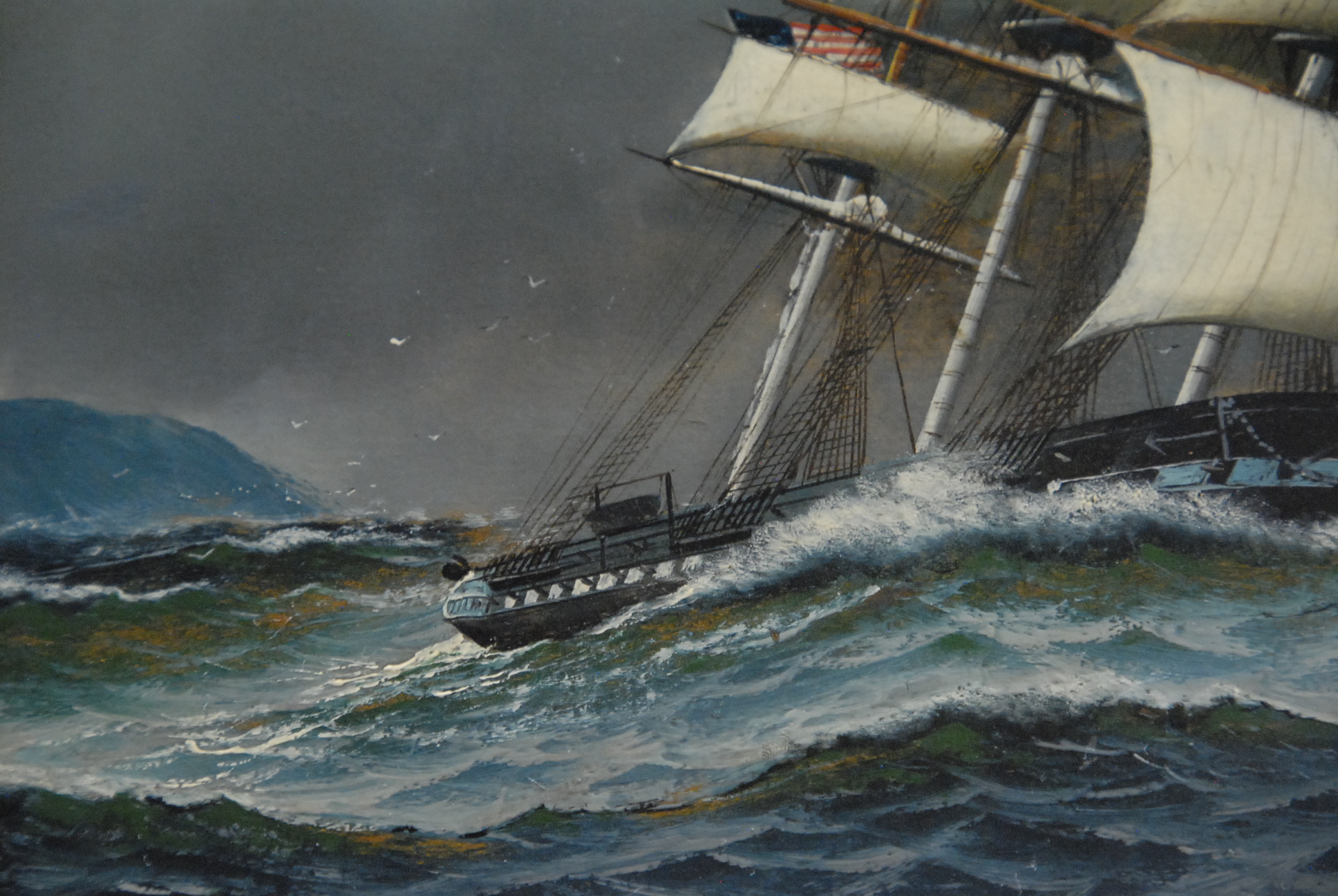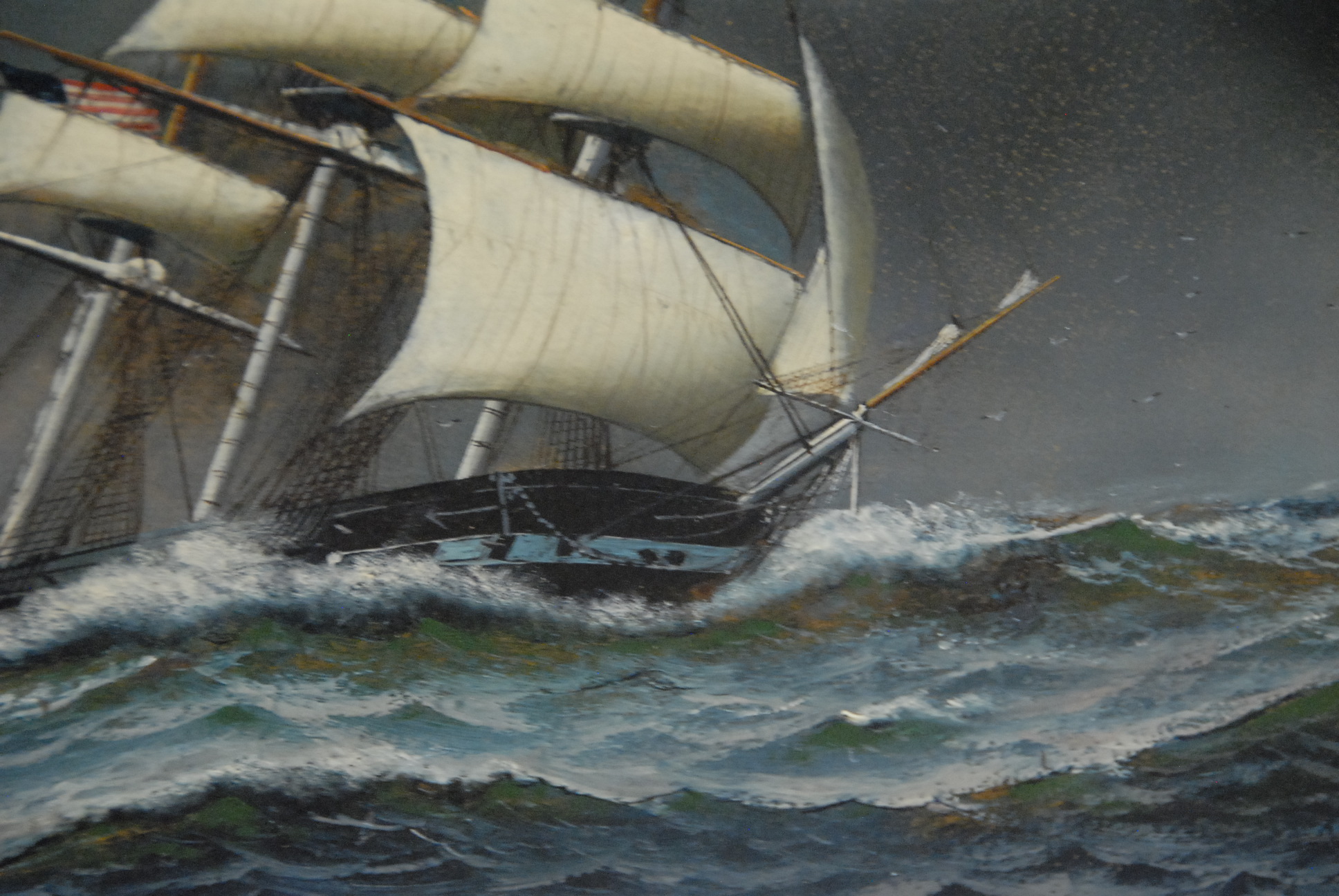Antonio Nicolo Gasparao Jacobsen 1850-1921 AMERICAN CLIPPER SHIP oil on board signed lower right Antonio Jacobsen 19 11 3/4 x 20