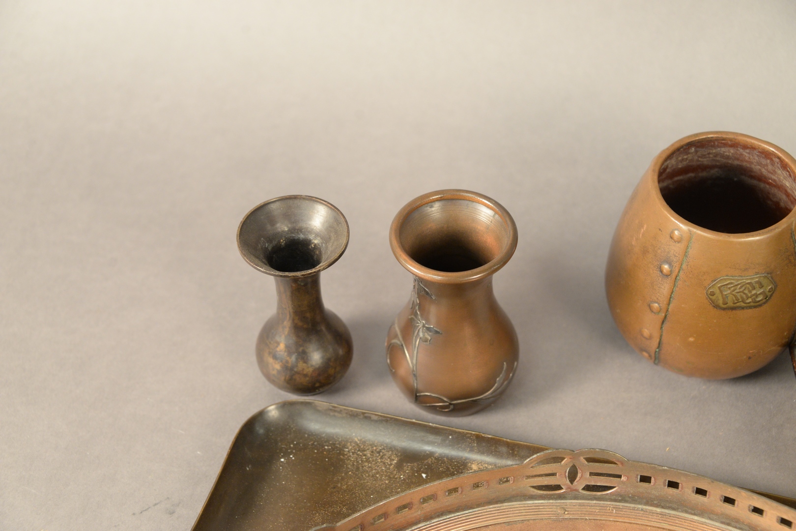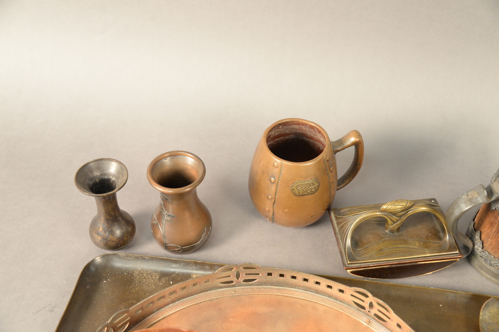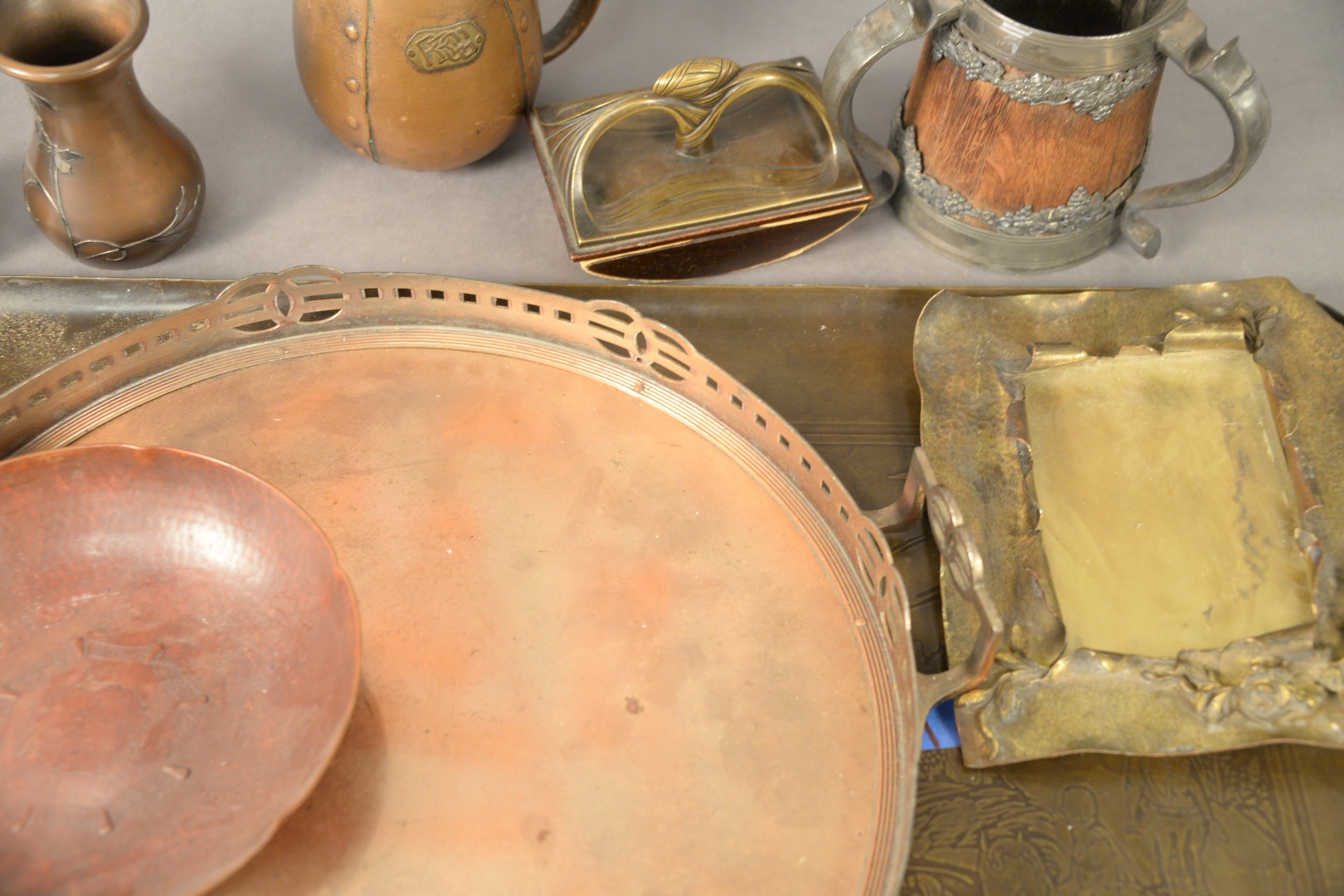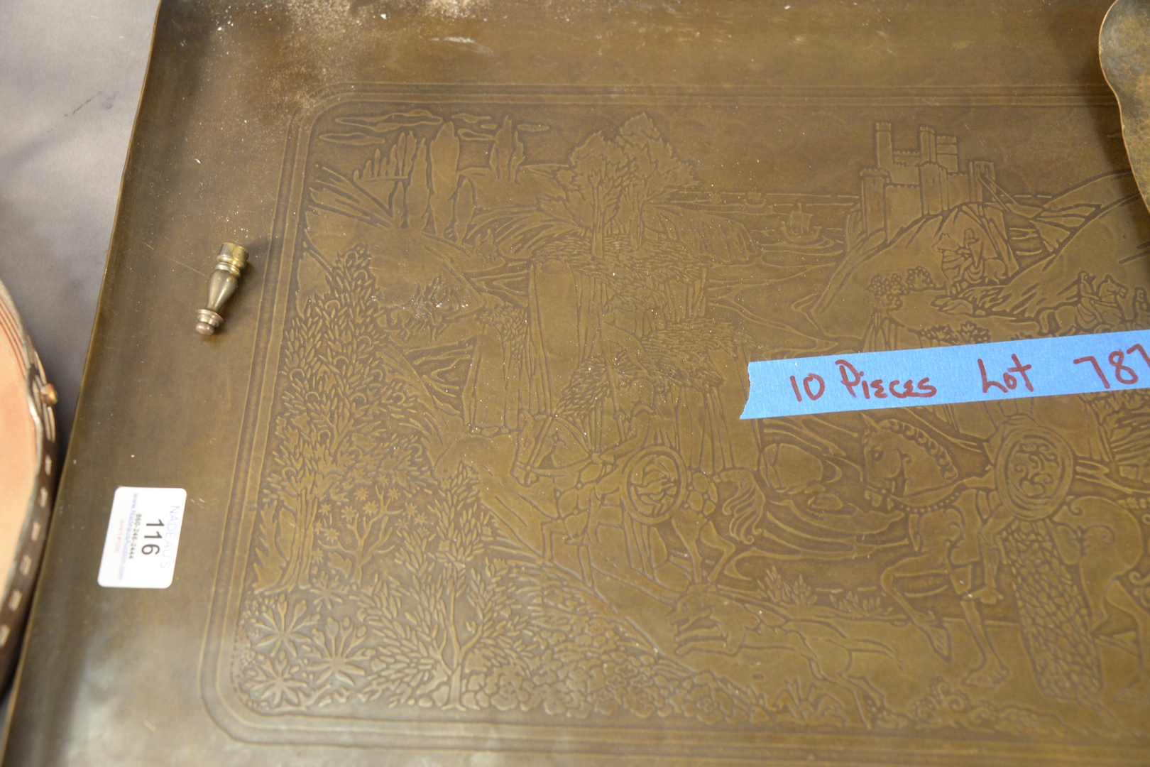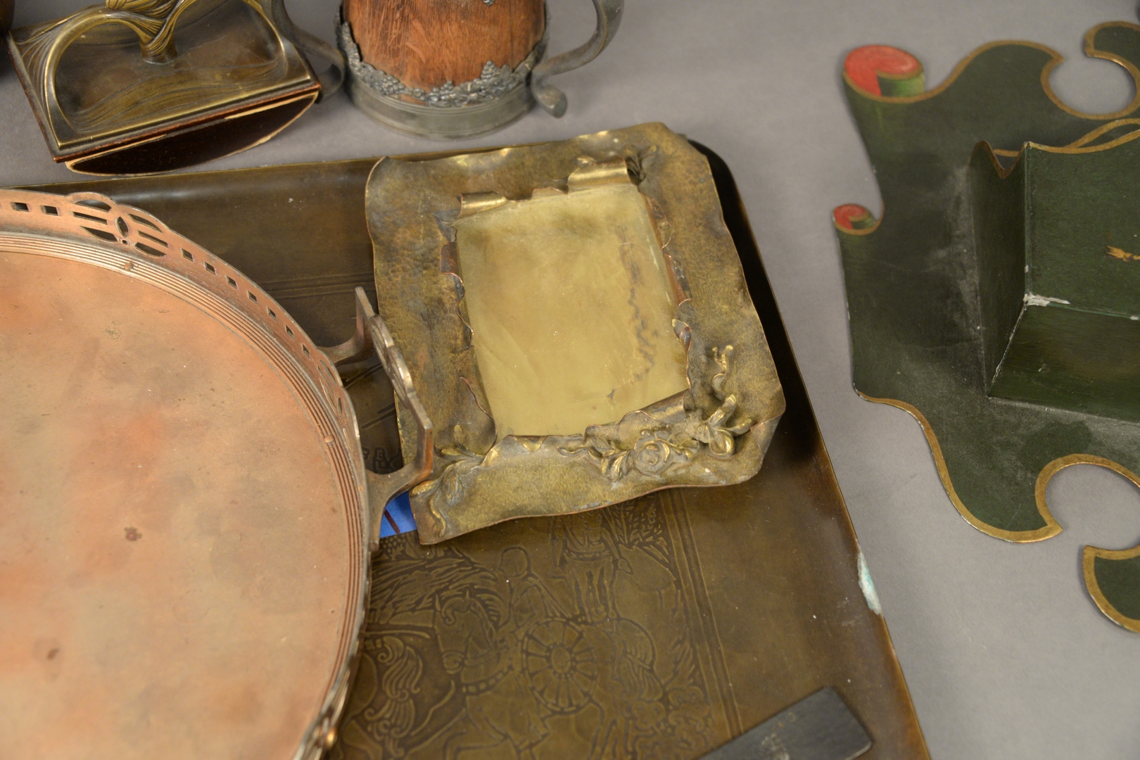 Lot 116: Assorted Group of Arts and Crafts, to include copper and brass tray, length 23 inches brass picture frame painted tole letter holder etc.