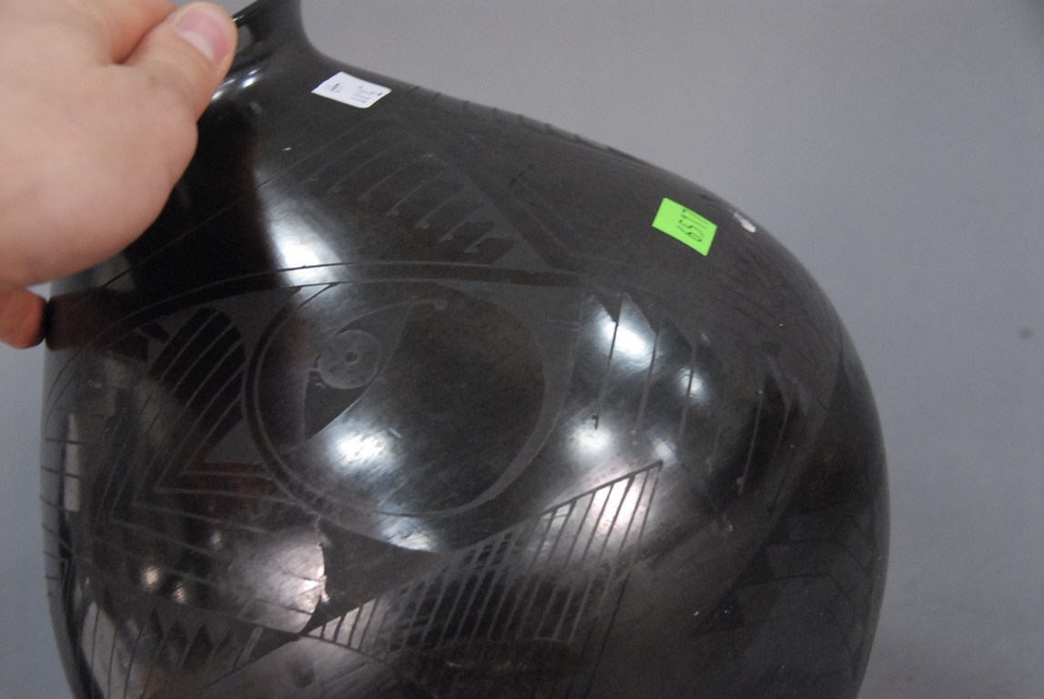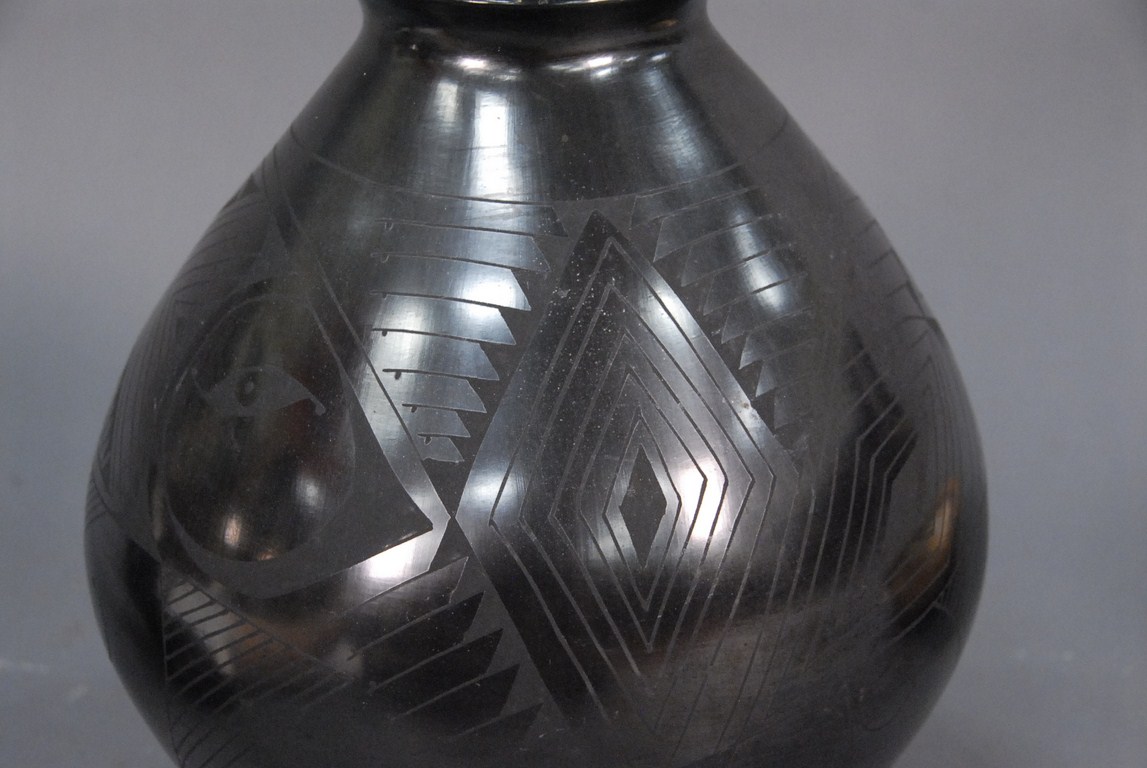 Black pottery Indian pot signed Eusibio Sandoval. ht. 11 1/2in.