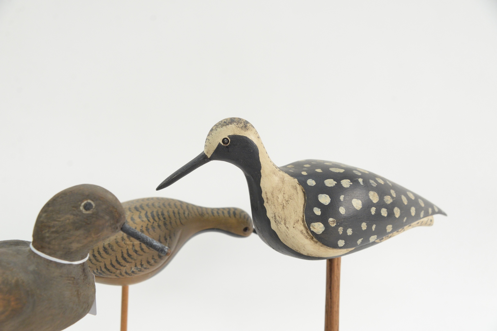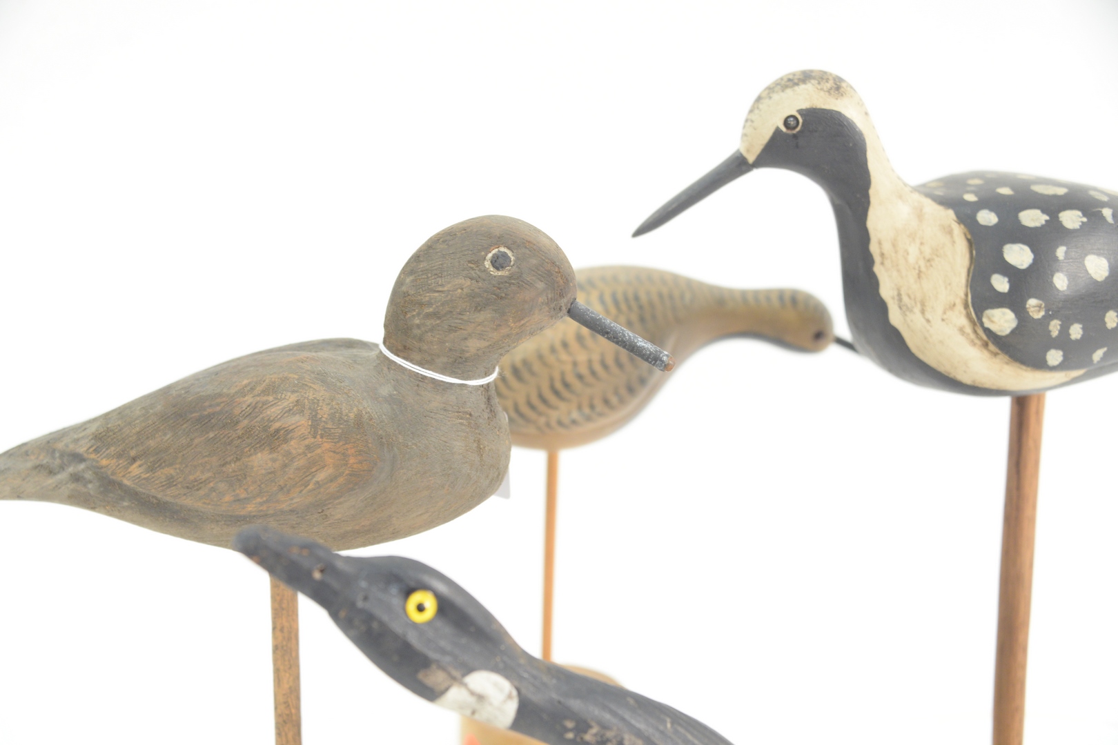Lot 116: Four Carved and Painted Bird Decoys, goose decoy stamped White Harris Old Saybrook Shorebird along with two other shore birds, unsigned, tallest 14 1/2 inches.