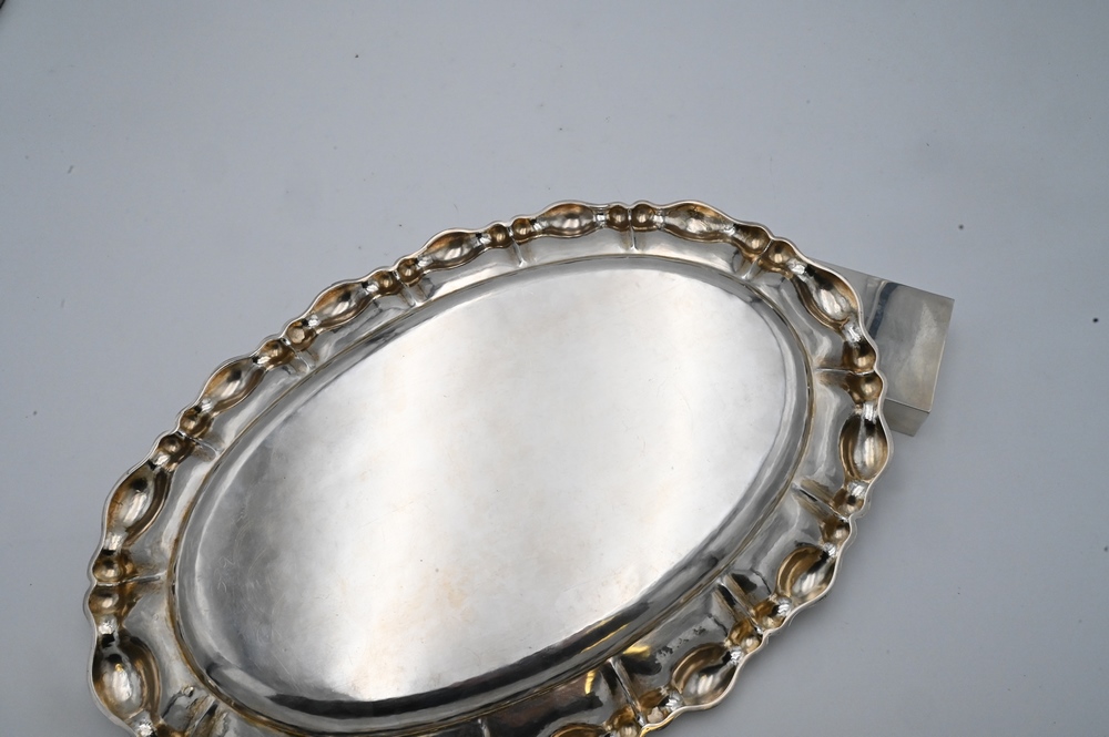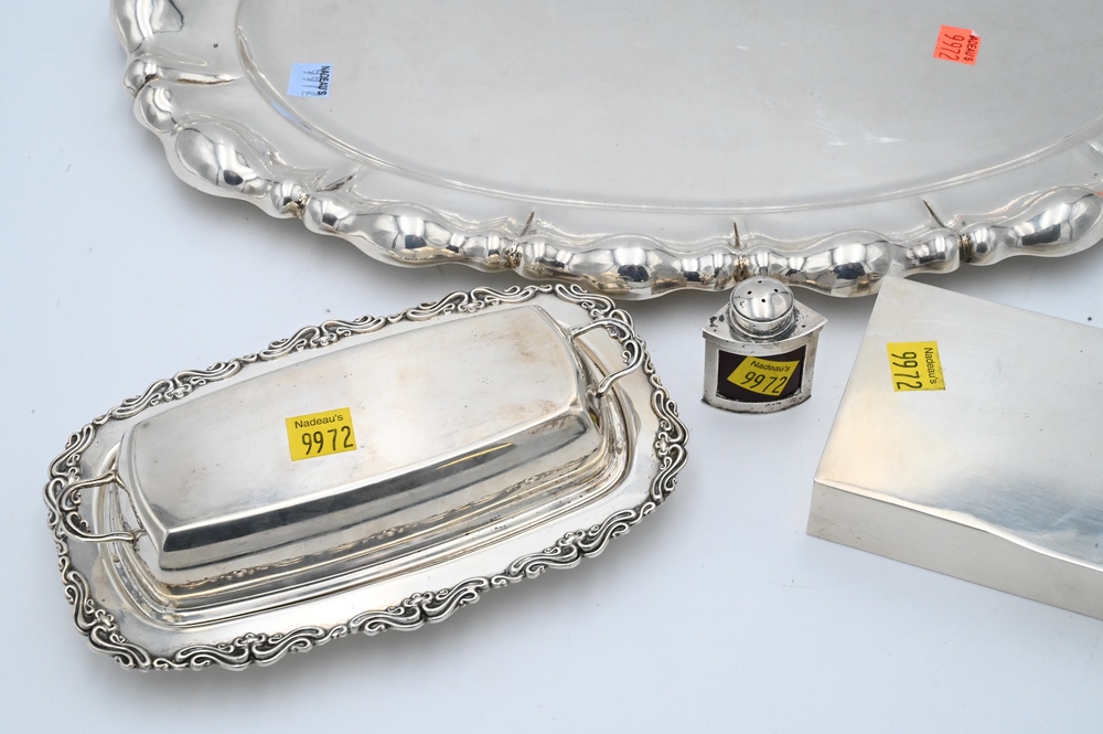 Four Piece Sterling Silver Lot, to include an oval tray with ruffled rim, length 19 inches; a sterling two-part butter dish; salt with glass liner; along with a rectangle box having a wood liner; 37.5 t.oz. weighable.