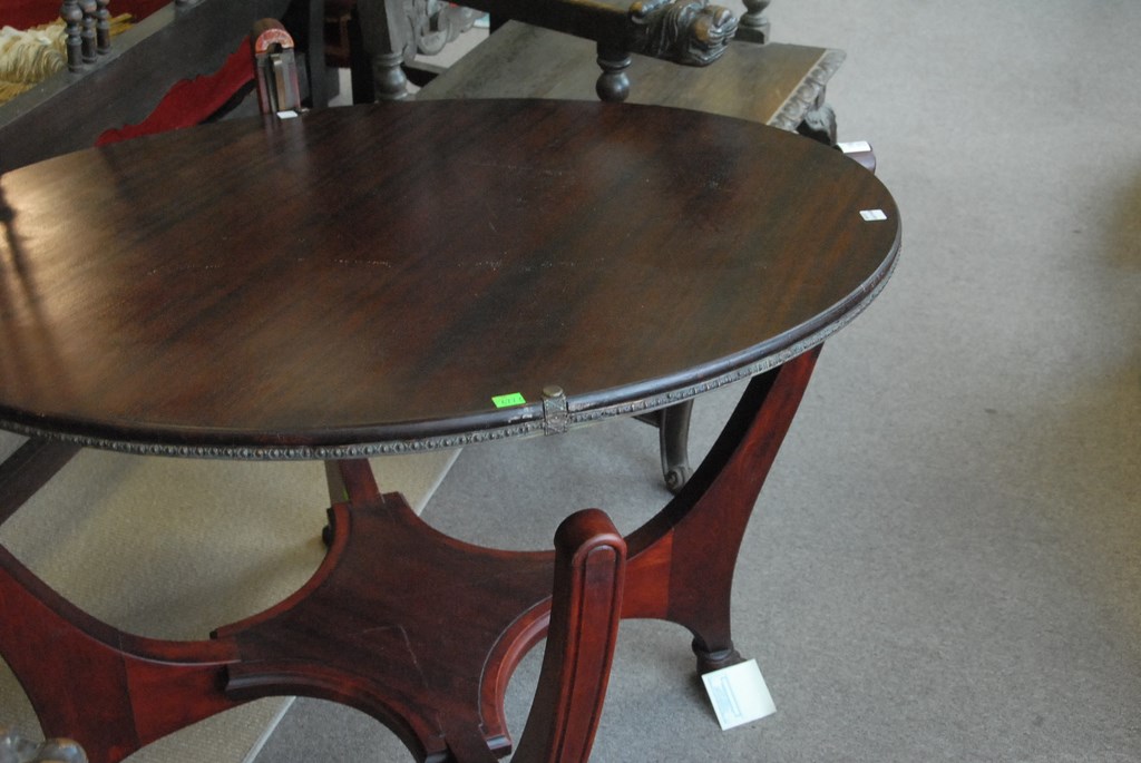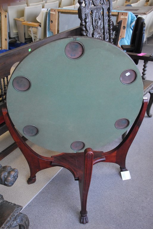 Lot 116: Hunzinger games table with felt top and cup holders, top reverse to mahogany top all on base with paw feet, ht. 29 in. dia. 36 in.