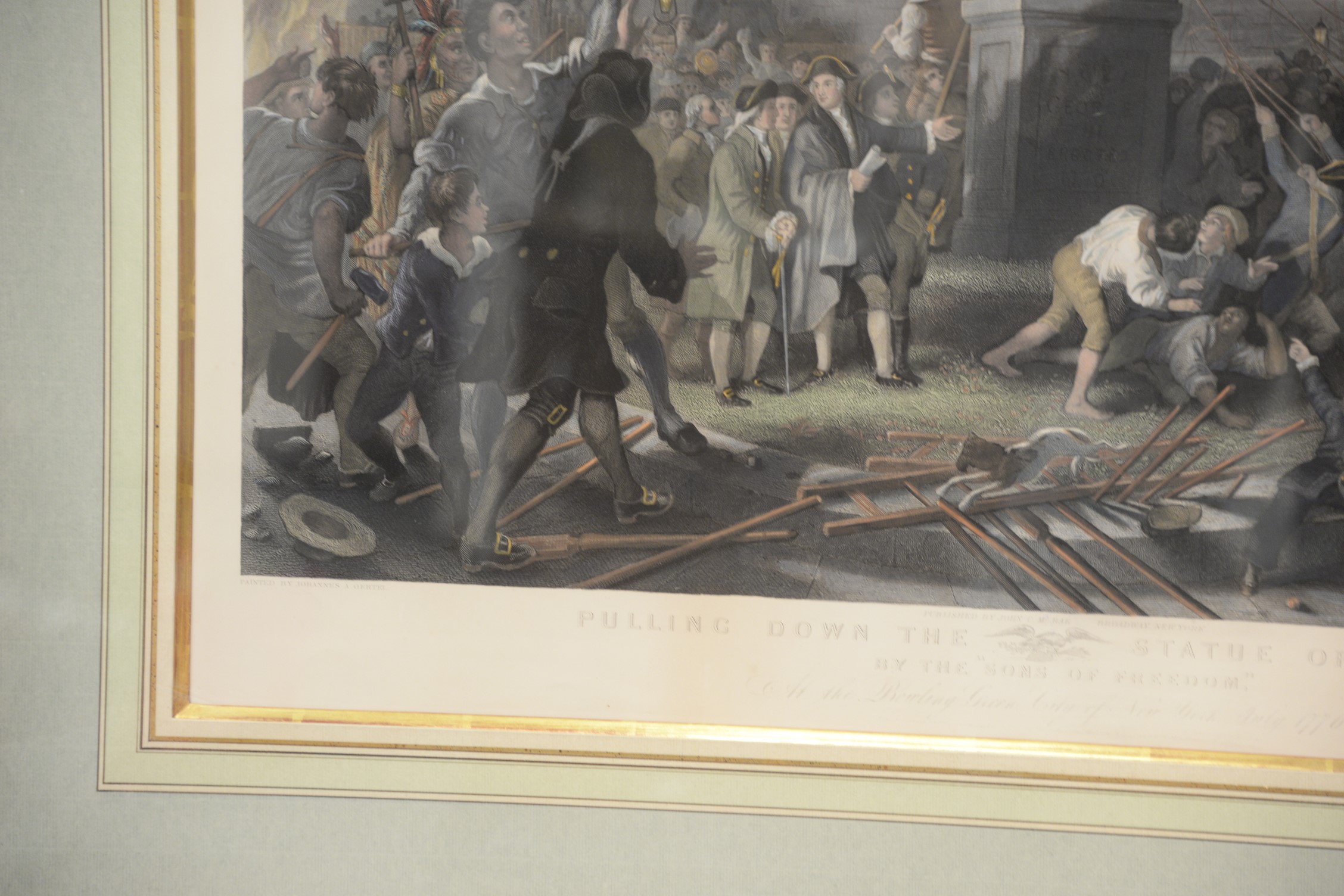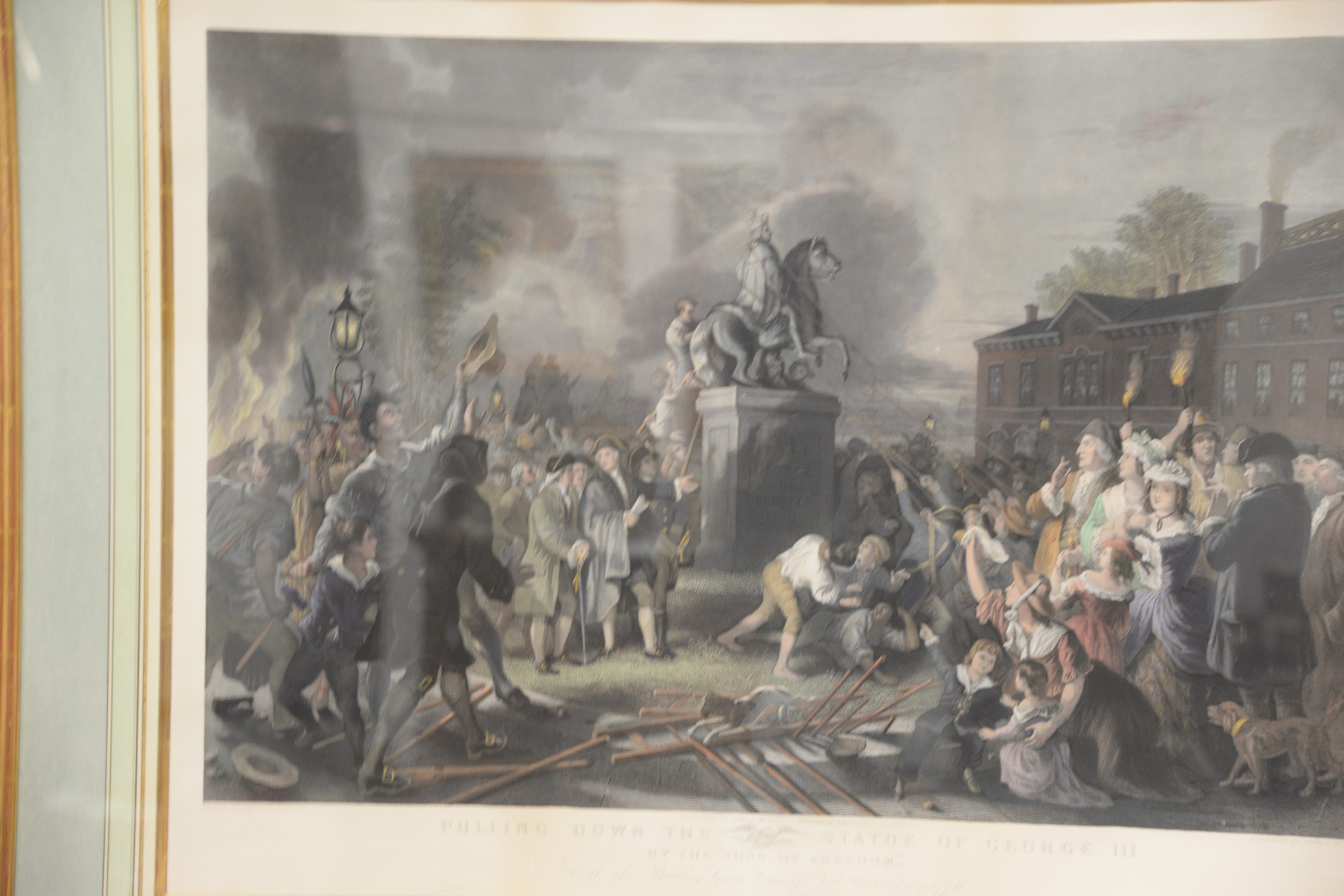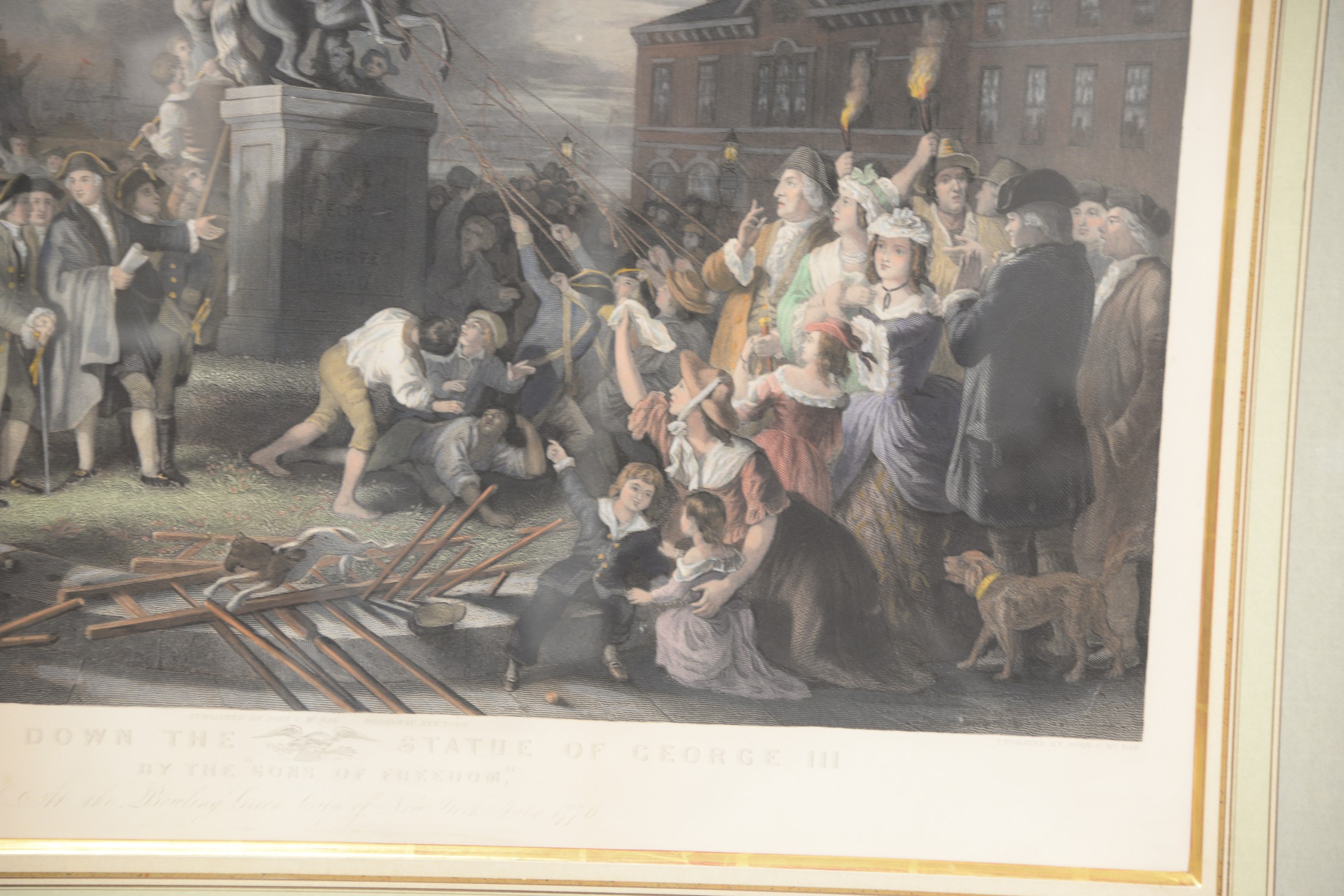 John C. McRae 1850-1880 after Johannes A. Oertel 1823-1909 Pulling Down the Statue of George III by The Sons of Freedom at the bowling Green, City of New York, July 1776 colored engraving framed and matted 23 1/2 x 31 3/4 sight size Provenance: Property from Credit Suisse’s Americana Collection