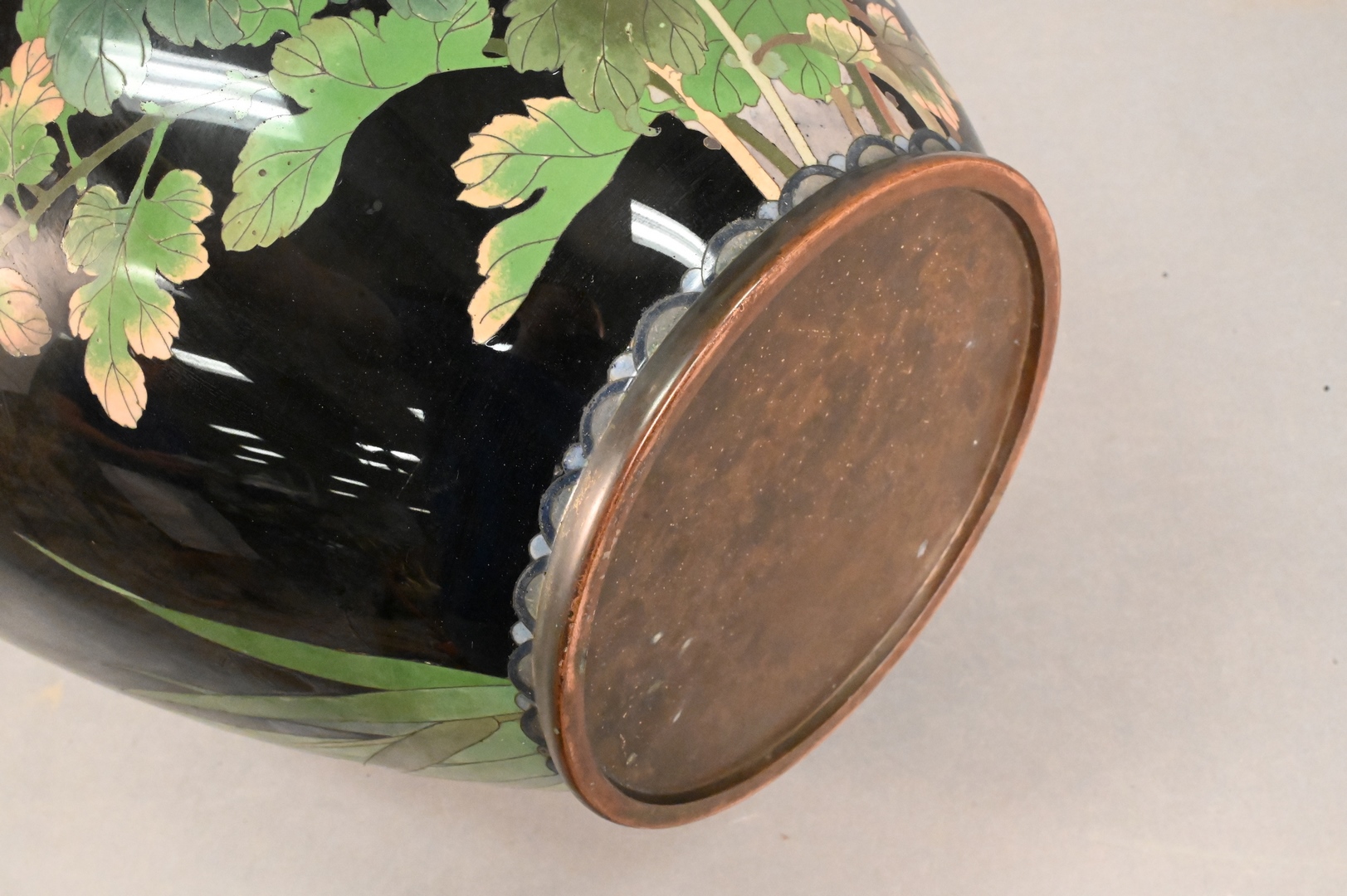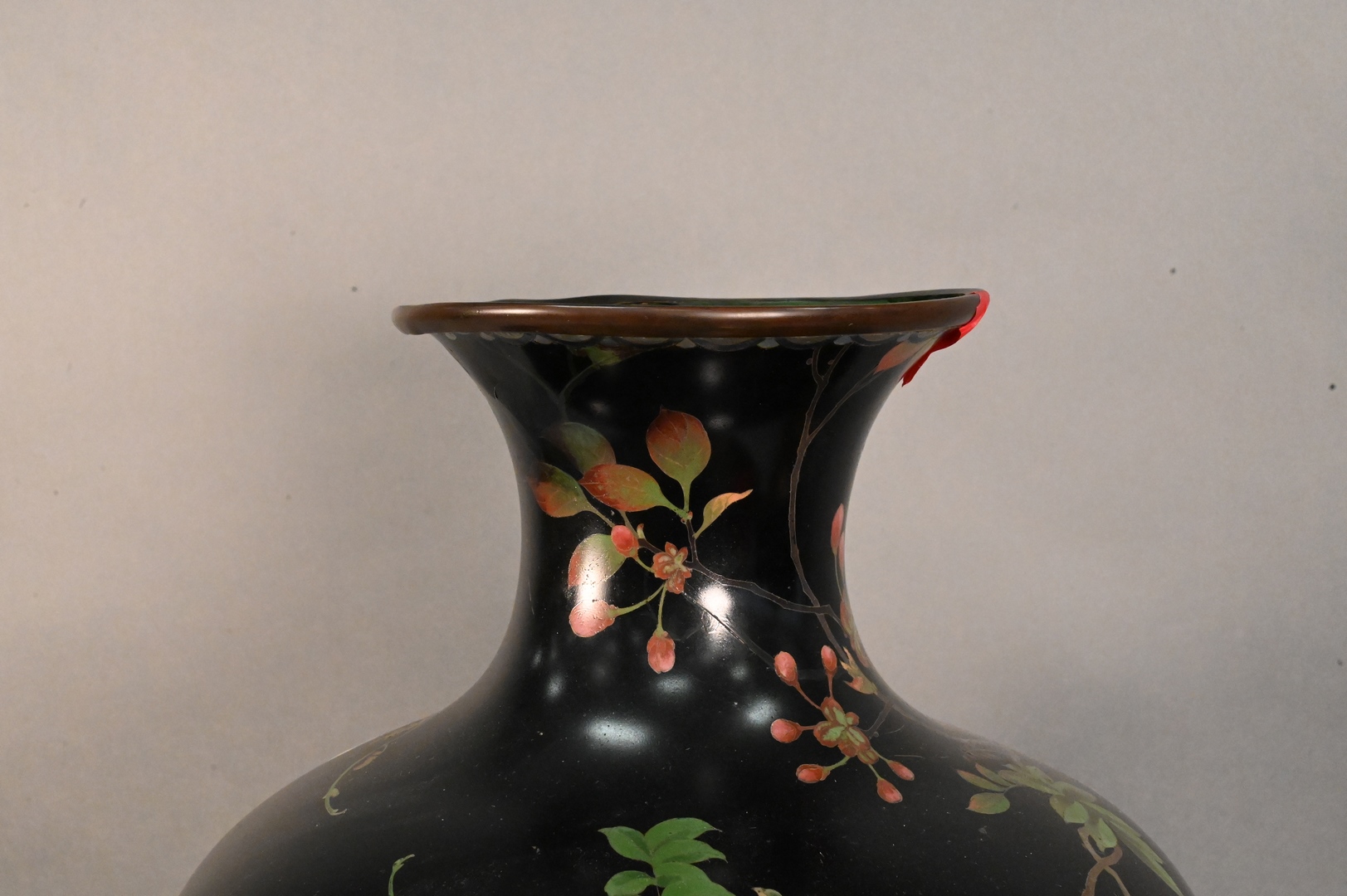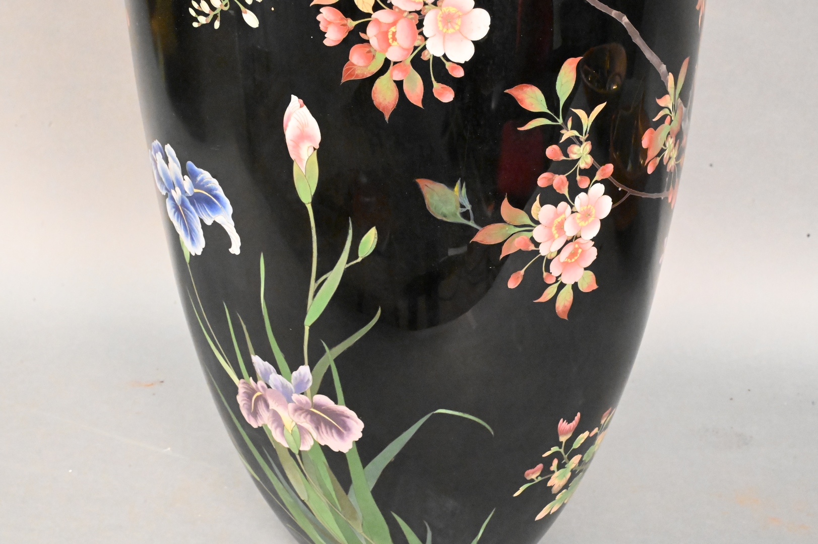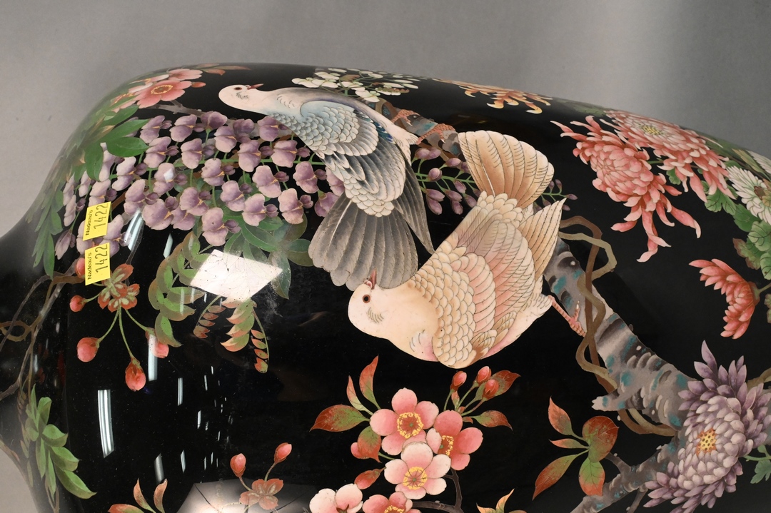 Large Cloisonne Vase, place size, having blossoming tree and bird decoration, height 33 1/4 inches.