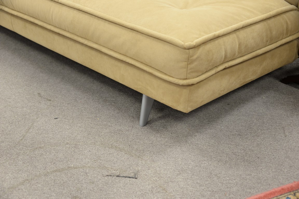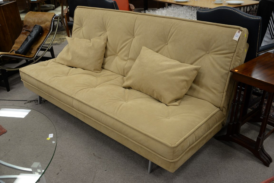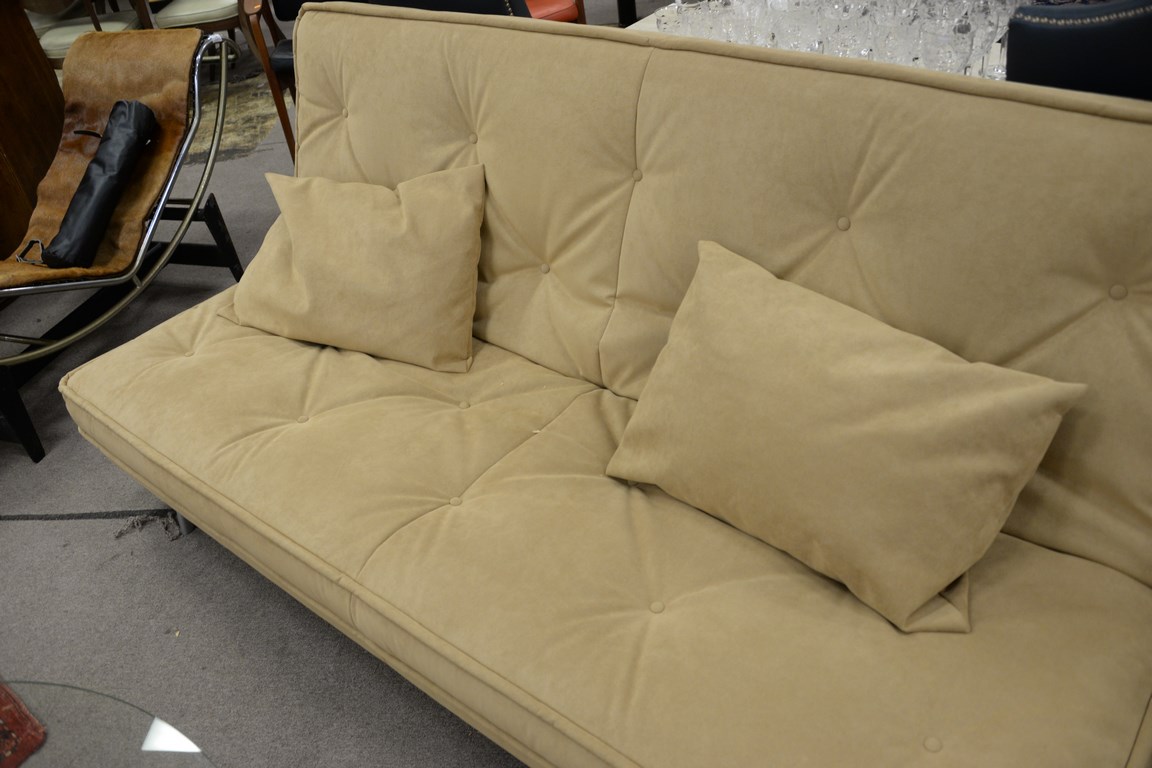 Lot 116: Nomade Express by Didier Gomez, suede tan futon new price 2,865.. sofa: ht. 37 1/2 in. wd. 80 in. dp. 43 1/4 in. as bed:…