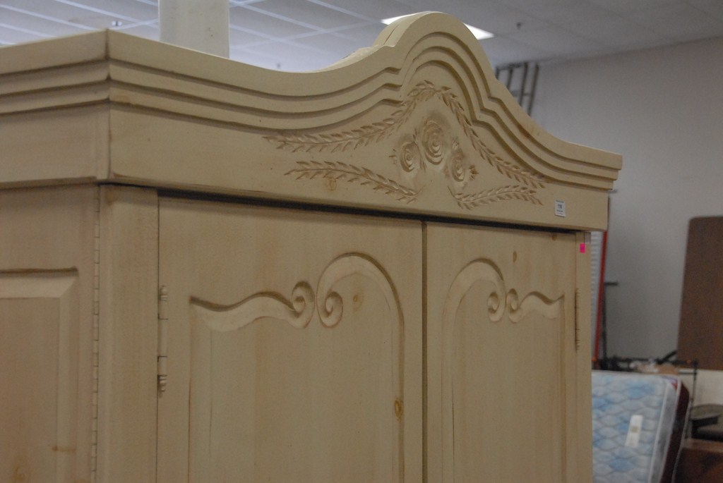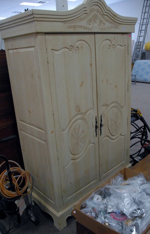 Lot 116: Paint decorated two door armoire cabinet with shelves and fitted drawers on the inside, ht. 79, wd. 45.