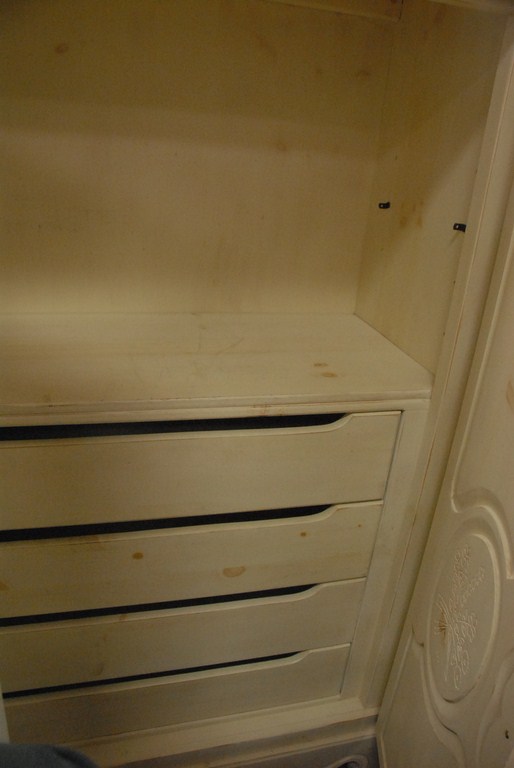 Paint decorated two door armoire cabinet with shelves and fitted drawers on the inside, ht. 79, wd. 45.
