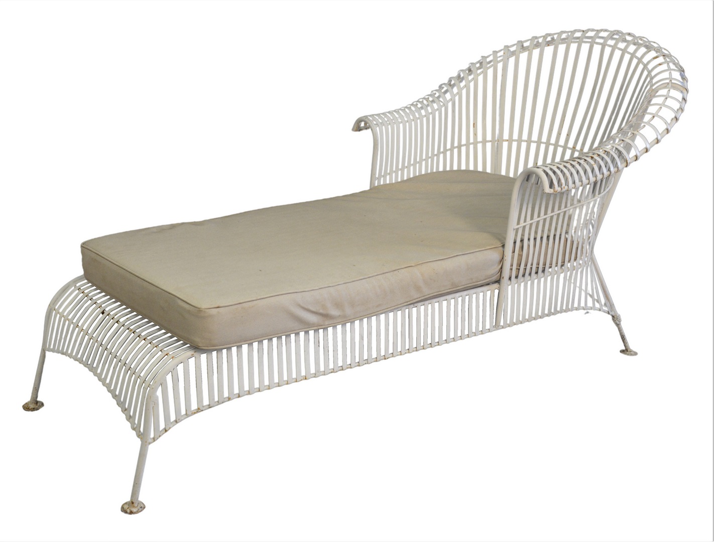 Lot 116: Russell Woodard Seven Piece Mid-century Outdoor Set, to include a pair of chaise lounges, pair of chairs, loveseat, along with a pair of tables, length 70 inches.