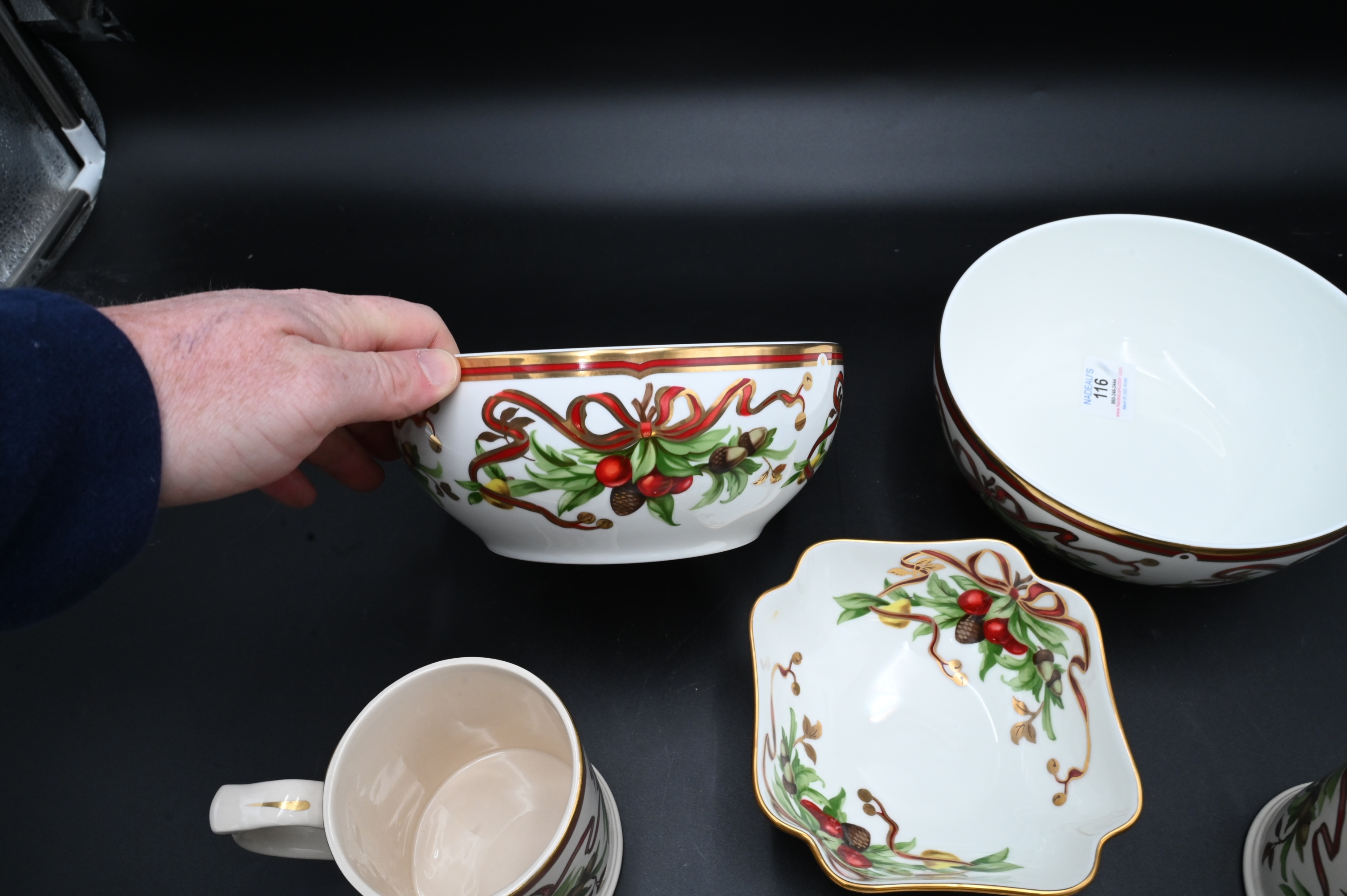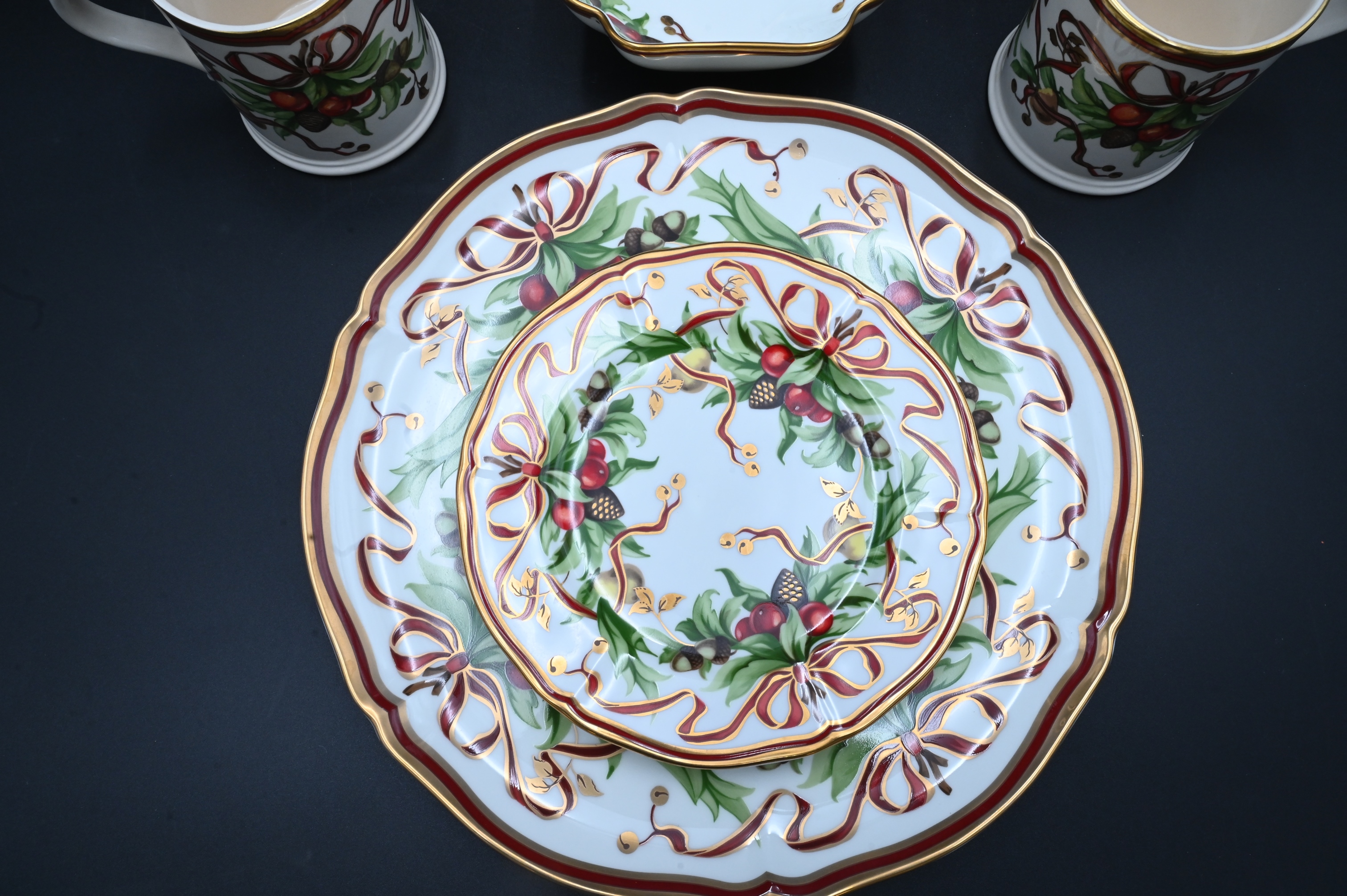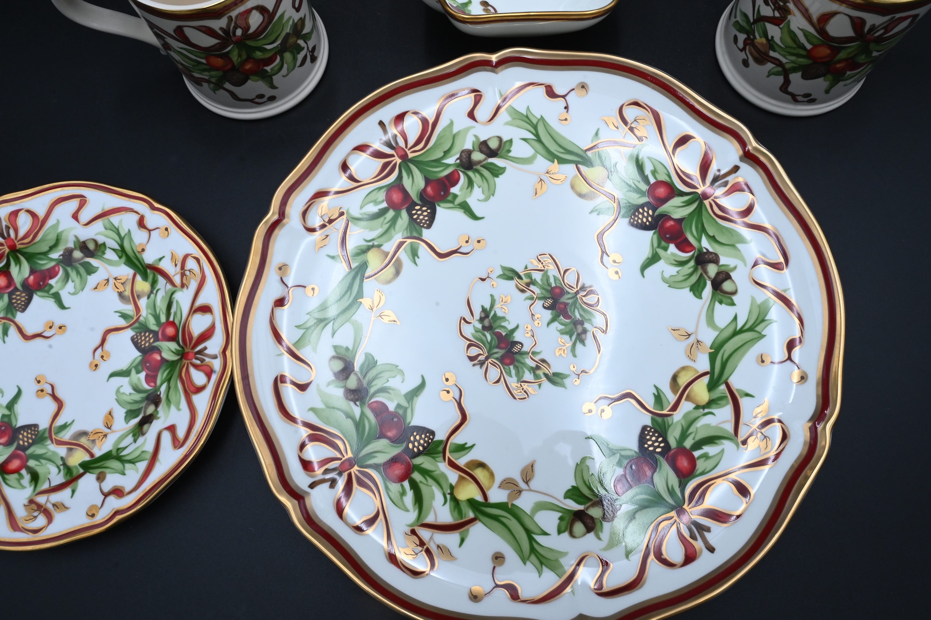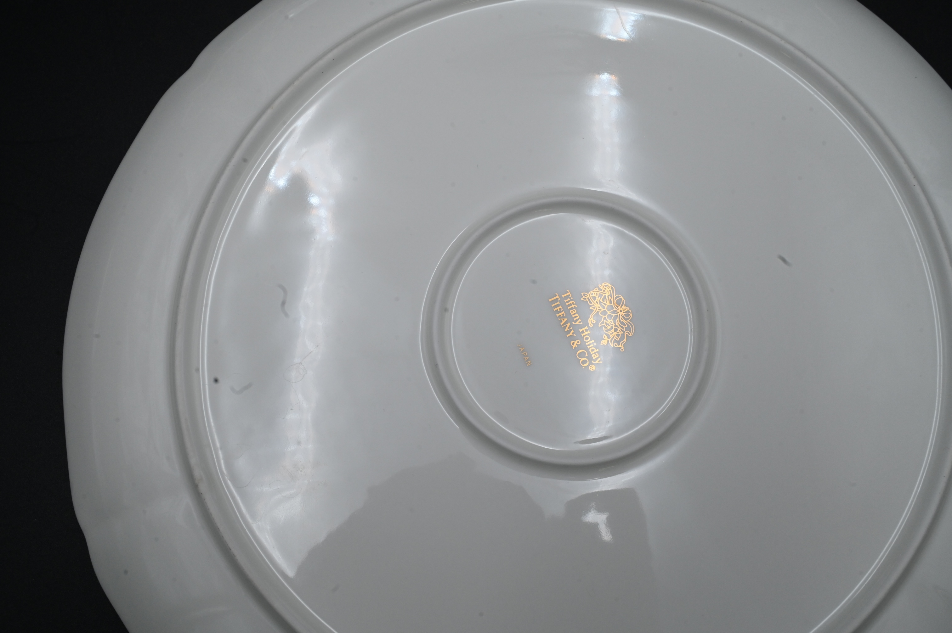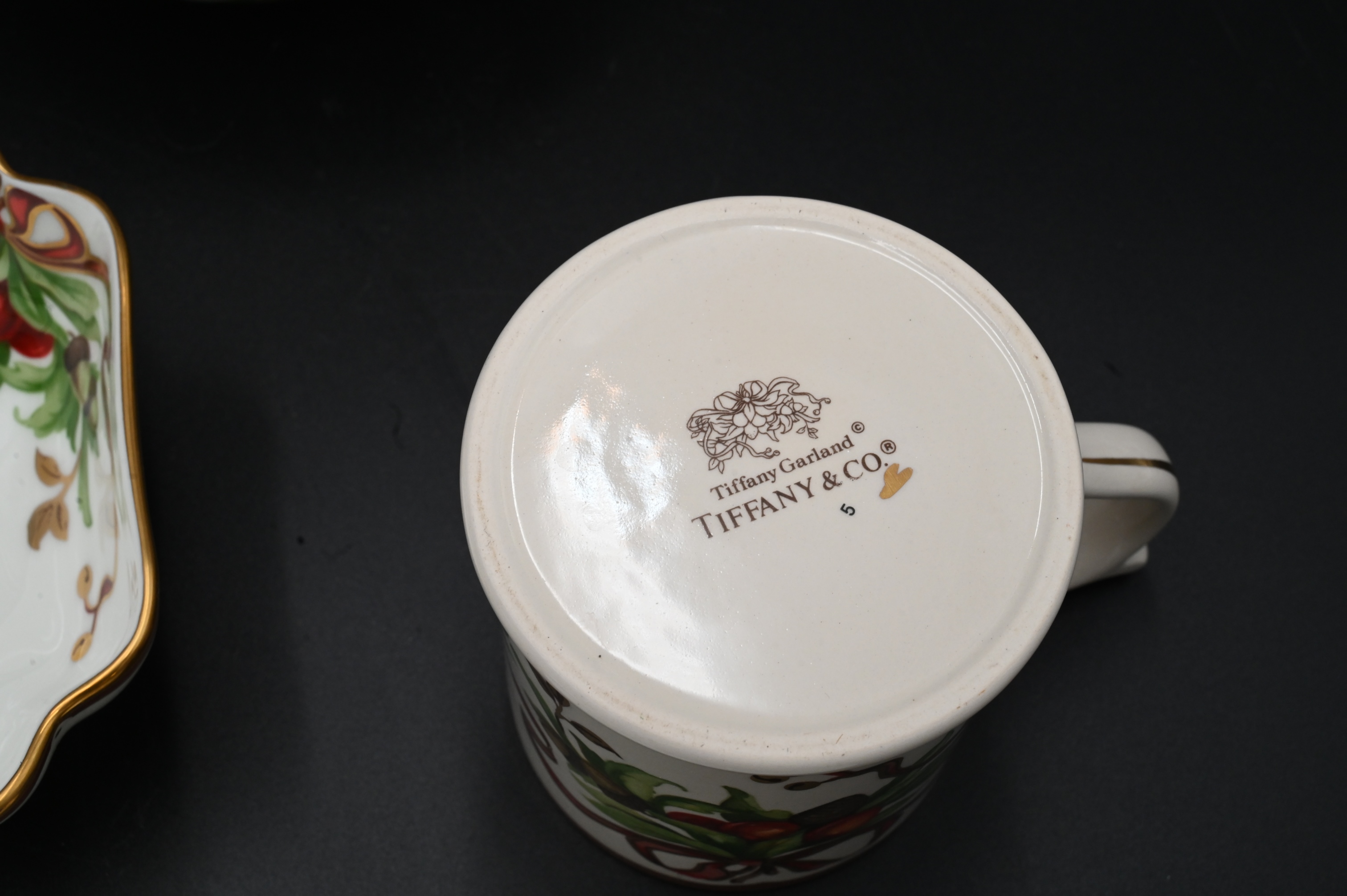 Seven Piece Tiffany & Company “Tiffany Holiday”, to include a pair of bowls, charger, small shaped bowl, luncheon plate, along with two “Tiffany Garland” mugs; charger diameter 12 inches.