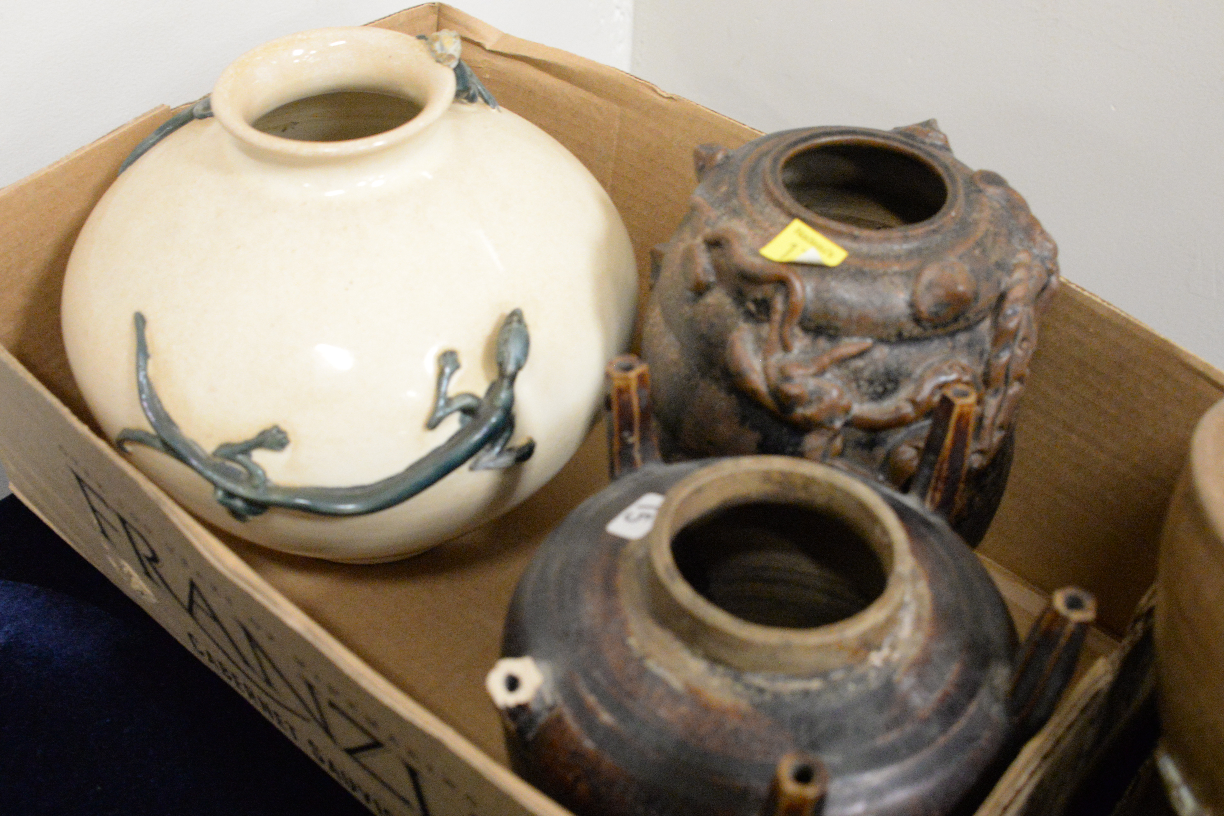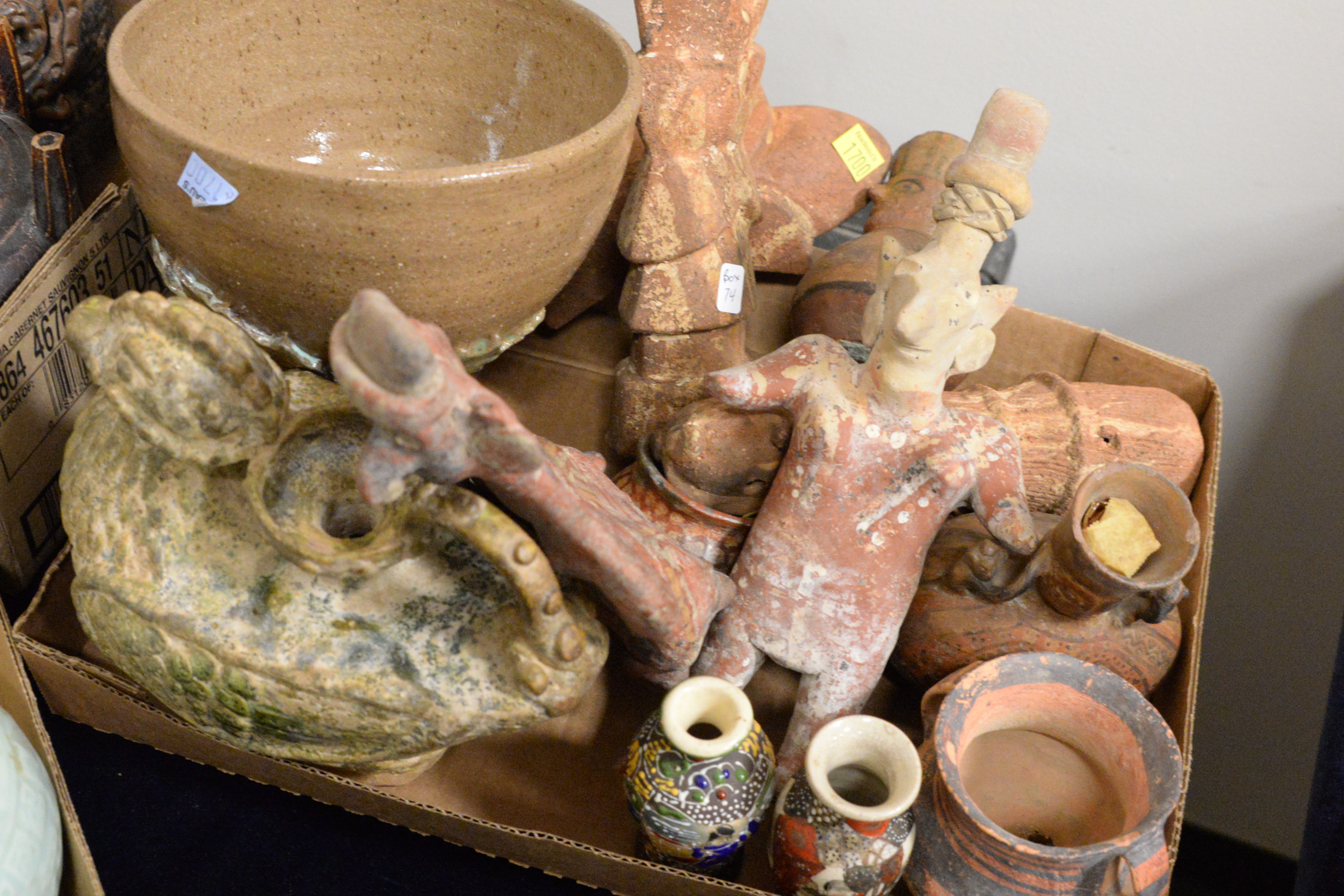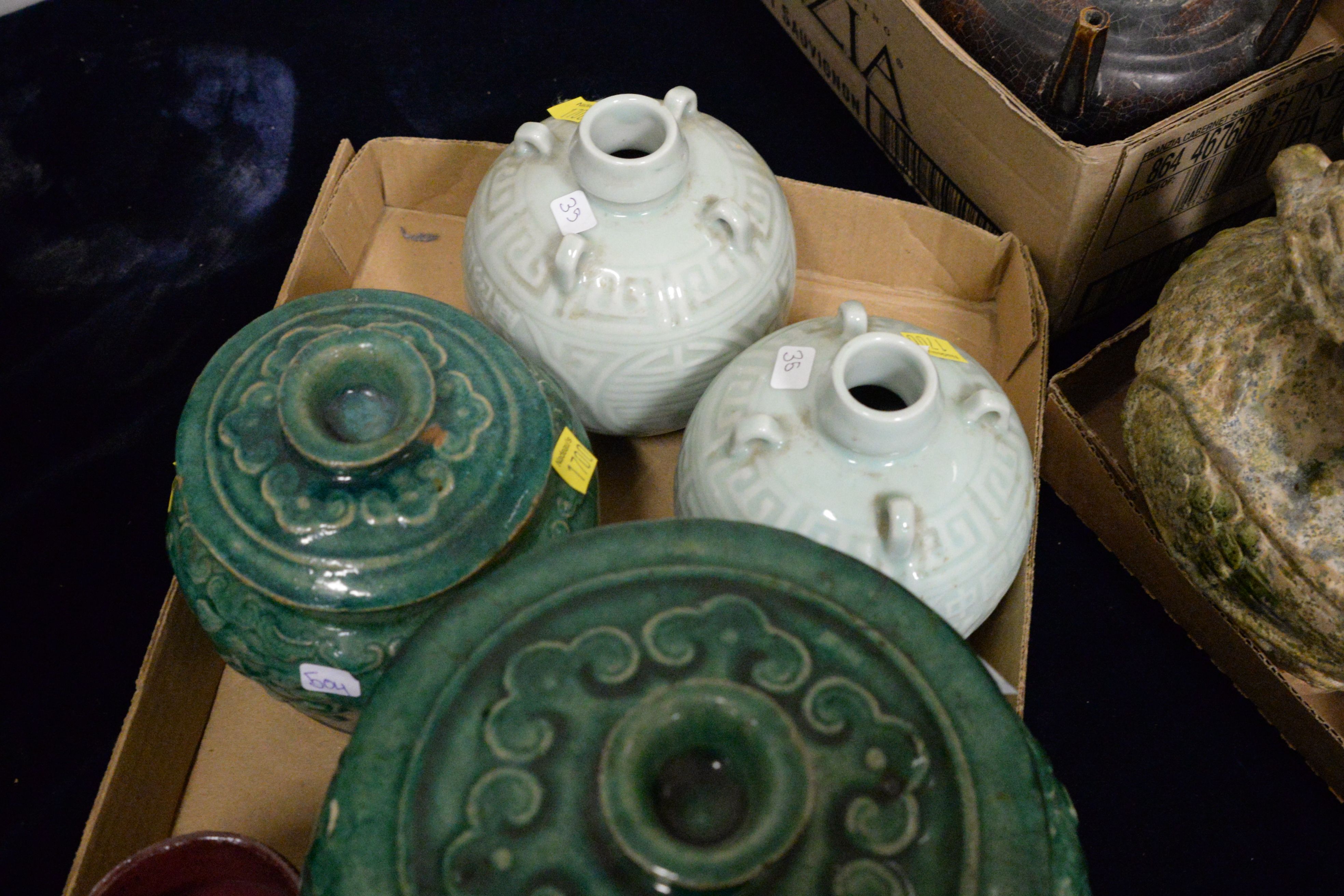 Three Tray Lots of Chinese Pottery, to include two green glazed earthenware ginger jars with lids, two celadon rice wine pouring jugs, clay figures, ceramic bird vessel, etc., largest piece 7 inches height
