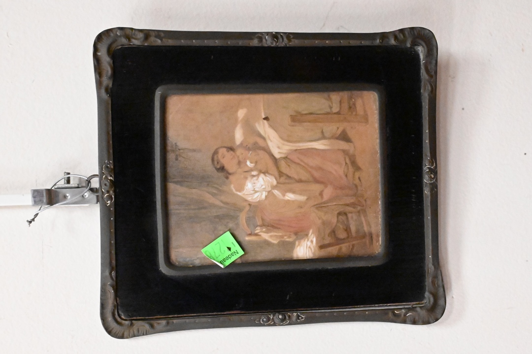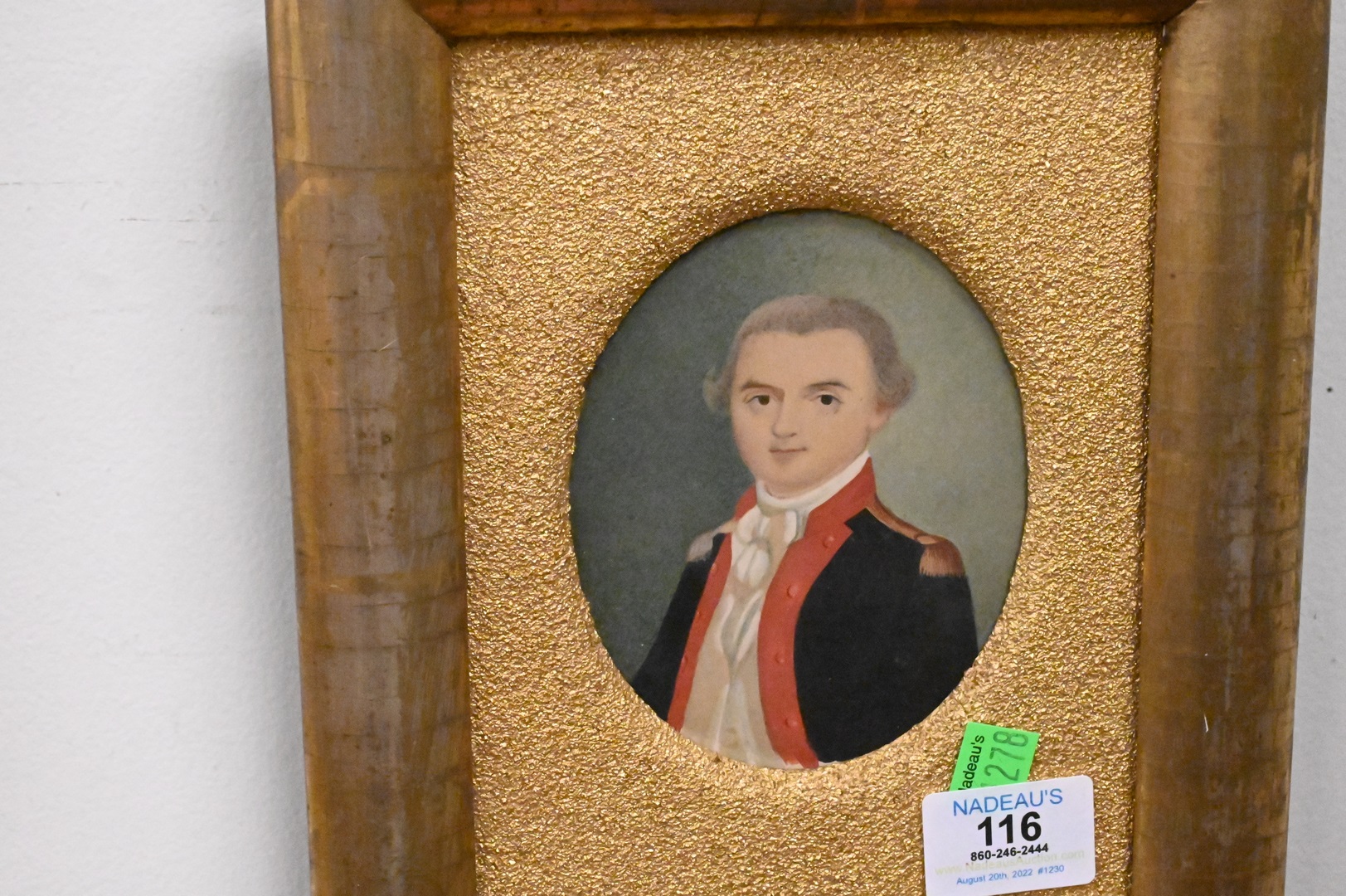Two Piece Framed Lot, to include 19th century watercolor on canvas painting of an American officer in gilt frame, 4 3/4″ x 3 3/4″, along with 19th century watercolor mixed media painting of mother and child, signed and dated “E. Grenick, 1852″ lower right, 5 3/8″ x 4 1/8”. Provenance: Estate of Peter Tillou, Litchfield, Connecticut.