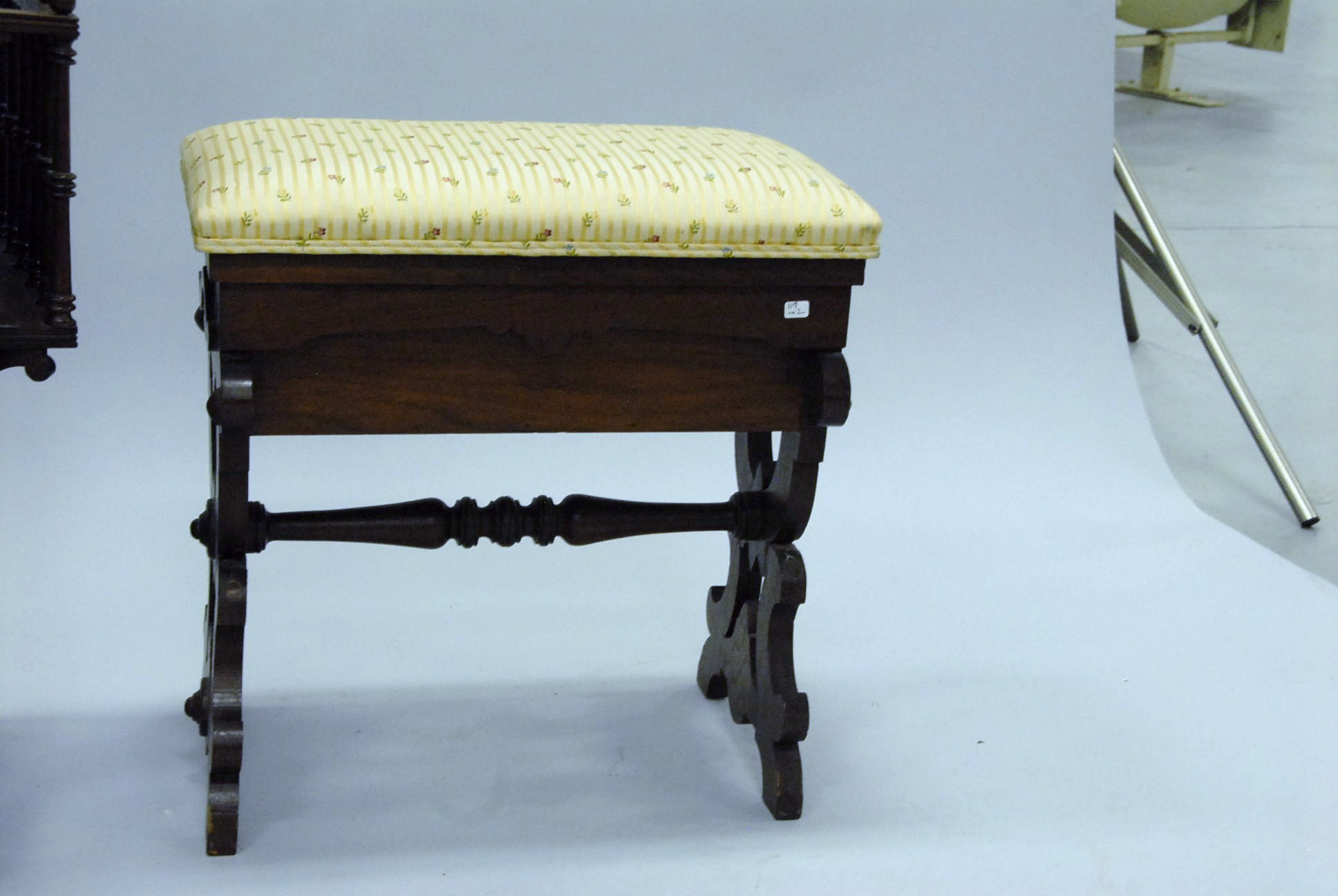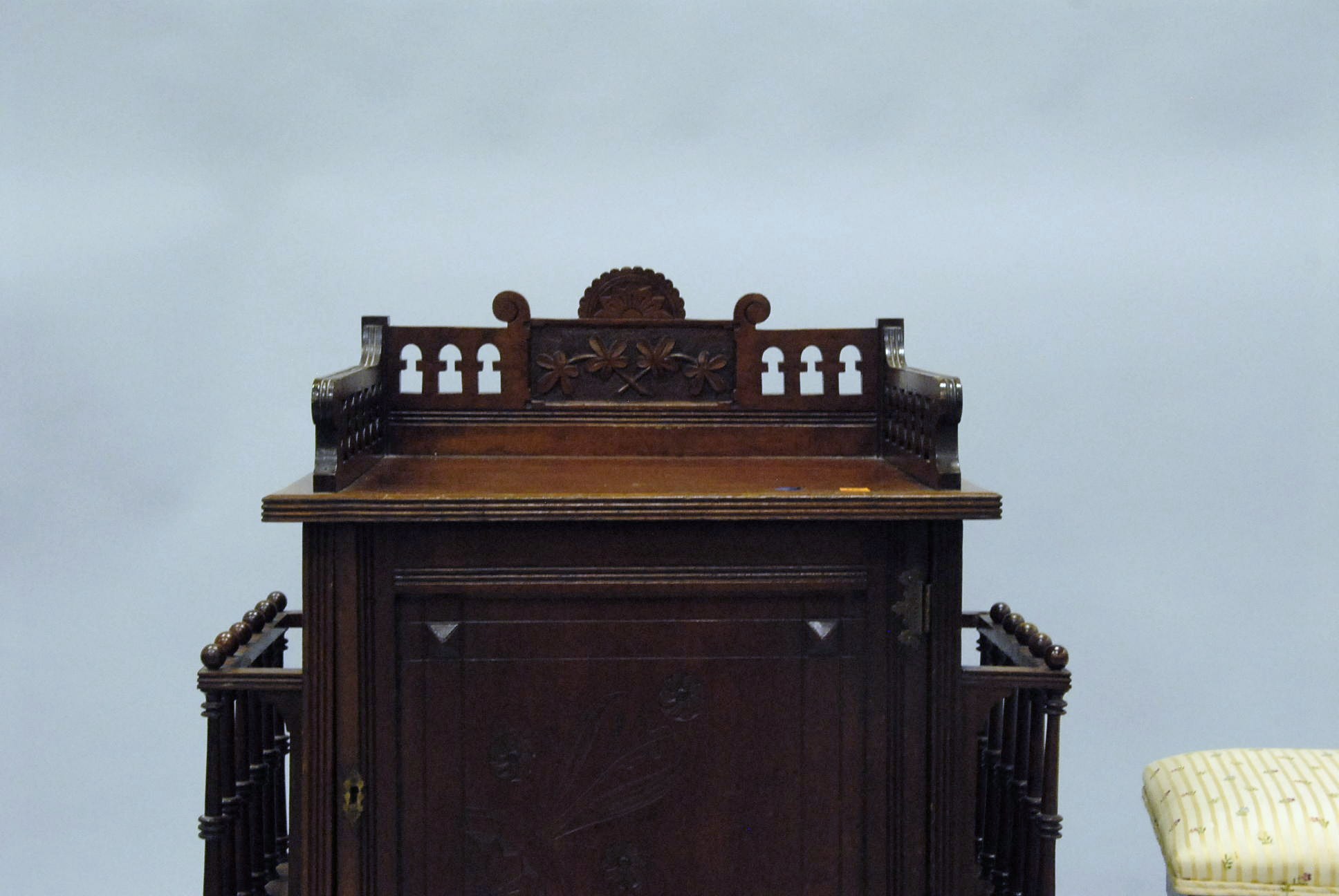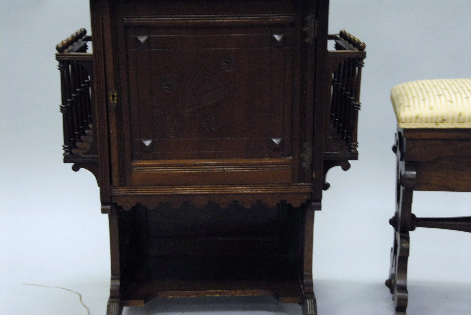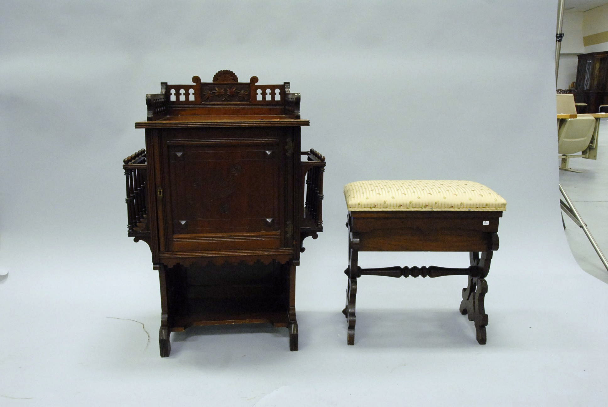 A two piece lot to include a cherry Victorian cabinet with a door and gallery plus an organ bench