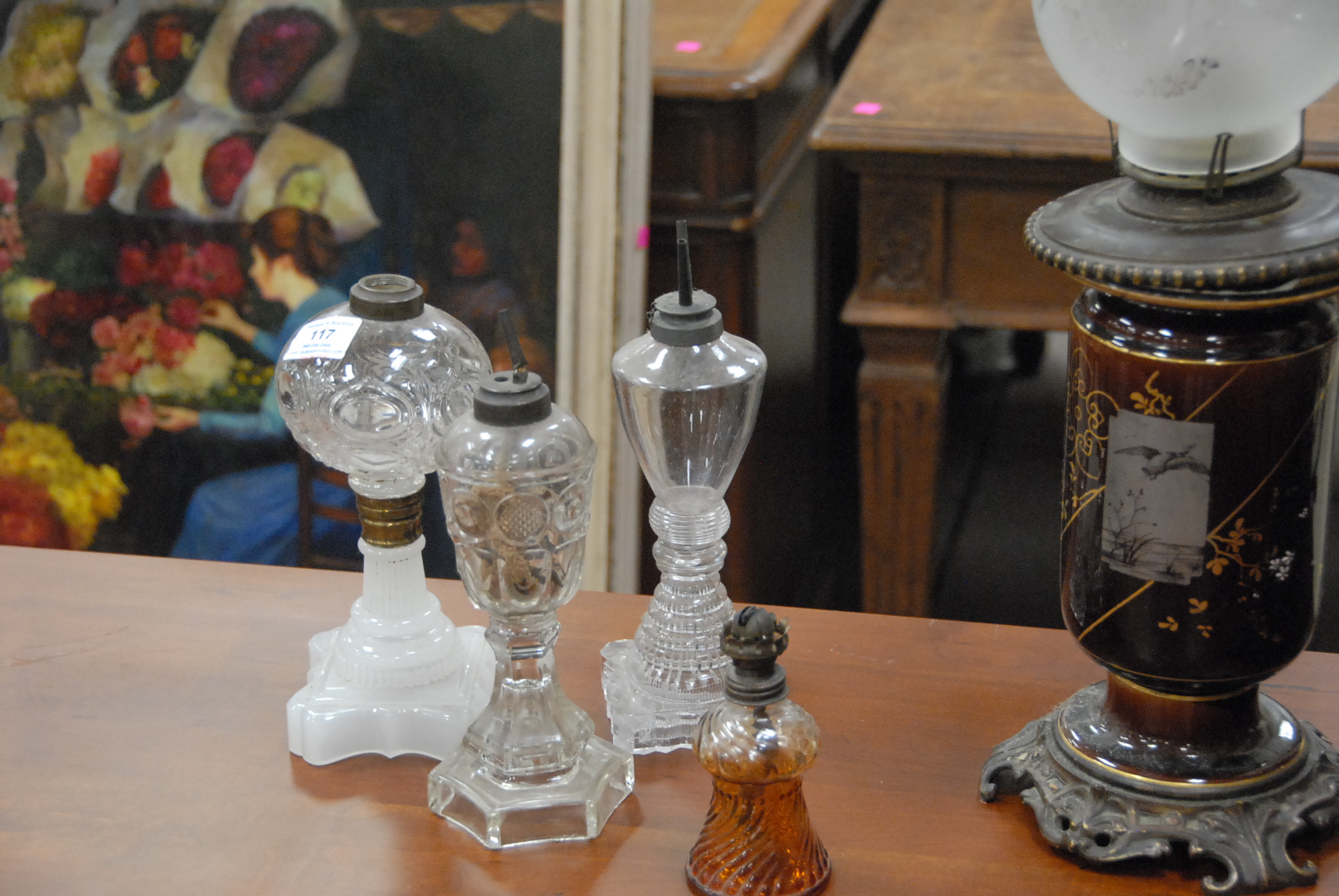 Eight lamps including 6 oil lamps one large with iron base, and two table lamps.