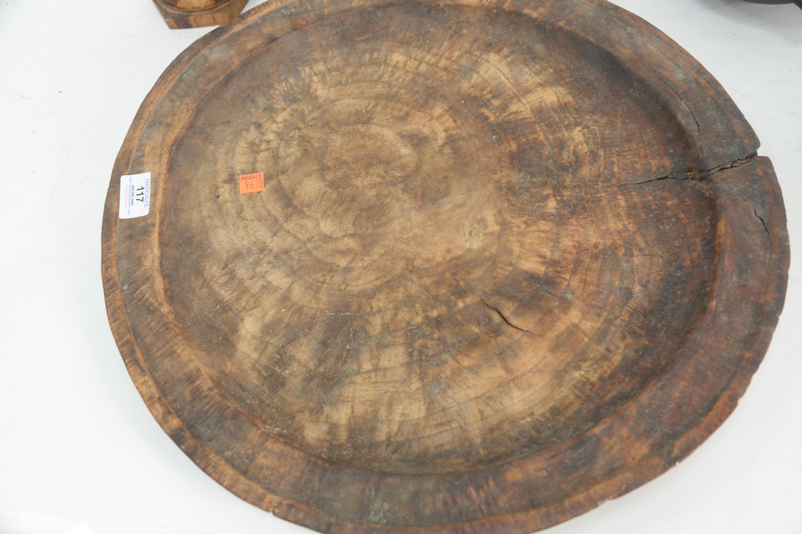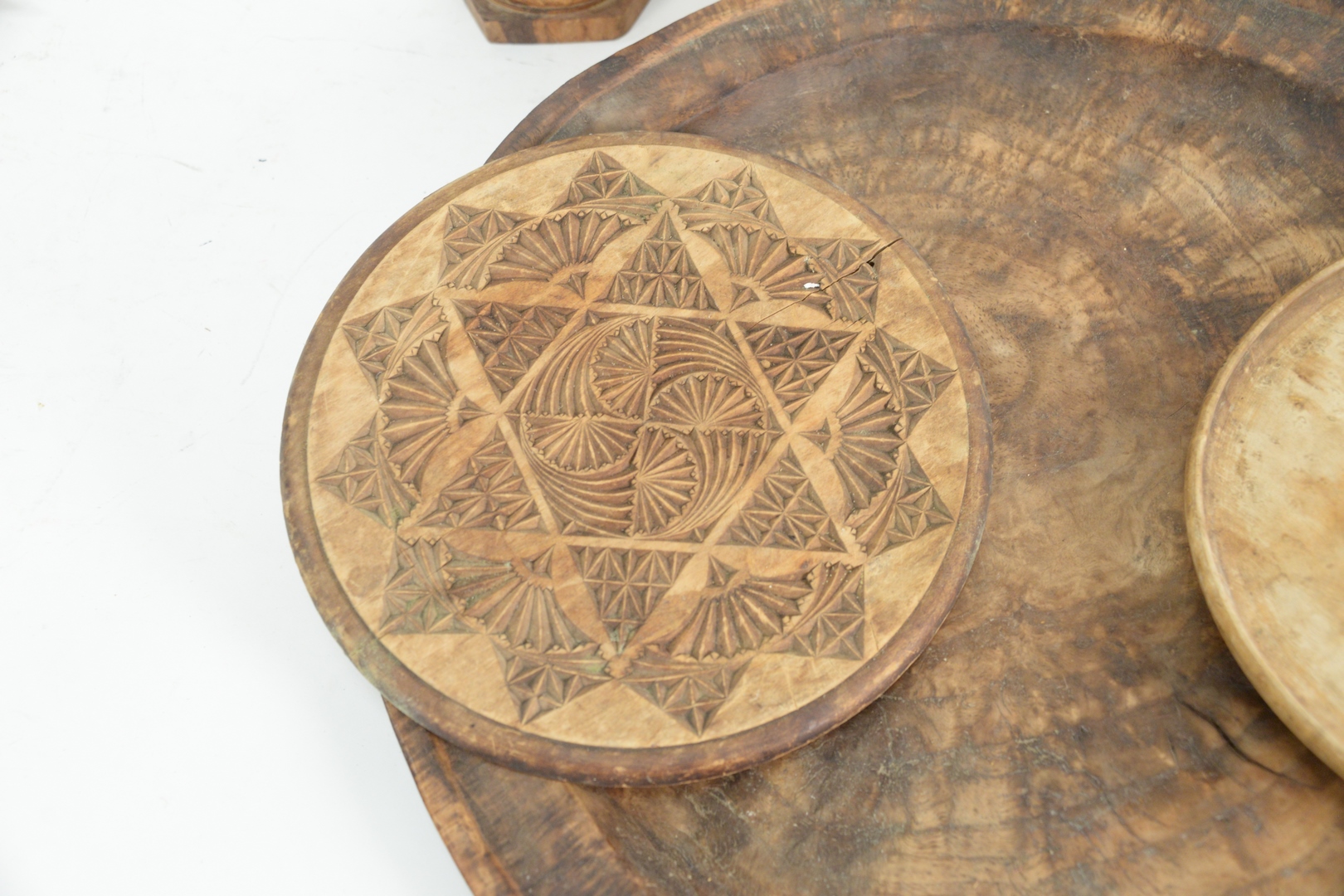 Lot 117: Eight Piece Group of Woodware to include a large burlwood treenware charger or serving plate, diameter 20 1/2 inches, small serving ladle, an American star butter mold, 10 3/8 x 10 5/8, burlwood dish with cupped edges, 2 covered containers, and a p