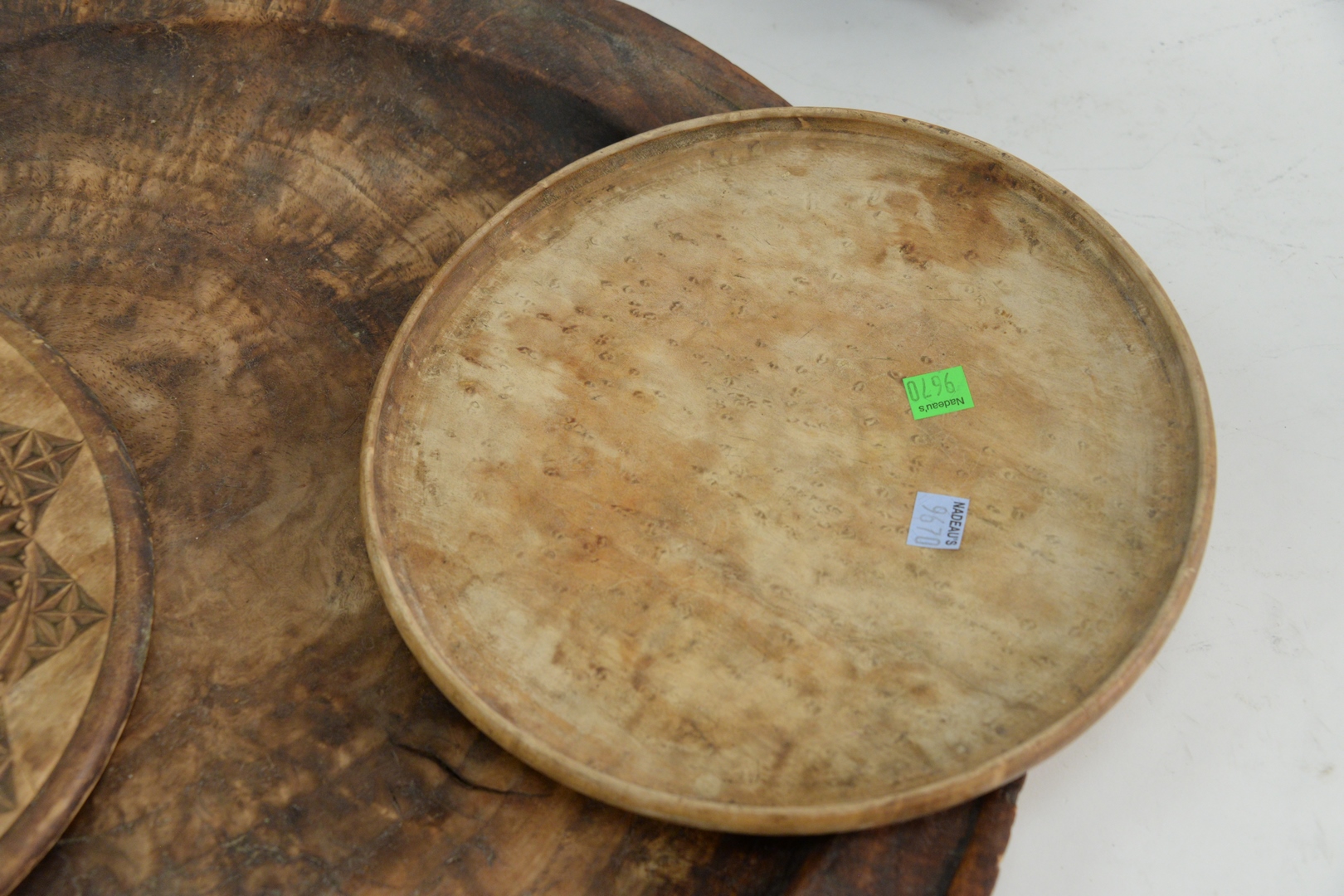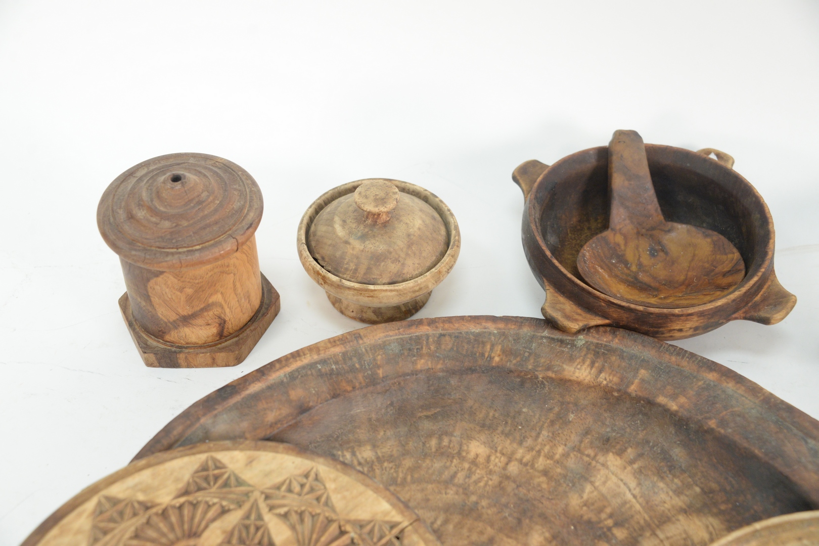 Eight Piece Group of Woodware to include a large burlwood treenware charger or serving plate, diameter 20 1/2 inches, small serving ladle, an American star butter mold, 10 3/8 x 10 5/8, burlwood dish with cupped edges, 2 covered containers, and a pair of treenware bowls with handles. Provenance: The Estate of Diana Atwood Johnson.