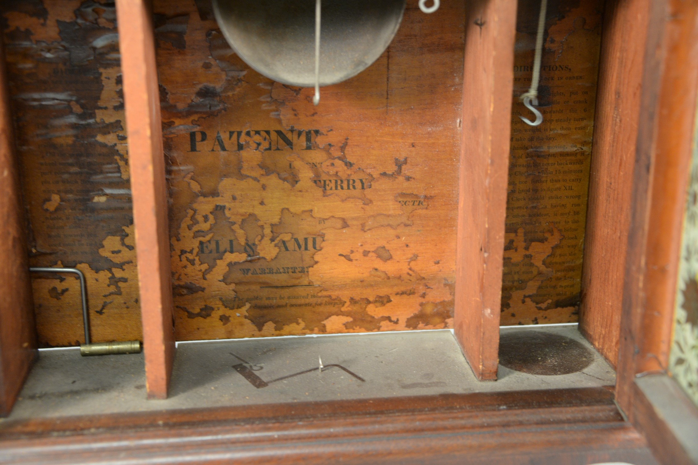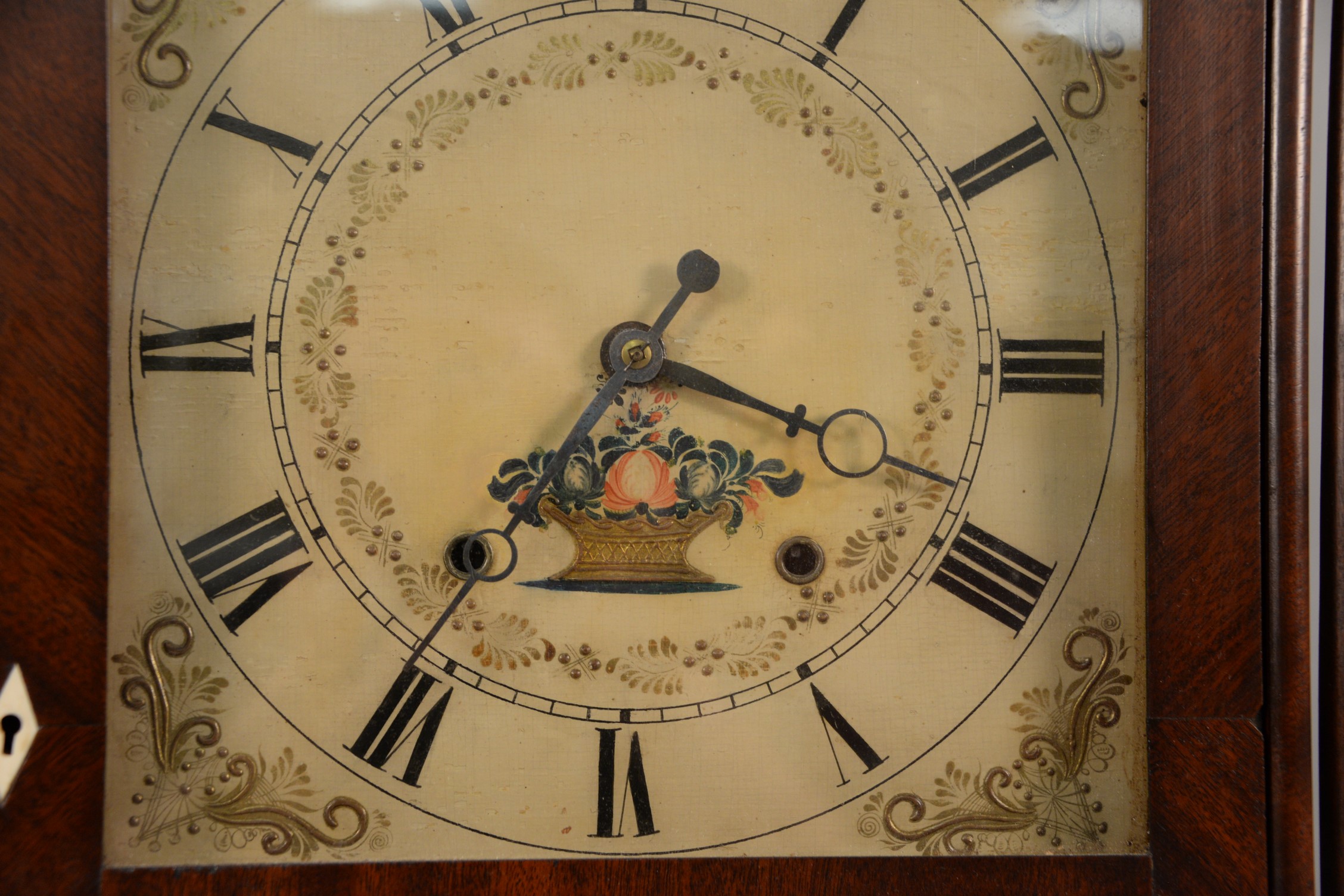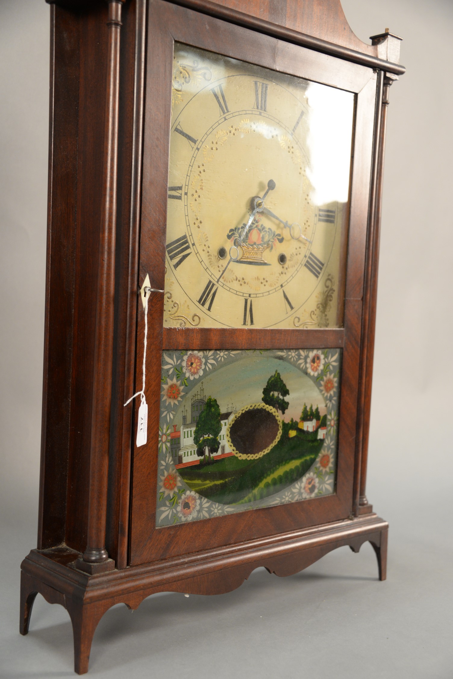 Federal mahogany pillar and scroll clock having scenic eglomise panel. 25 1/2 x 20