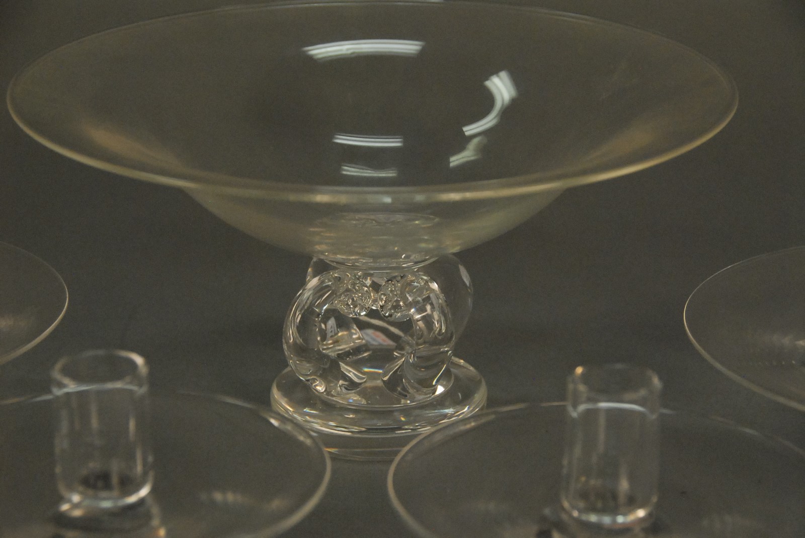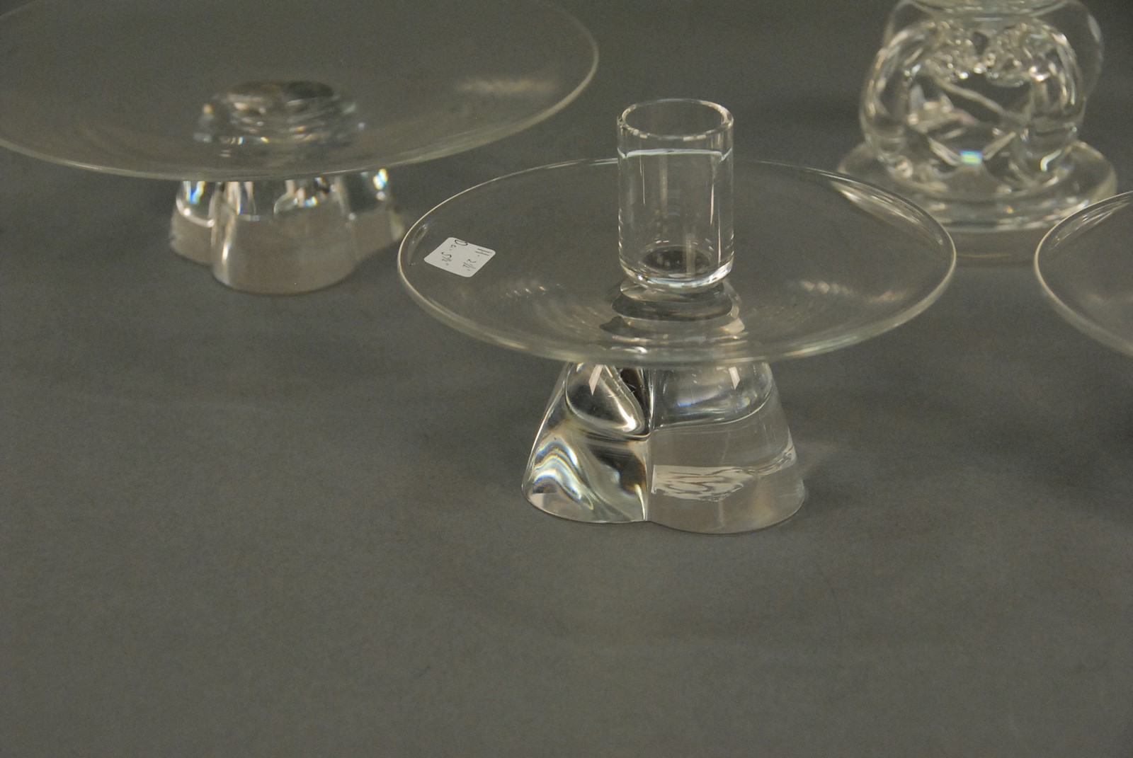 Five piece Steuben lot to include two candle holders, two tazzas, and a compote