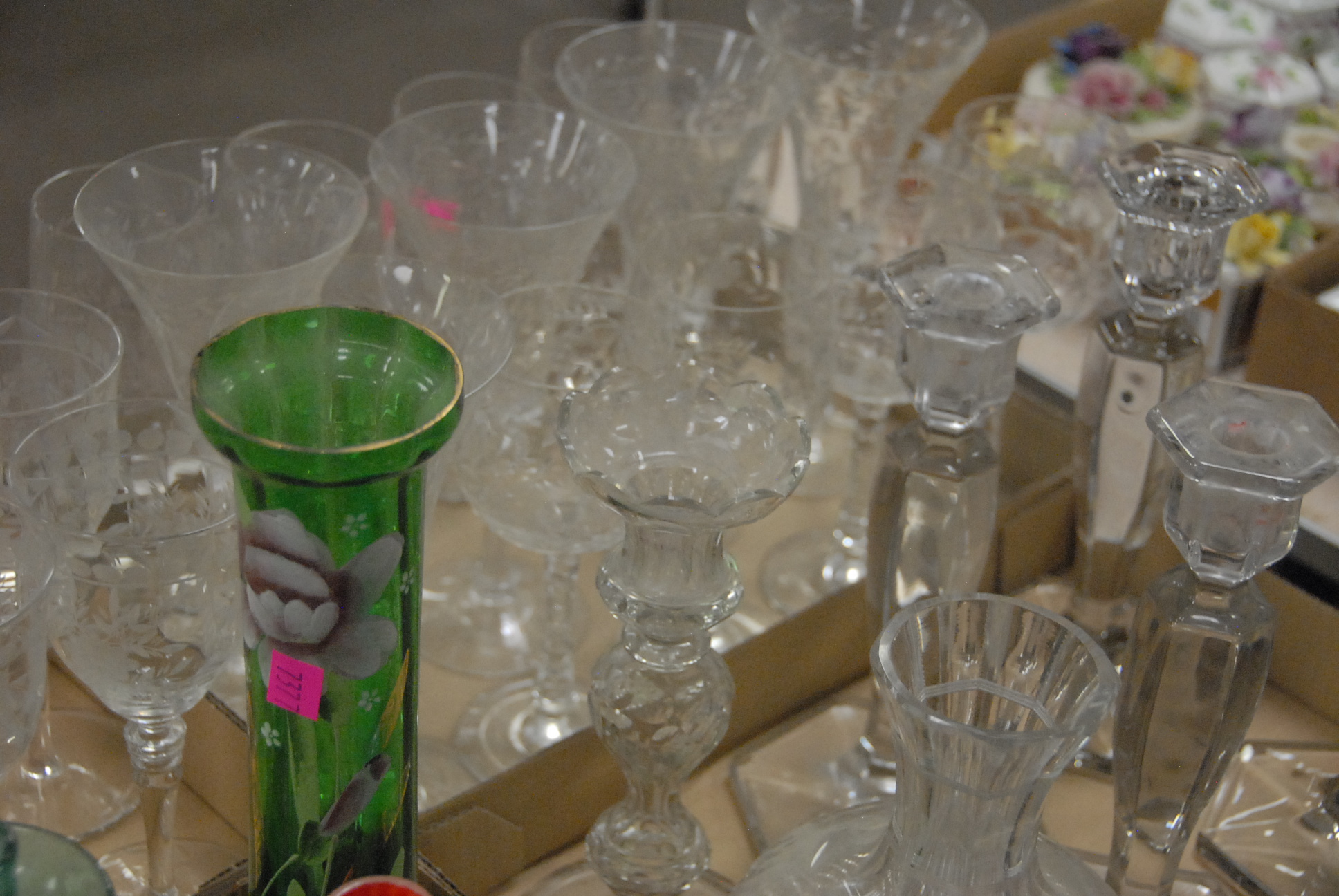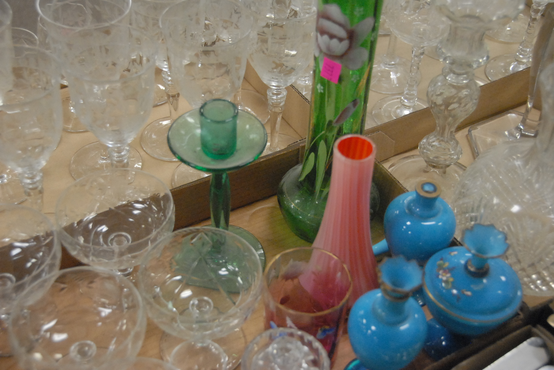 Four box lots of crystal stems, candlesticks, cranberry tumbler, vases, etc.