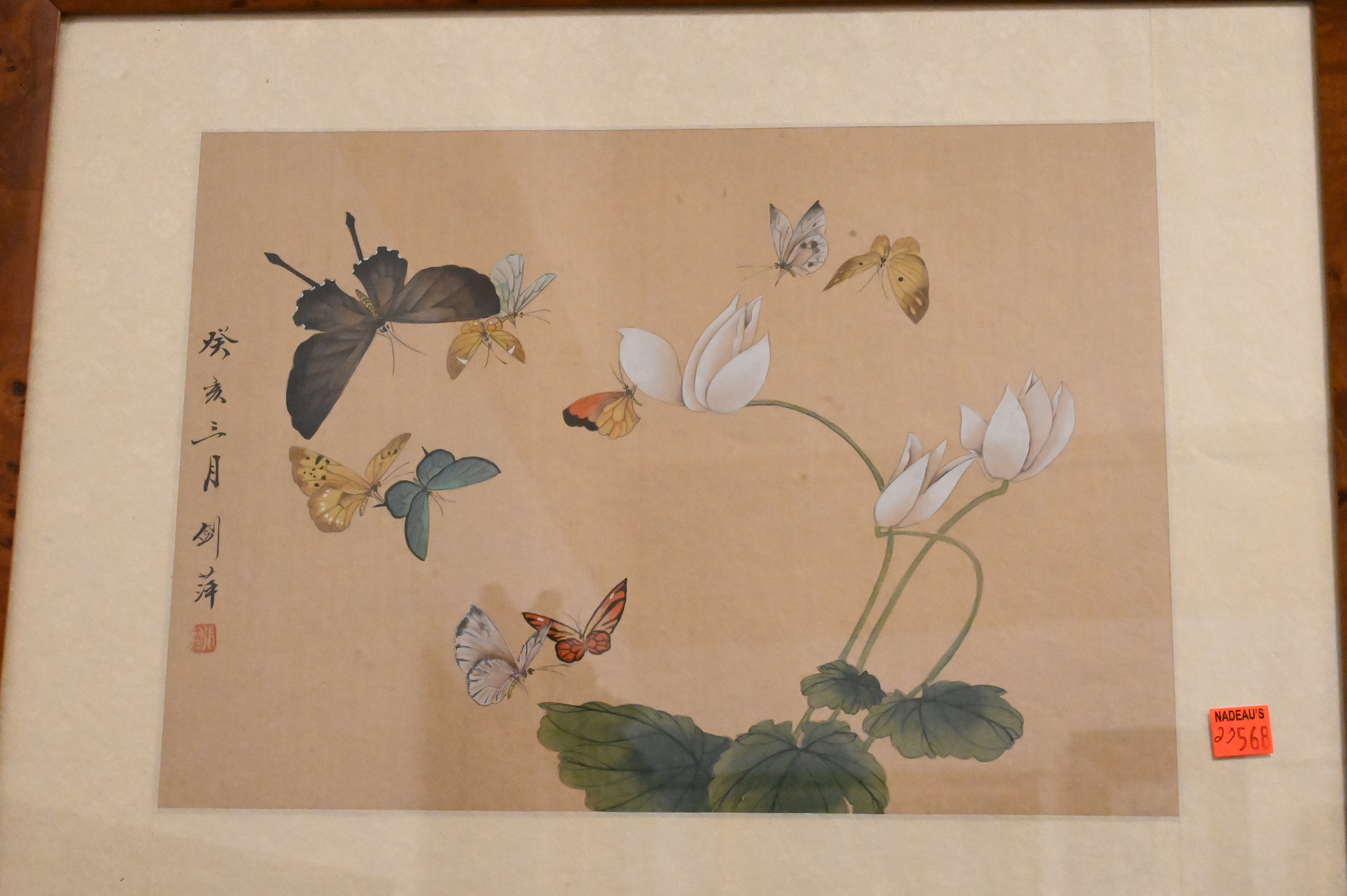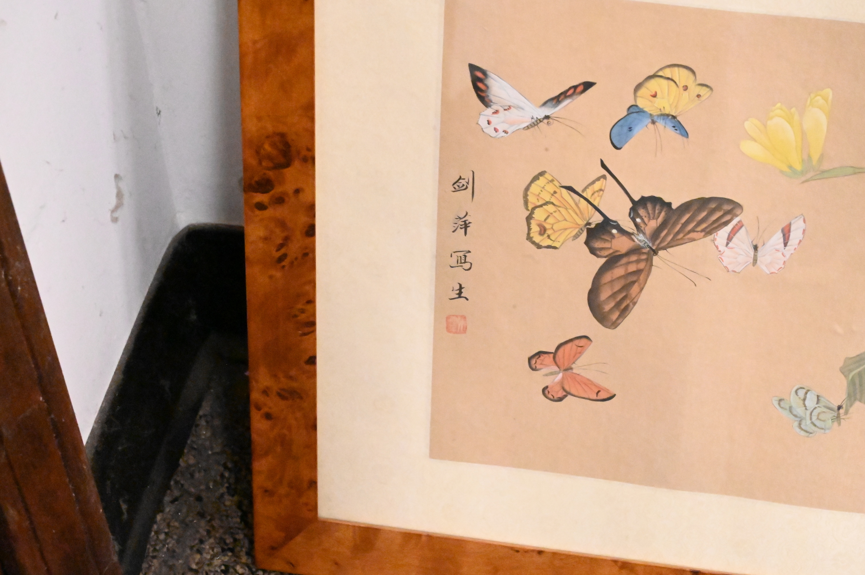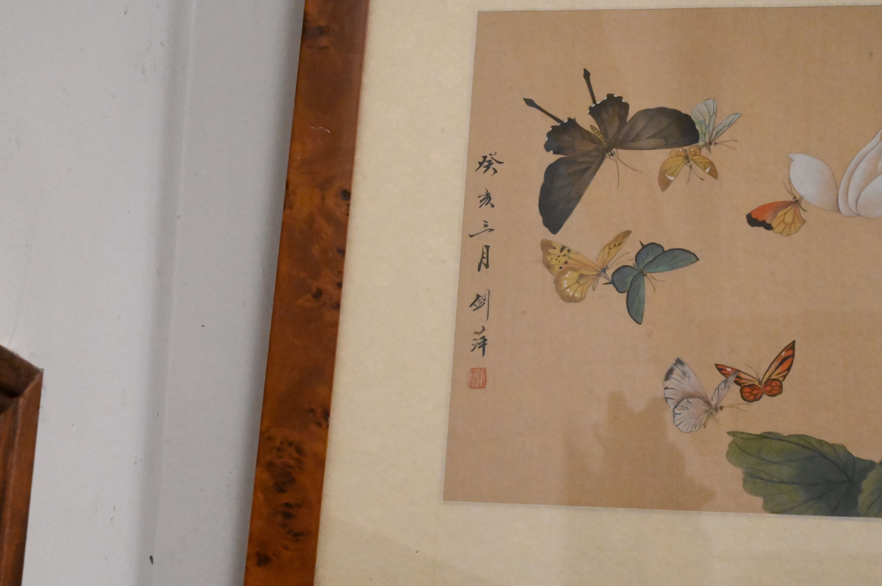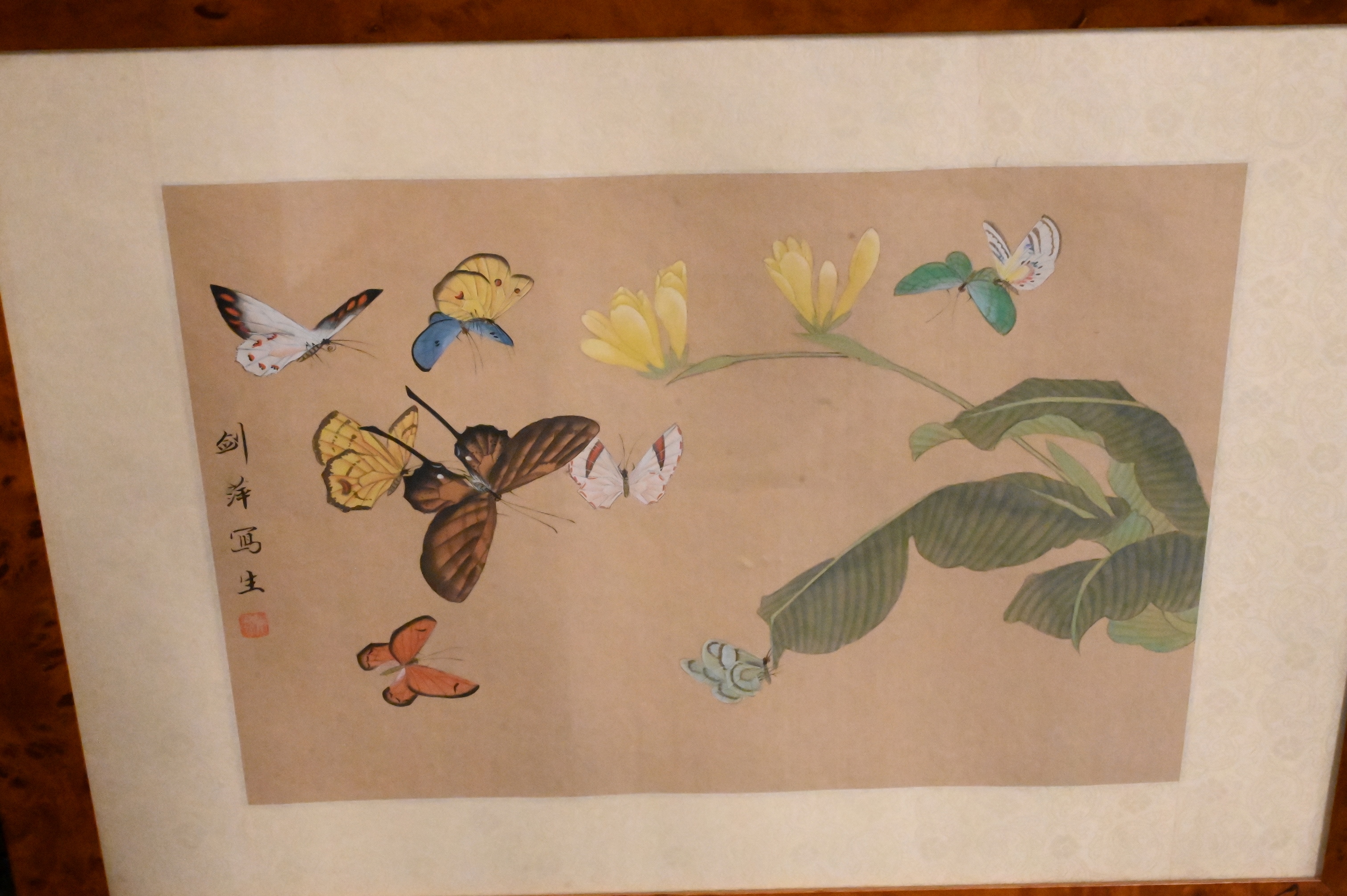 set of four Chinese framed watercolors of butterflies and flowers, watercolor and gouache on silk in burlwood frames, character marks to left of border