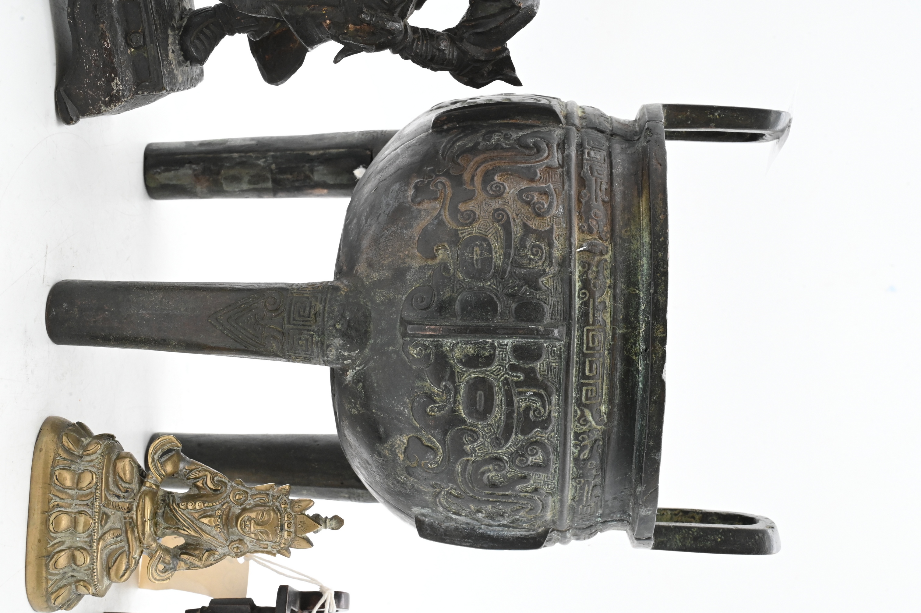 to include tripod censer in the form of a ding having relief decoration and loop handles, a standing figural sculpture depicting a robed male figure on integral base, a small seated deity figure, and a miniature ewer having openwork sides