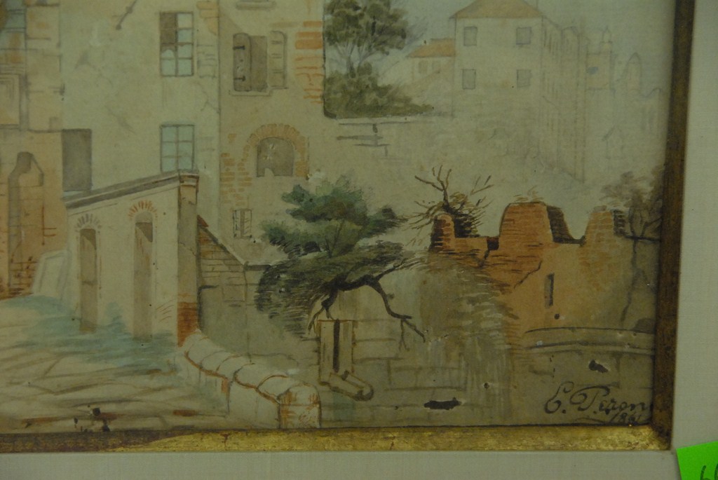 Lot 117: Framed watercolor, view of Provincial Italian village, signed and dated Peroni 1861, 7 x 11 1/2.
