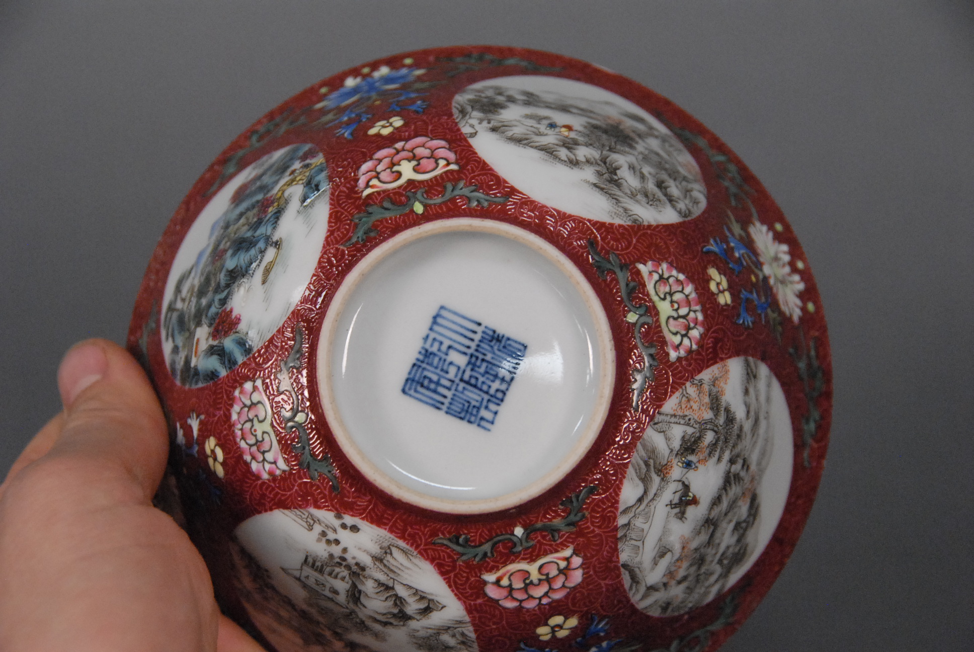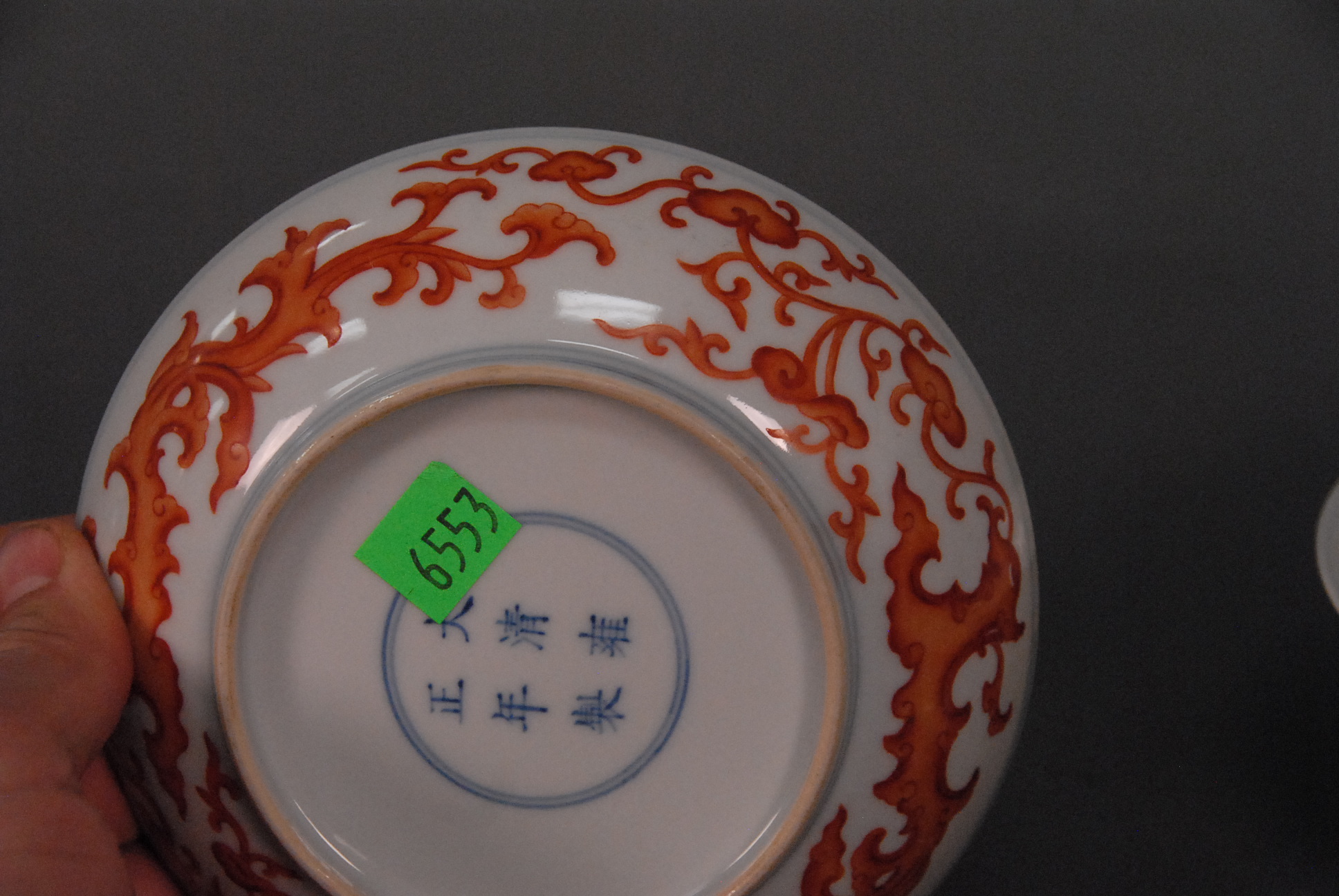 Group of five Oriental porcelain items small pair of five claw dragon dishes with six character mark on bottom dia. 4 1/4in. pair of porcelain foo dragon dishes marked with Yongcheng mark on bottom dia. 6in. and Famille rose bowl with Qianlong mark ht. 2 1/2in. dia. 6in.