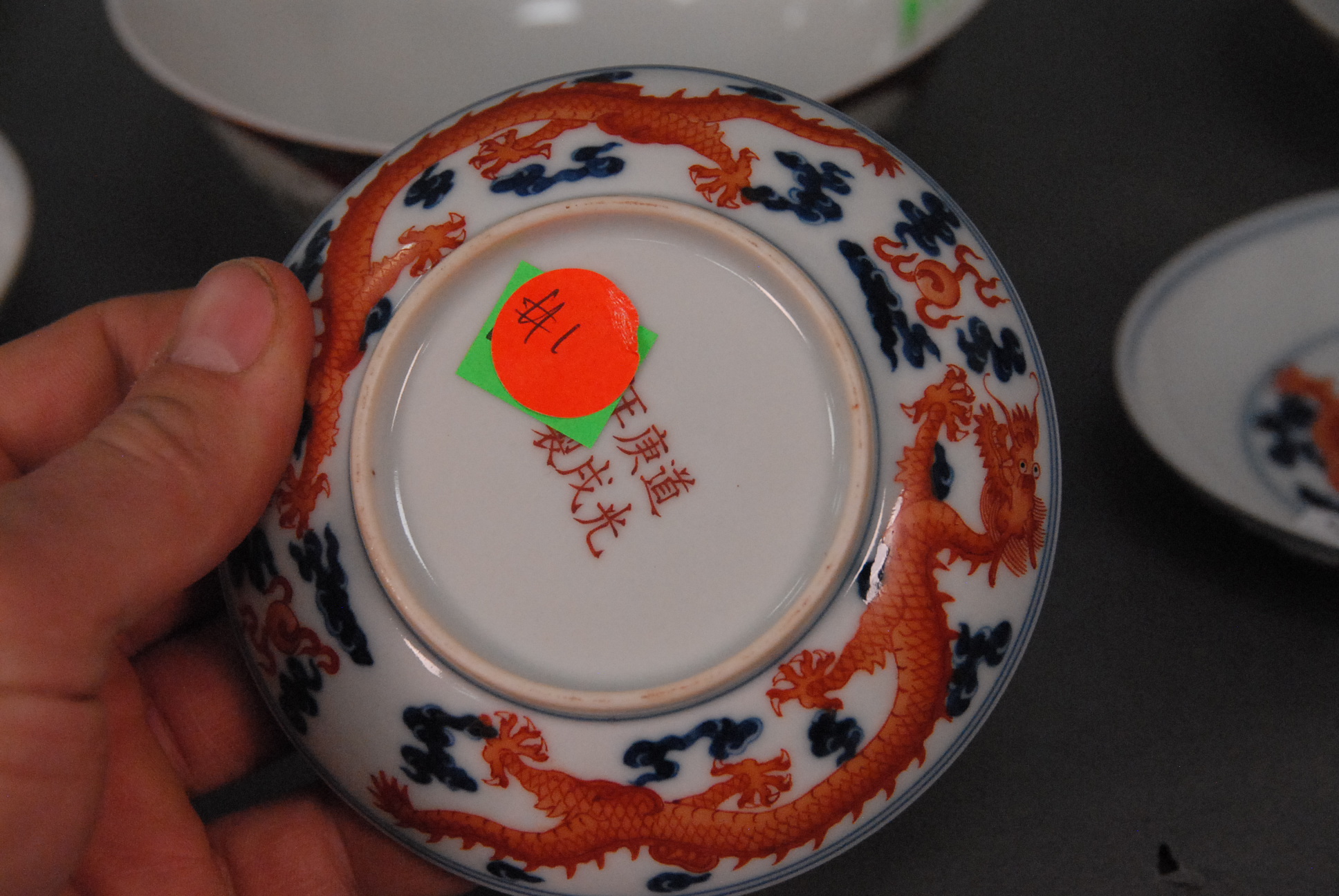 Lot 117: Group of five Oriental porcelain items small pair of five claw dragon dishes with six character mark on bottom dia. 4 1/4in. pair …
