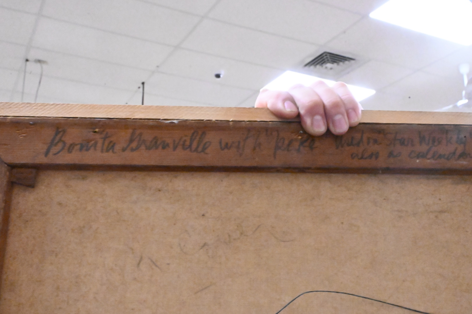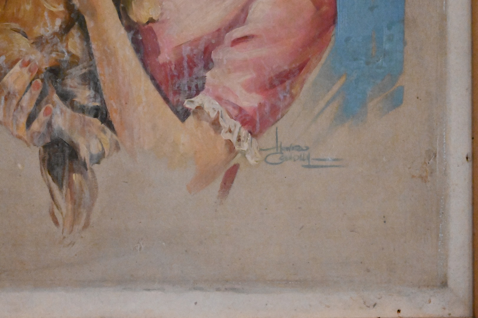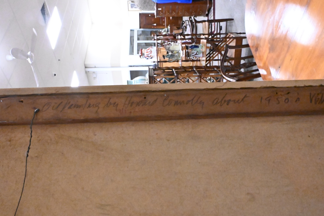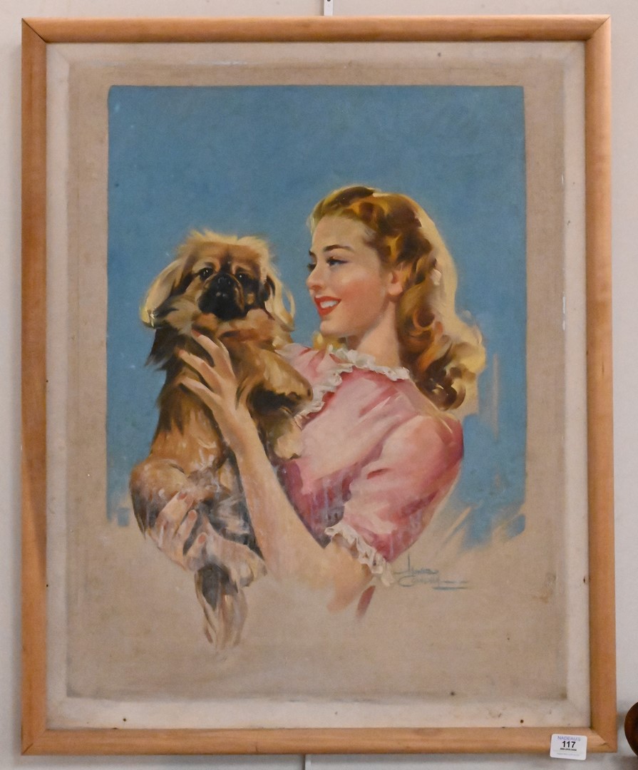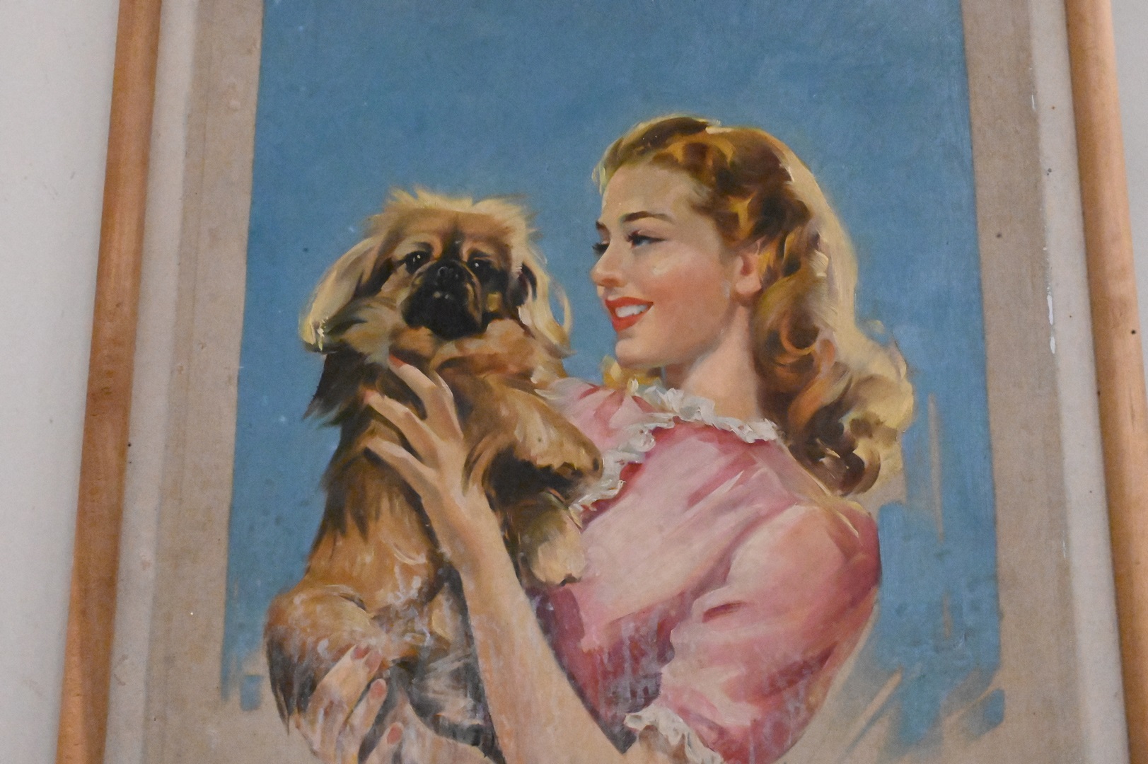 Howard Connolly (American, 1903 – 1990), Bonita Granville with Dog, oil on canvas, signed Howard Connolly lower right, signed and titled on verso, 24″ x 30 1/4″.
