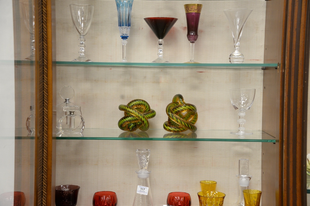 Lot 117: Large Glass Lot, to include six St. Louis colored glass stems; two Waterford stems; two colored glass knots; two decanters, one havi…