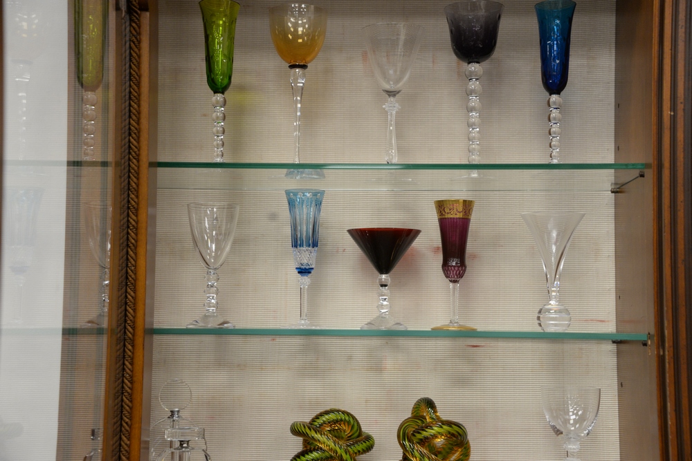 Large Glass Lot, to include six St. Louis colored glass stems; two Waterford stems; two colored glass knots; two decanters, one having an air twist stopper; a Moser champagne; an edgar limited edition cordial, along with several other pieces, height 13 1/2 inches, Provenance: David and Cynthia Kim, 22 Stoney Wylde Lane, Greenwich, Connecticut. View home by visiting: https://www.zillow.com/homedetails/22-Stoney-Wylde-Ln-Greenwich-CT-06830/177238281_zpid/.