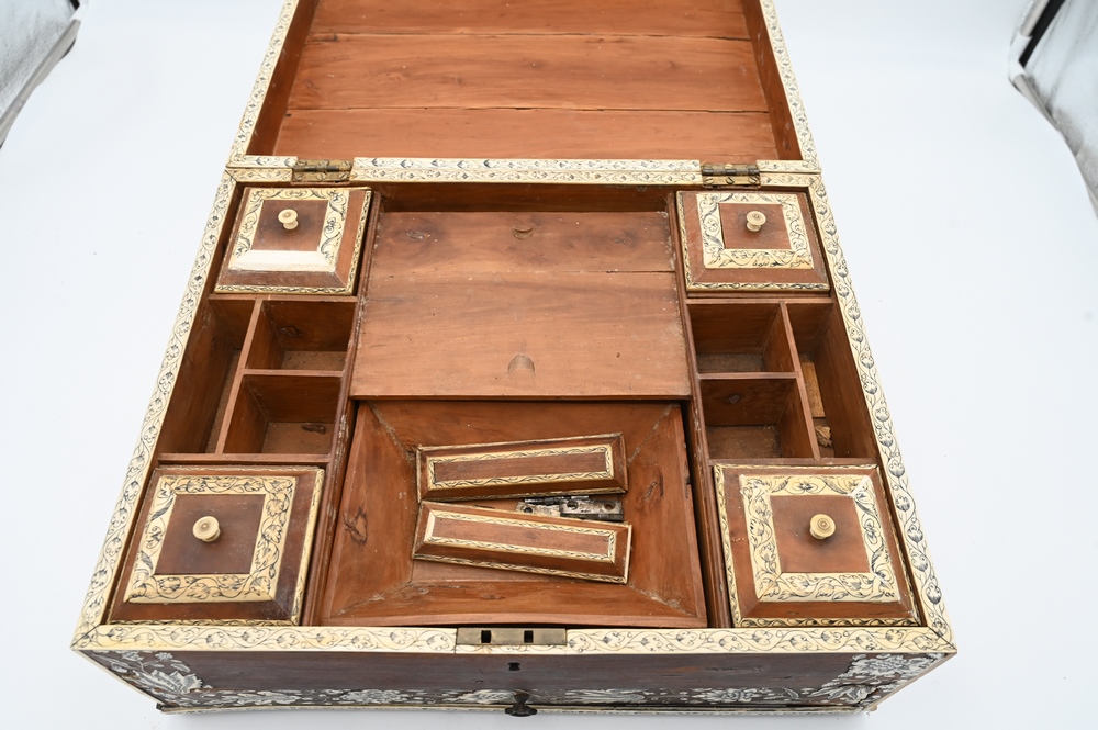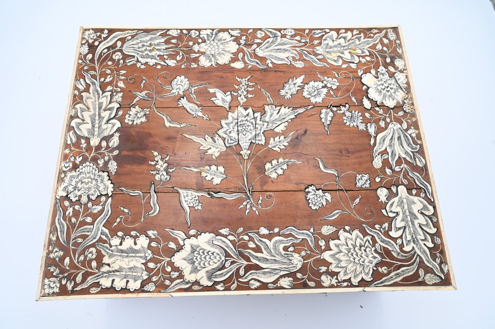 Mahogany Inlaid Lap Desk, having ivory inlaid blossoming flowers and vines, opening to a fitted interior, height 7 1/2 inches, top 12 1/2″ x 16″. Please note: Items containing ivory cannot be purchased or shipped by bidders residing outside of the United States or California, Hawaii, Nevada, New Jersey, New York, Washington, Oregon, or District of Columbia. If an ivory item is purchased by a bidder in one of the above mentioned locations or attempts to ship ivory to one of the above mentioned locations, bidder will forfeit the item and be responsible for any incurred fees such as a restocking fee.