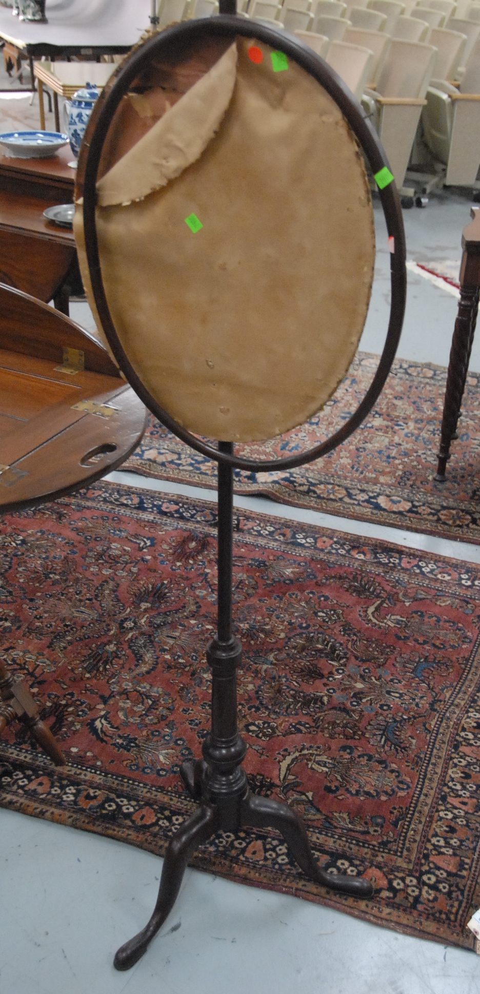 Mahogany pole screen with oval screen on turned shaft with tripod base. oval screen: 21 x 16 1/2 total ht. 60 1/2 in. Provenance: Property from a Private Collection Sold for the Benefit of the Virginia Historical Society.