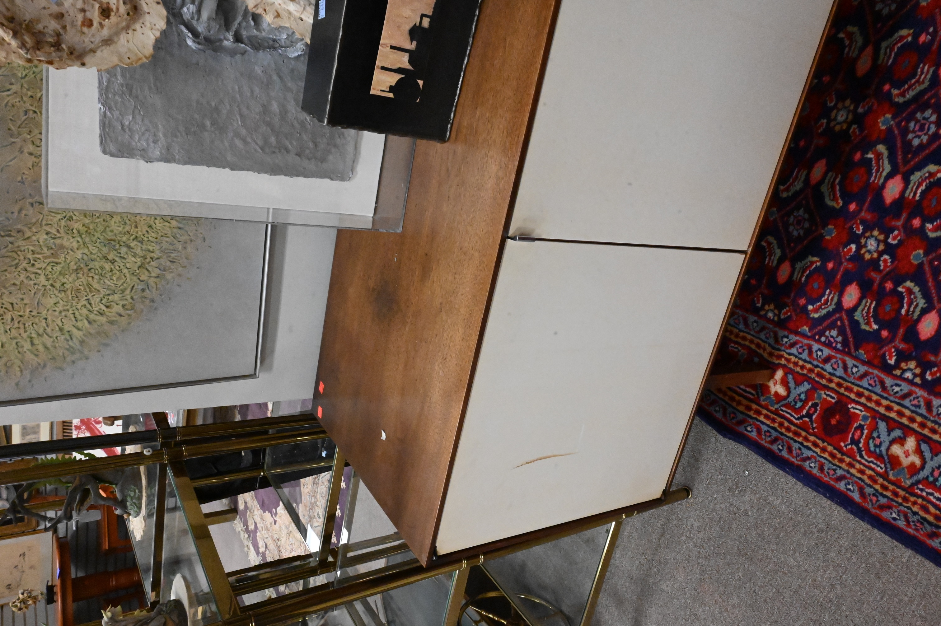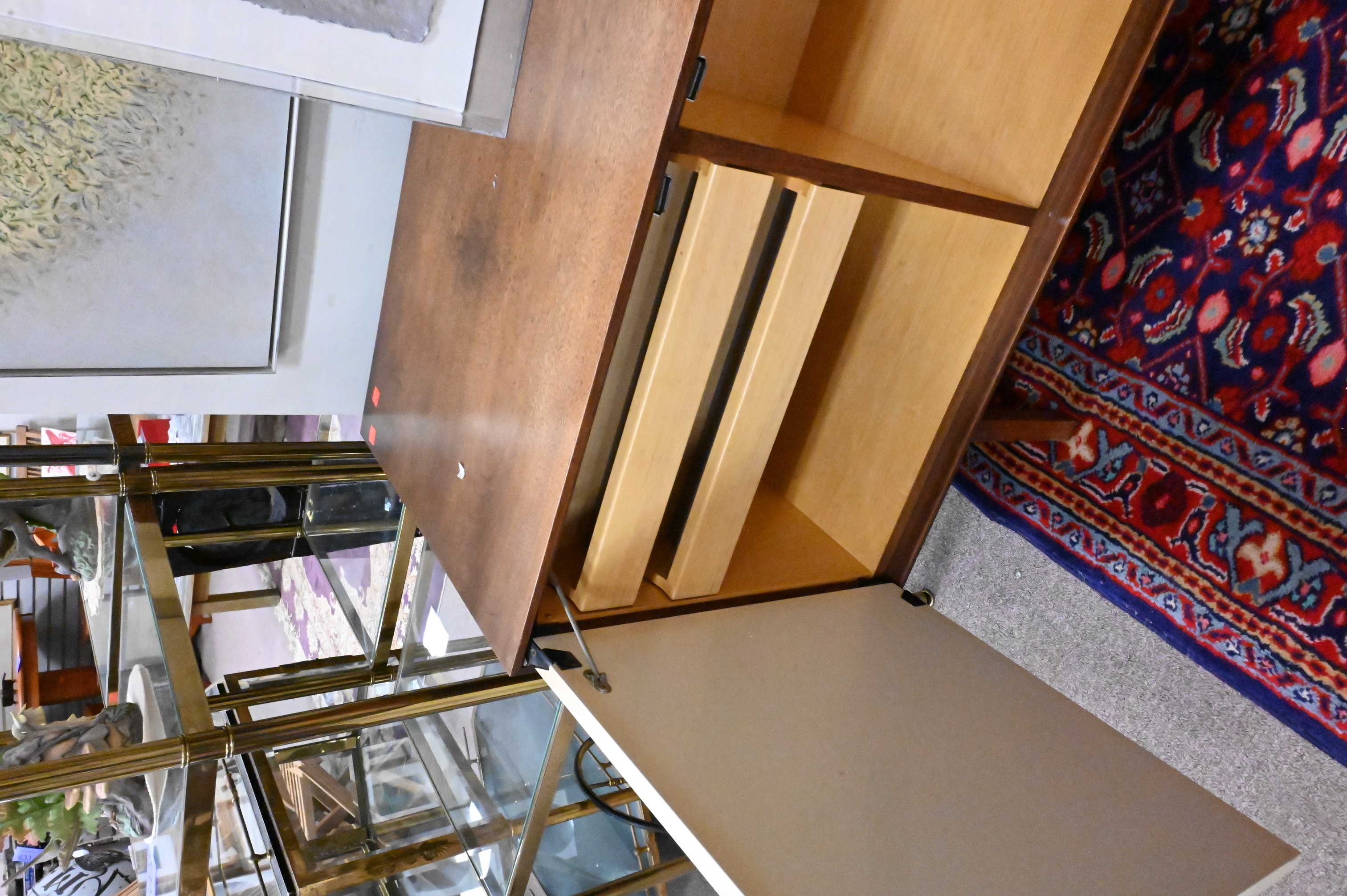 walnut and white laminate, four doors with chrome hardware opening to silverware drawers and adjustable shelves