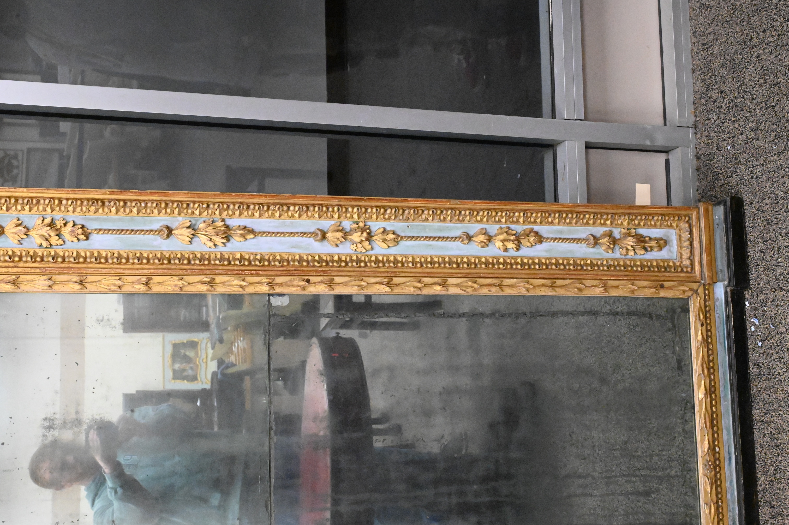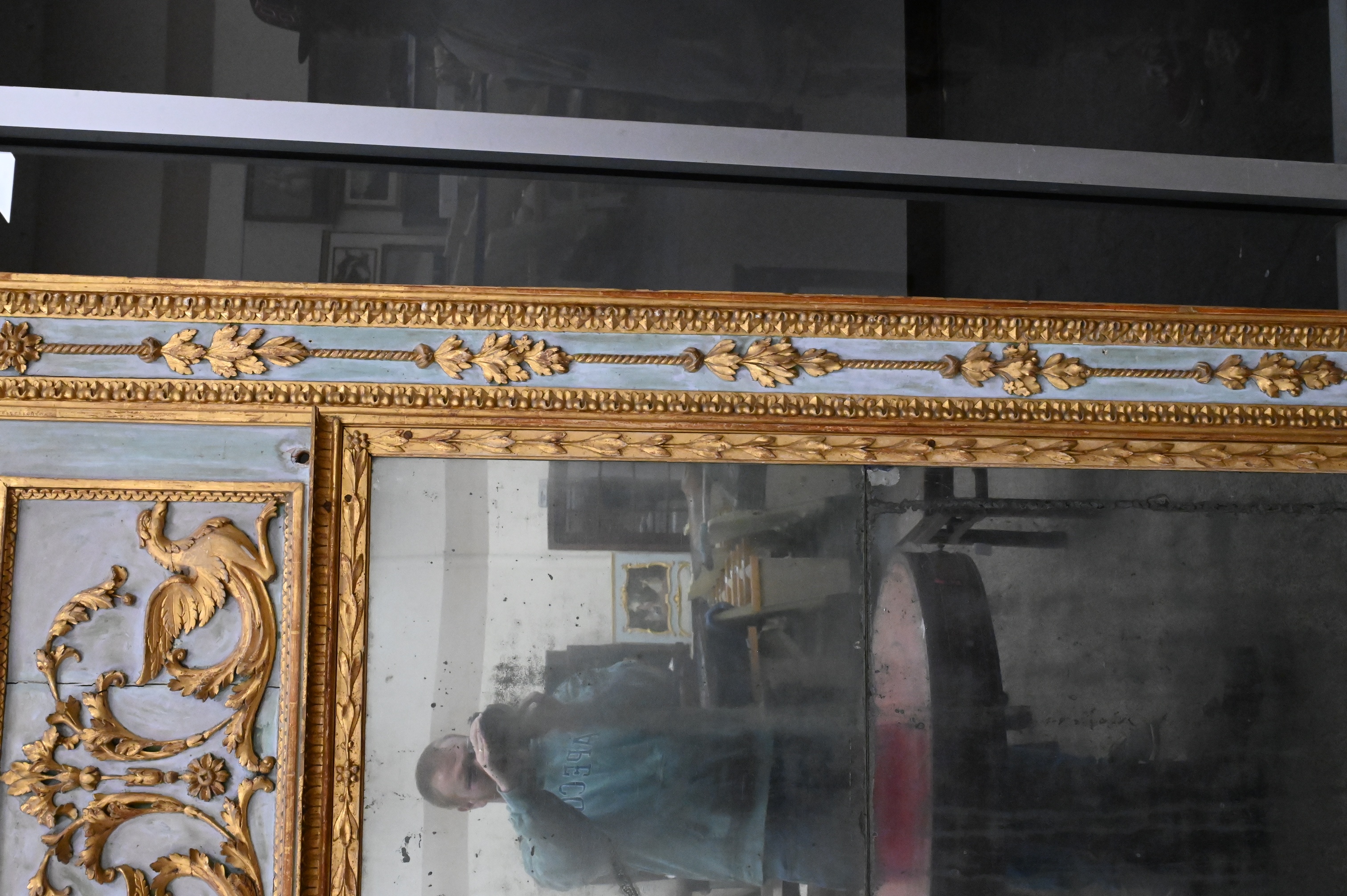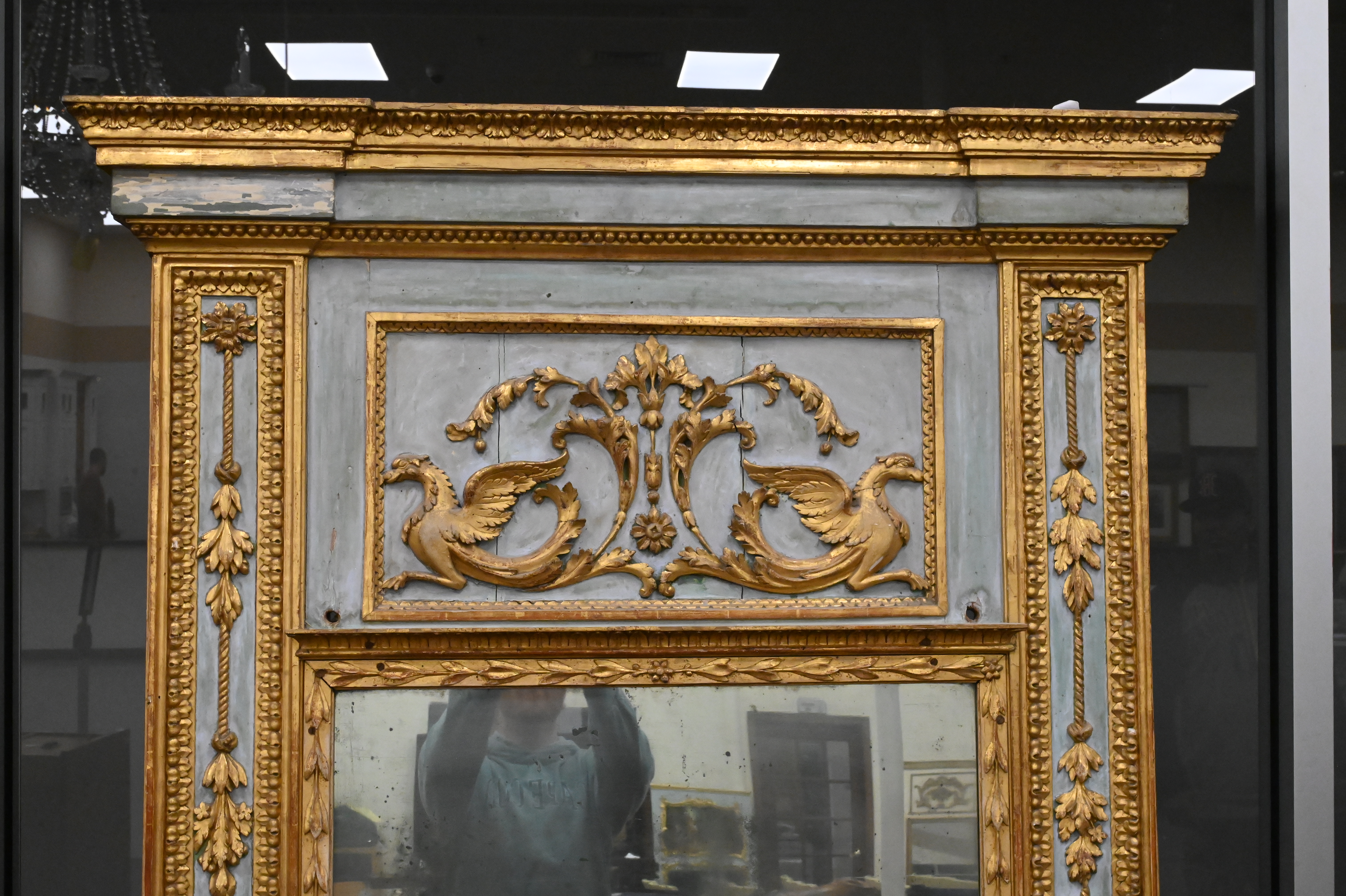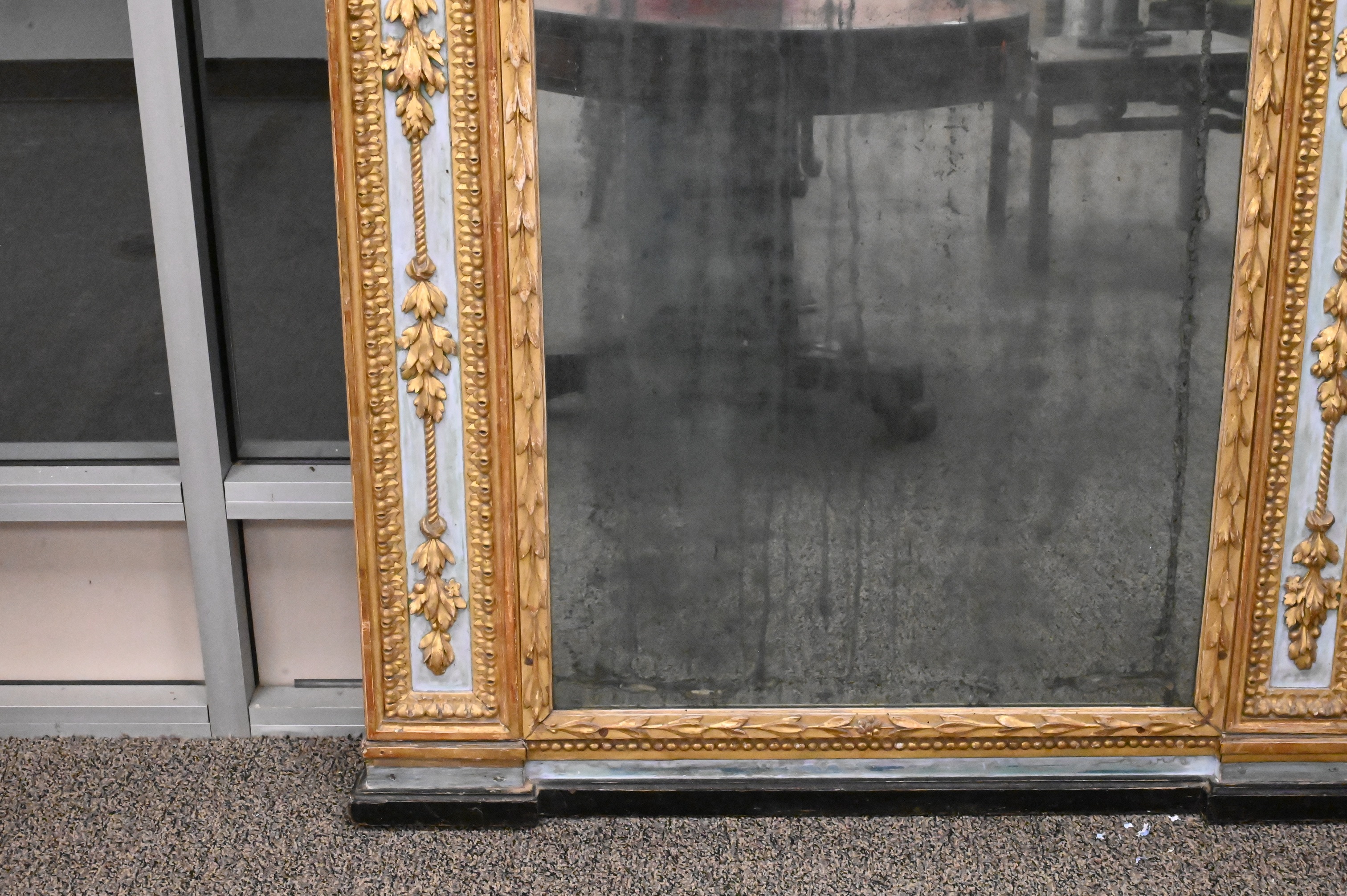 pale blue painted wood having ornately carved giltwood details, central motif of two winged griffins flanked by column form border having rope and bell flower vertical motif centered by a two paneled full length mirror, 18th / 19th century