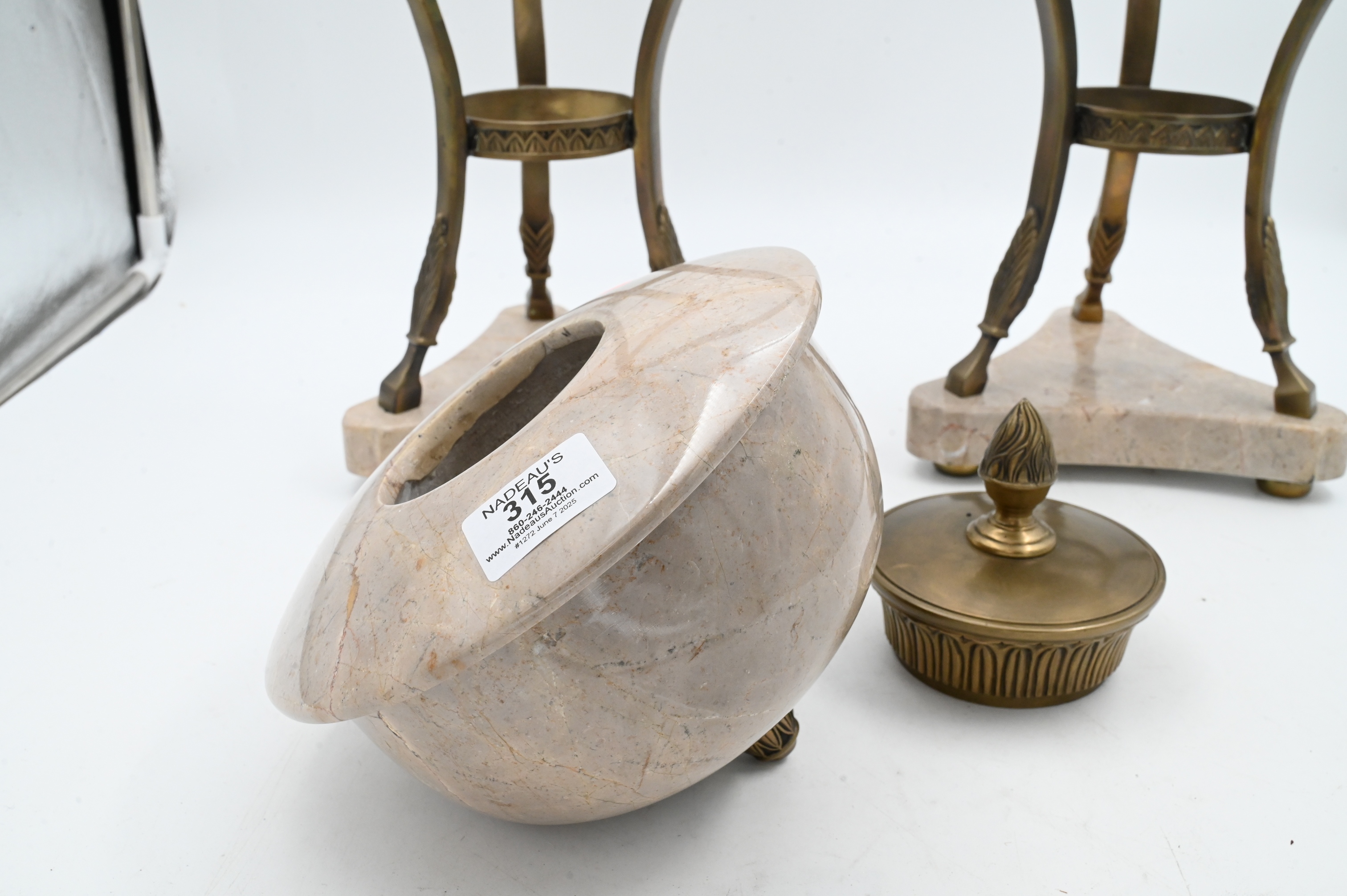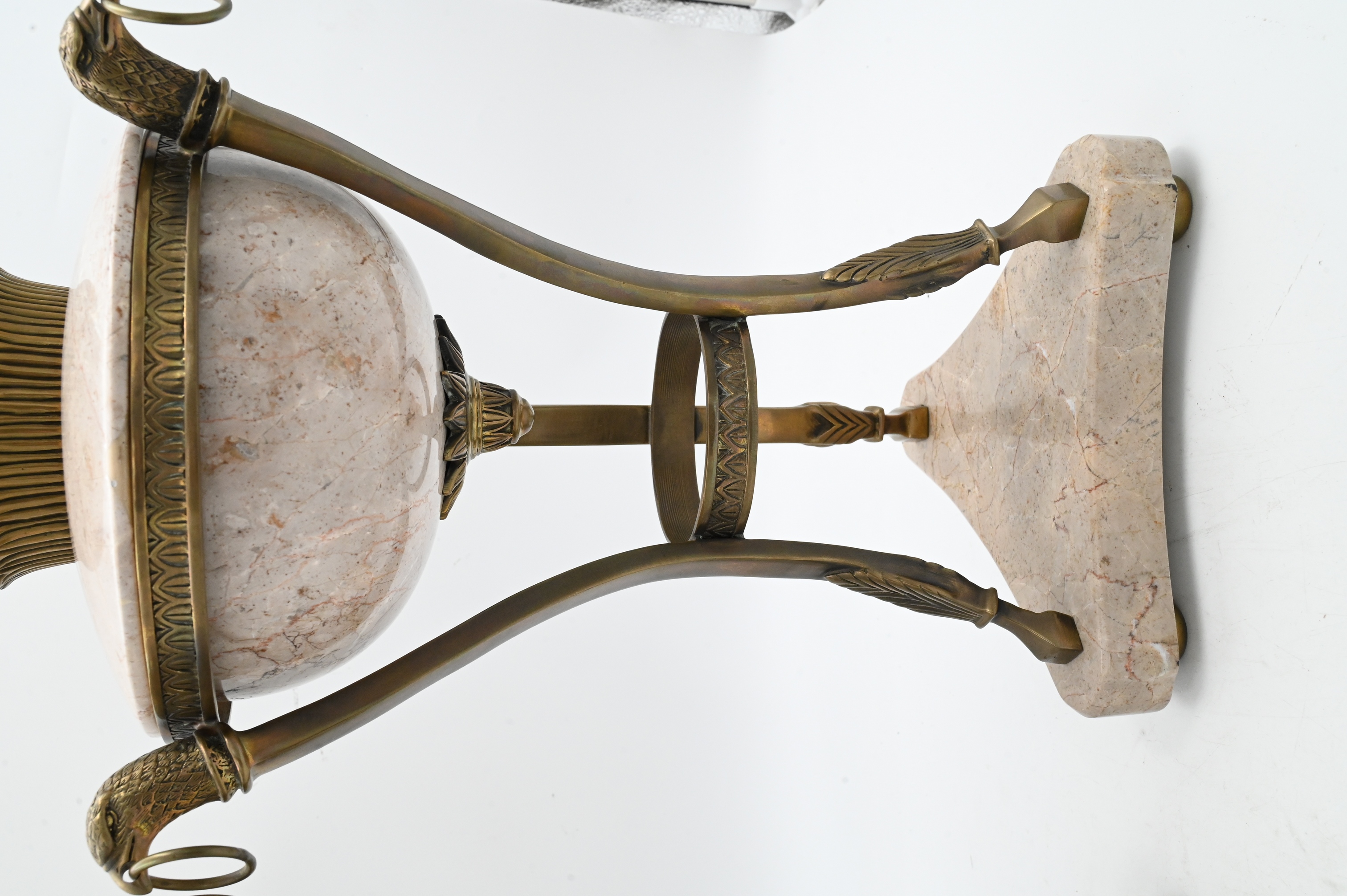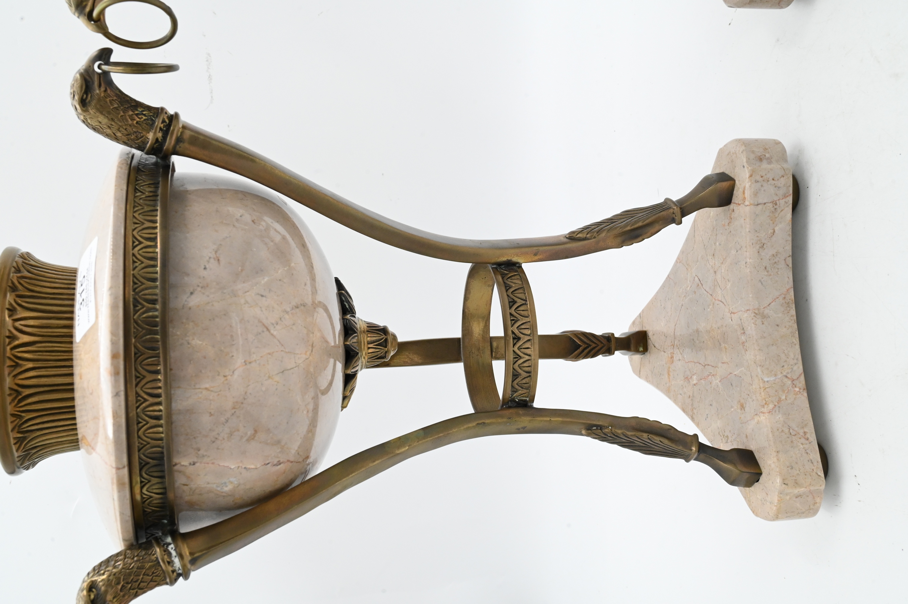 having brass mounts with eagle faces and rings, surmounted by flame finial lid over tripartite marble base