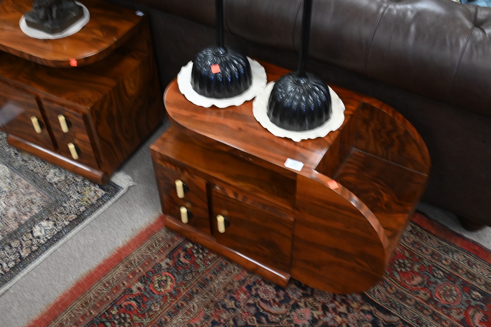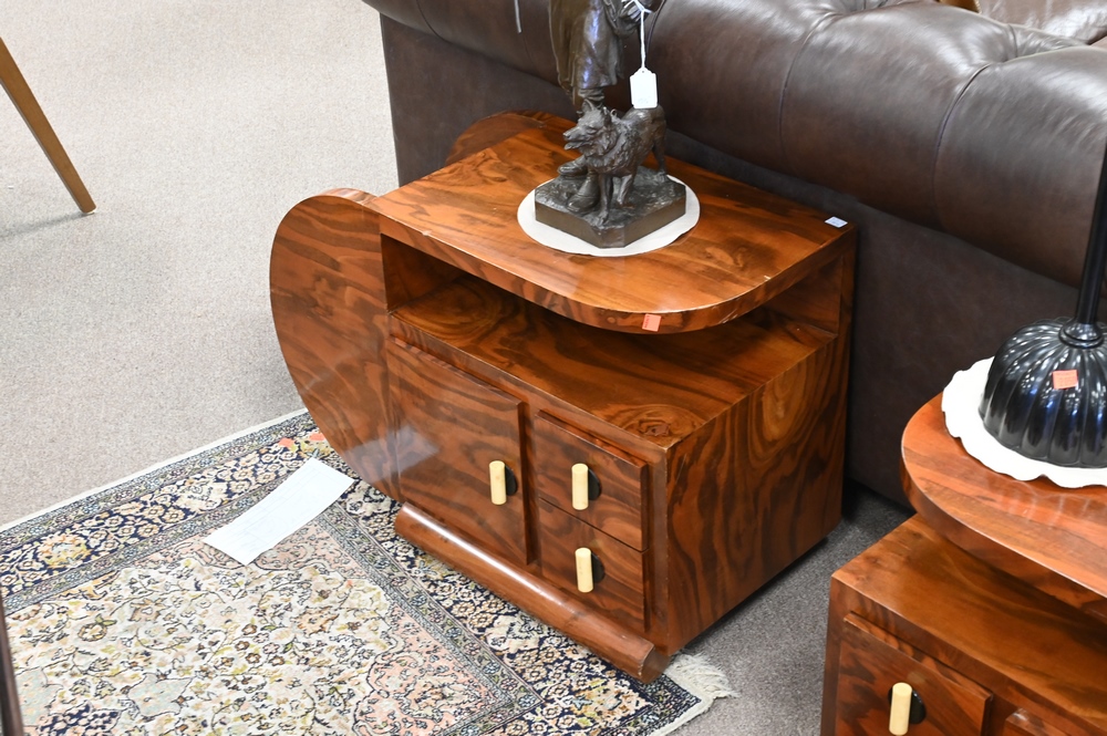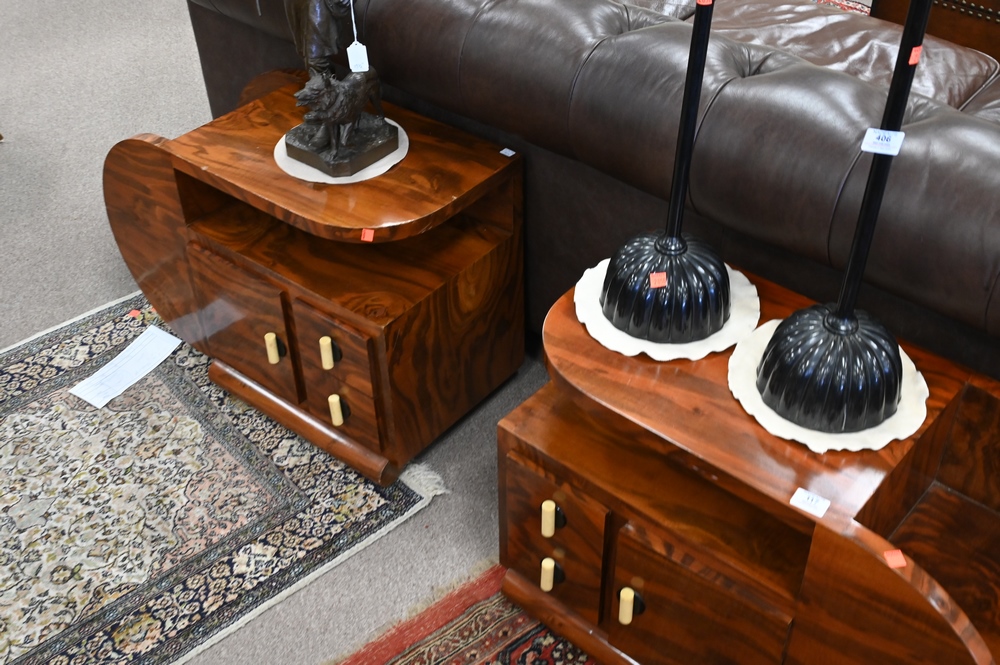 Lot 117: Pair of Art Deco Side Tables, with shaped tops over one door and two drawers each, height 20 inches, top 19.5 inches