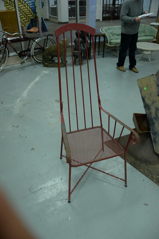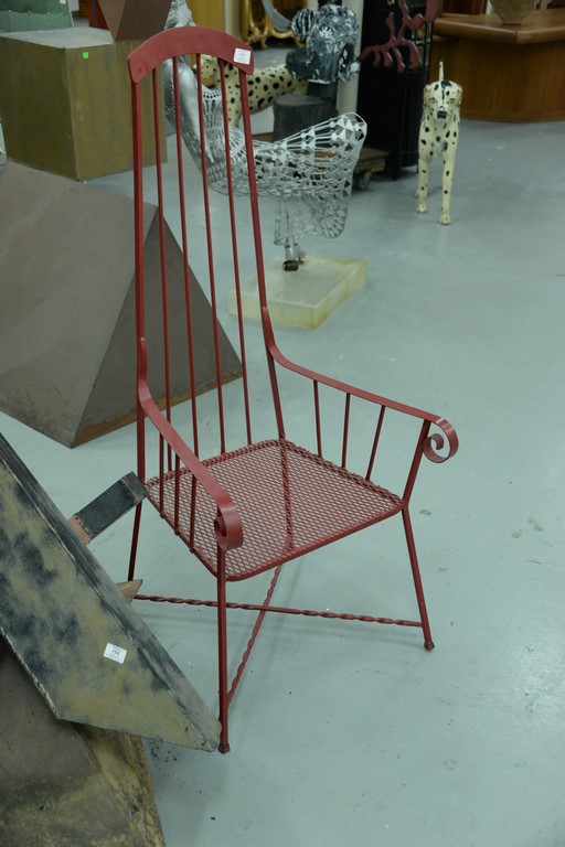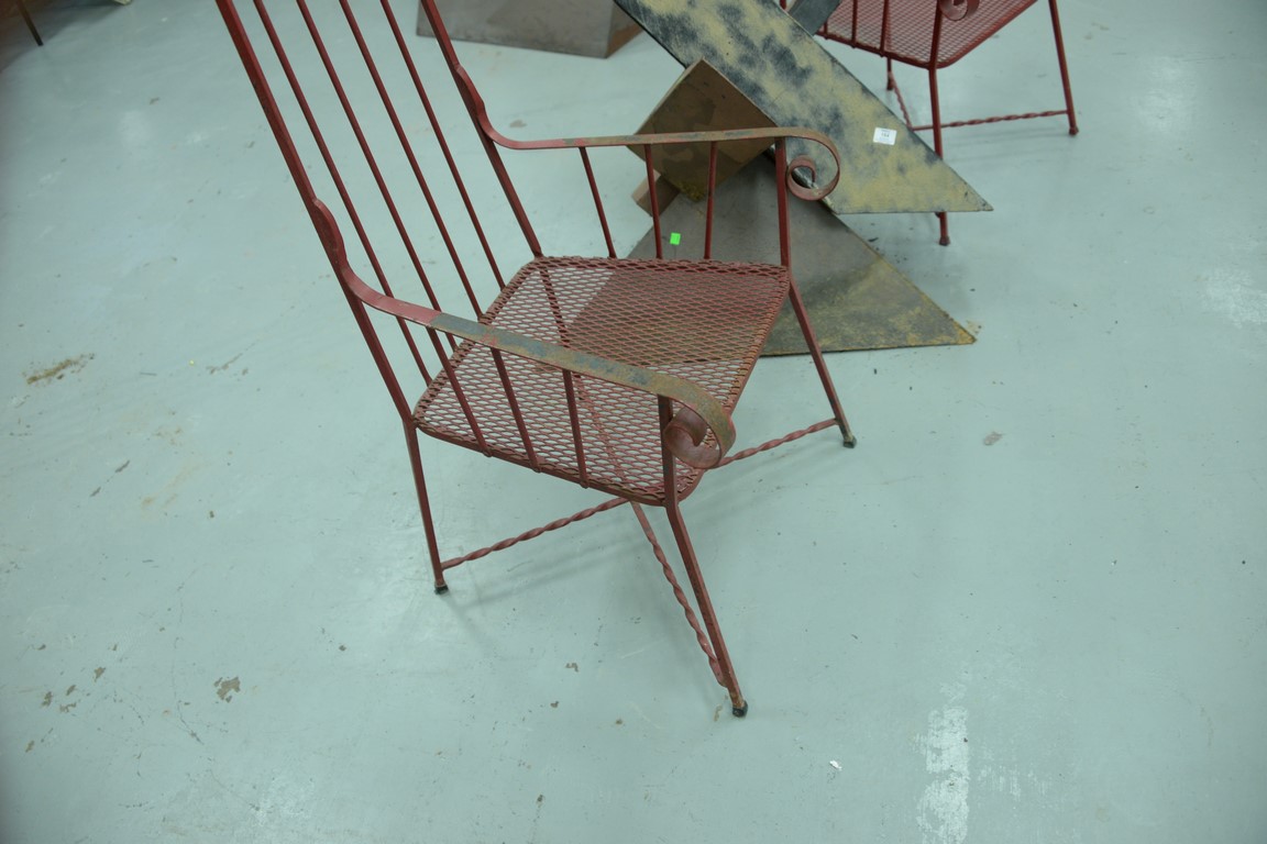Lot 117: Pair of mid-century iron studio outdoor armchairs on twisted cross stretcher bases. height 52 1/4 inches, seat height 14 1/2 inch…